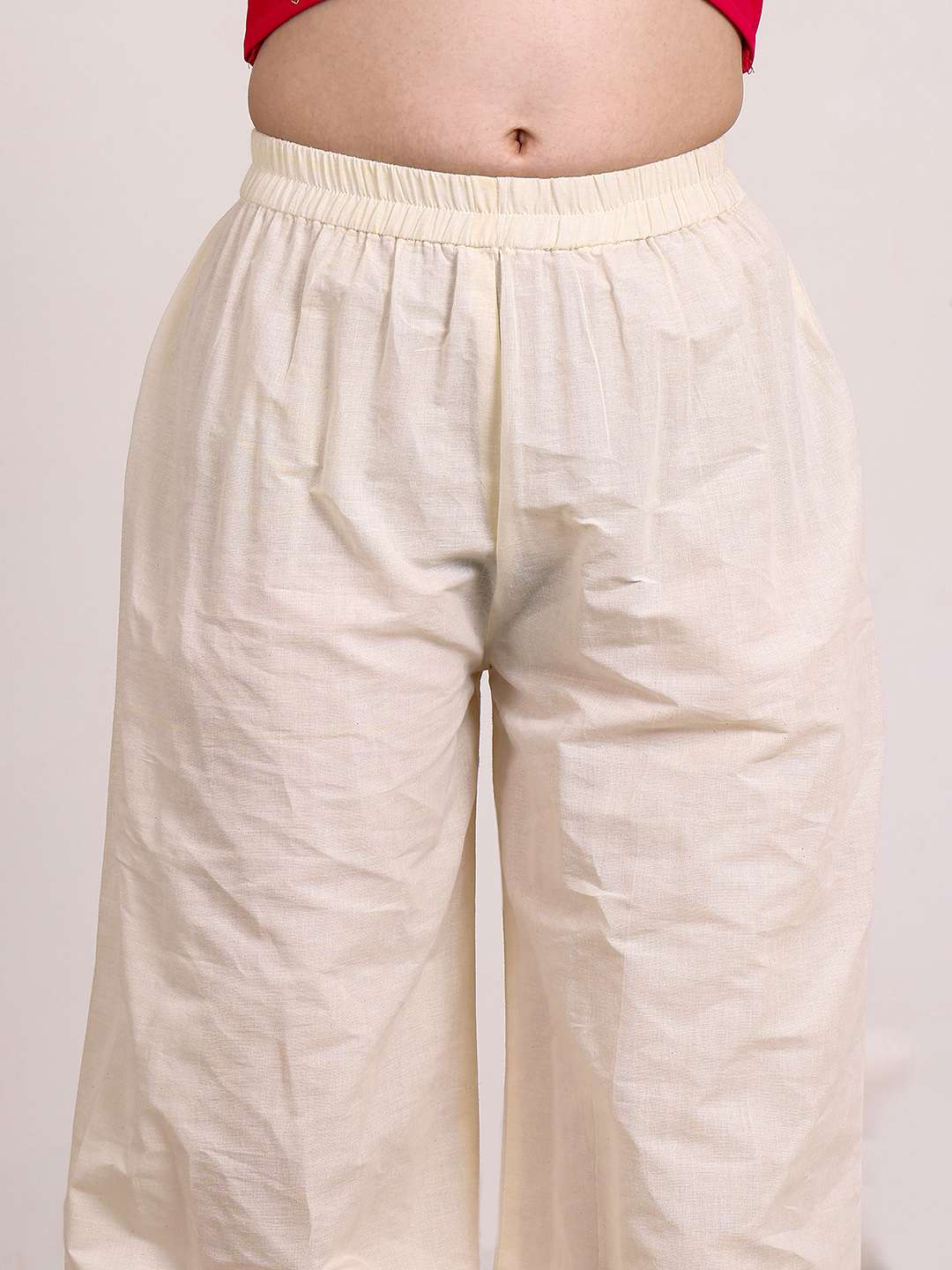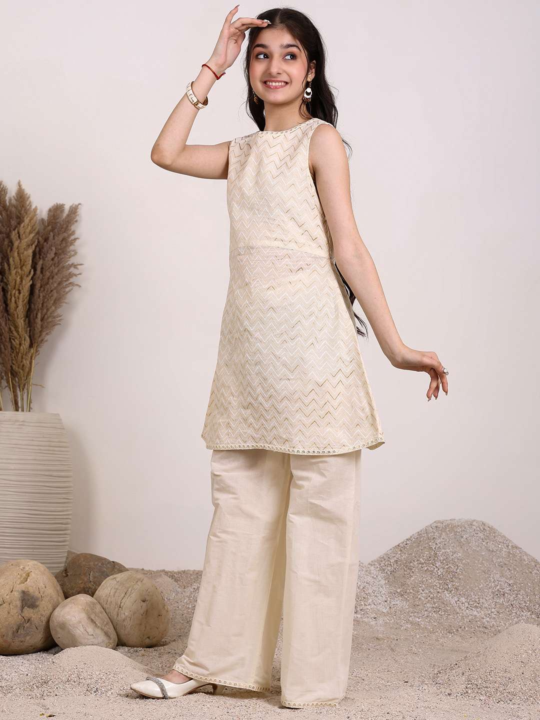 Expertly crafted for everyday wear, this Girls Chevron Embroidered A-Line Kurta With Palazzos is a must-have addition to any wardrobe. The off-white kurta showcases a stunning chevron embroidery in a flattering A-line shape. The kurta is made from a soft and comfortable cotton blend fabric, with a round neck and sleeveless design for a modern look. The matching solid palazzos feature a partially elasticated waistband and slip-on closure for effortless style. Perfect for any occasion, this set offers comfort, style, and versatility. Material & Care Cotton Blend Dry Clean