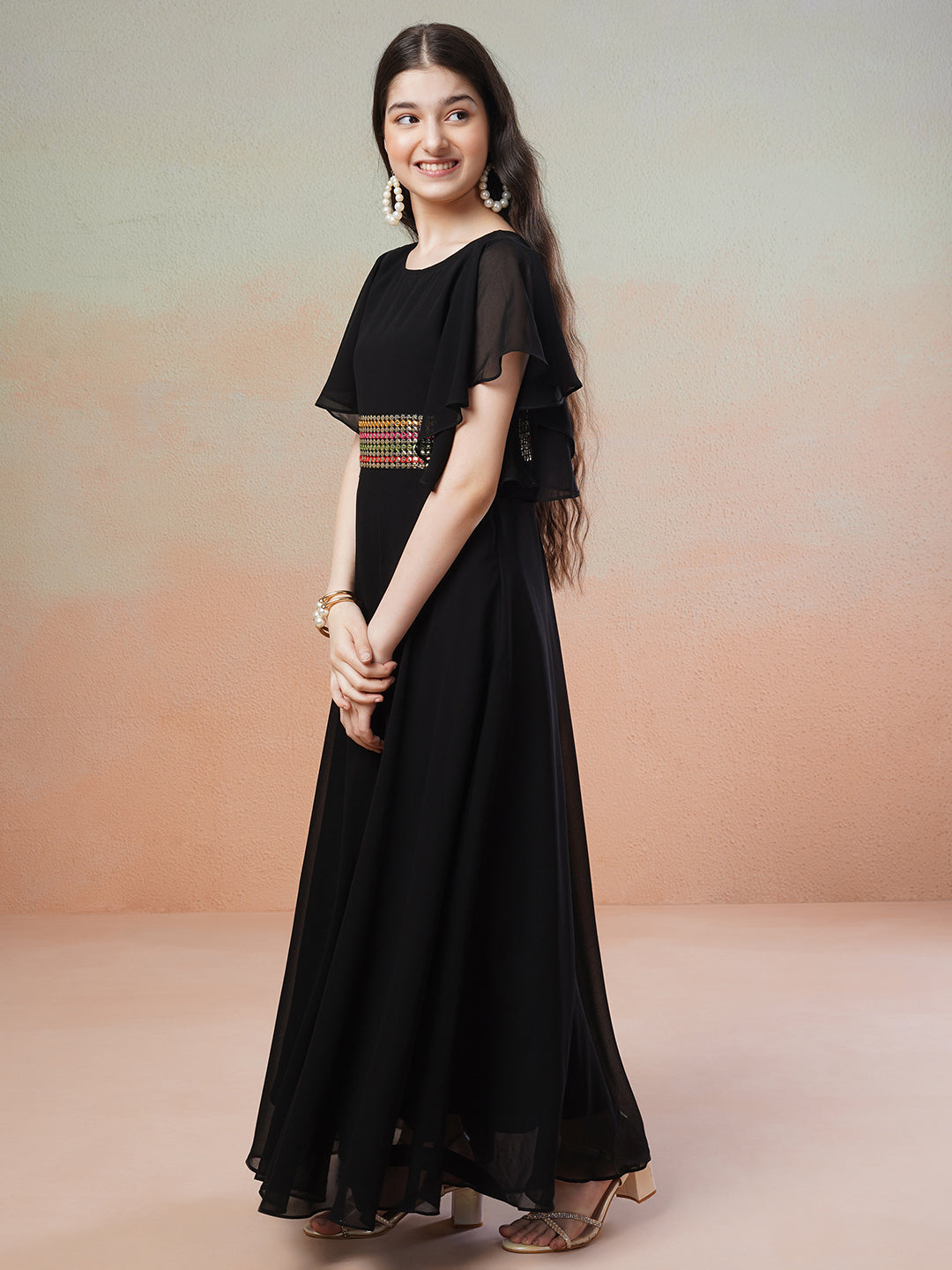 This black and yellow ethnic dress features embellished details, a round neck, and short sleeves. The fit and flare shape and flared hem make for a stylish and comfortable look. Slip on closure adds convenience. Perfect for any occasion.