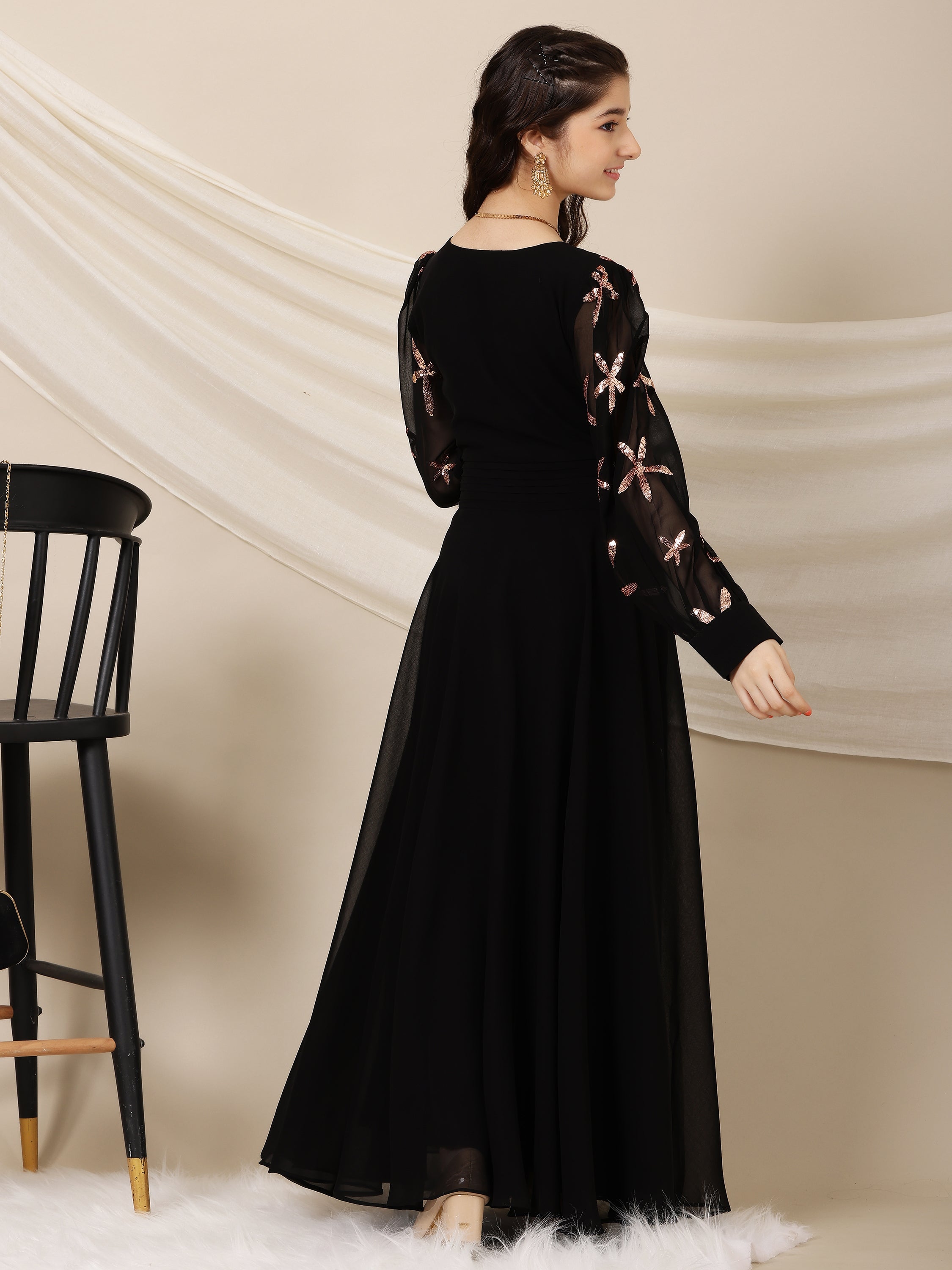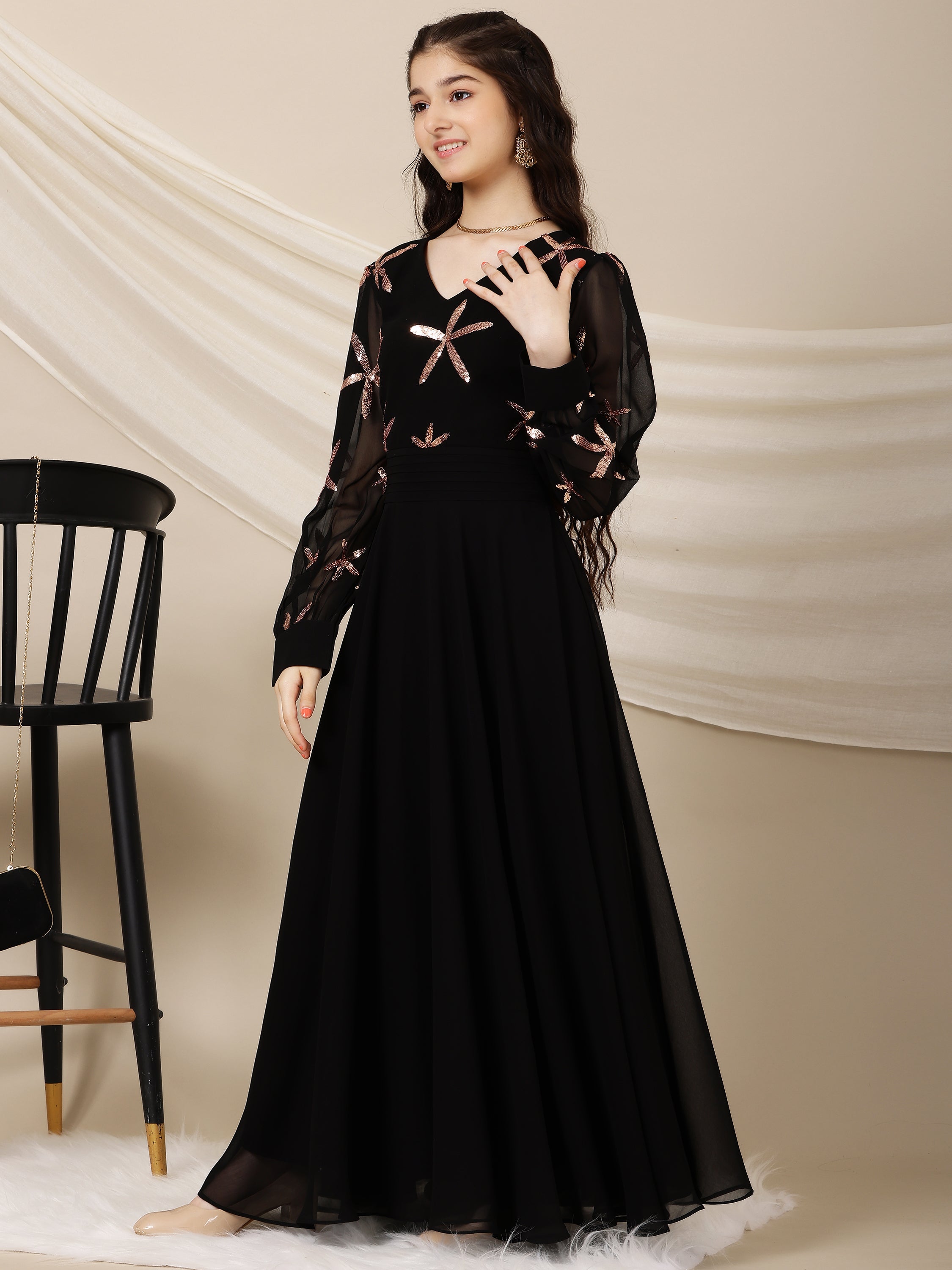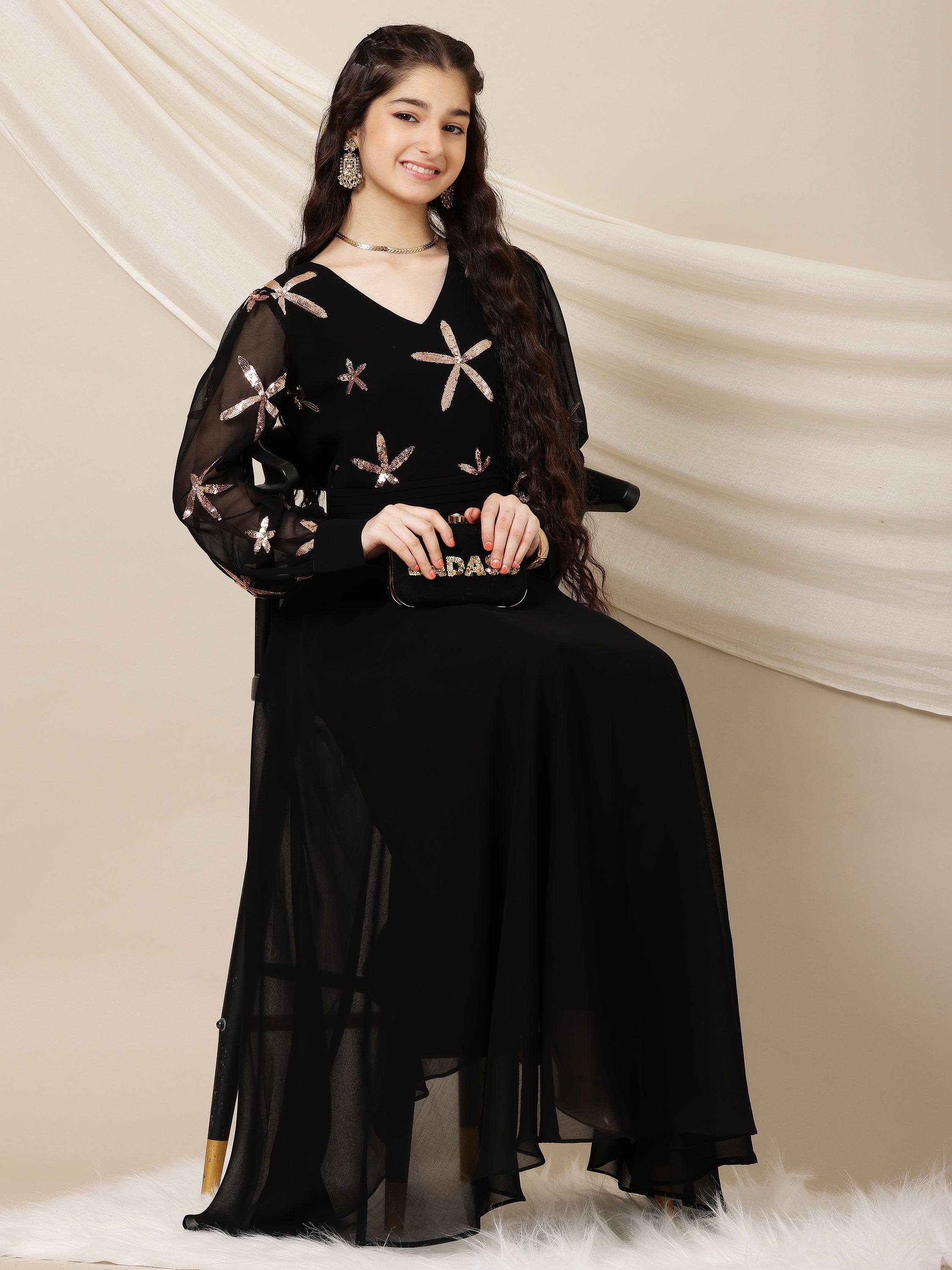 This black ethnic dress is perfect for girls with its embroidered design and A-line shape. The V-neck and long sleeves add a touch of elegance while the flared hem allows for comfortable movement. Slip on this dress for a stylish and effortless look.