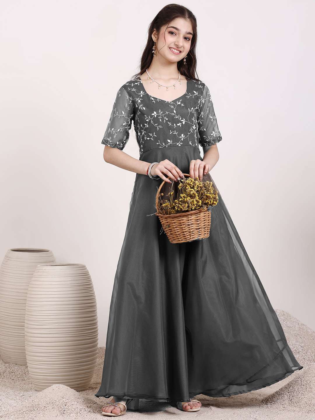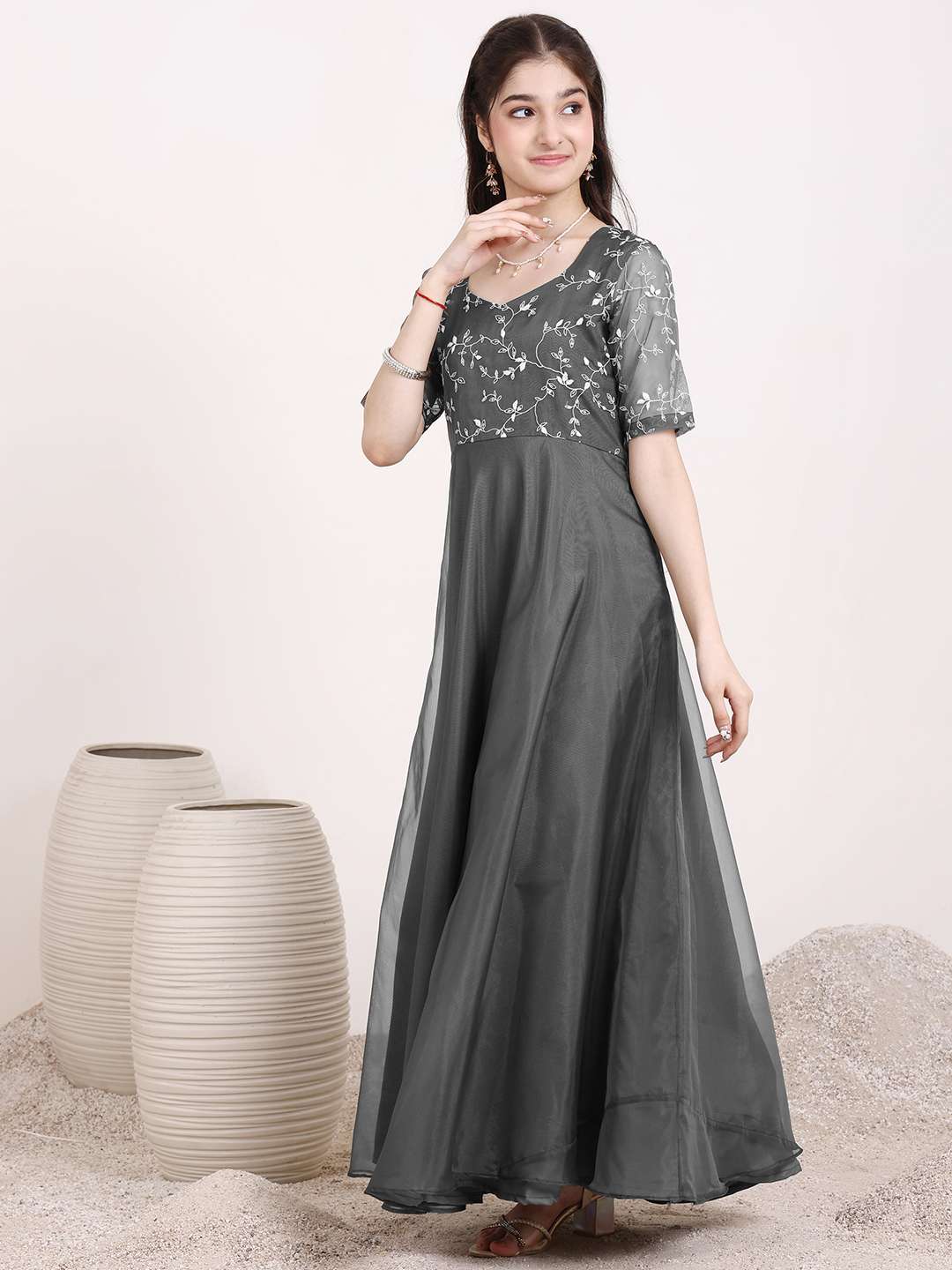 Experience the perfect blend of comfort and style with our Girls Embroidered Ethnic Maxi Dresses. The grey color adds a touch of elegance to the intricately embroidered fabric, while the maxi shape and sweetheart neckline lend a flattering fit. The short sleeves and flared hem add a playful touch, and the zip closure ensures a secure fit. Elevate any occasion with this dress.