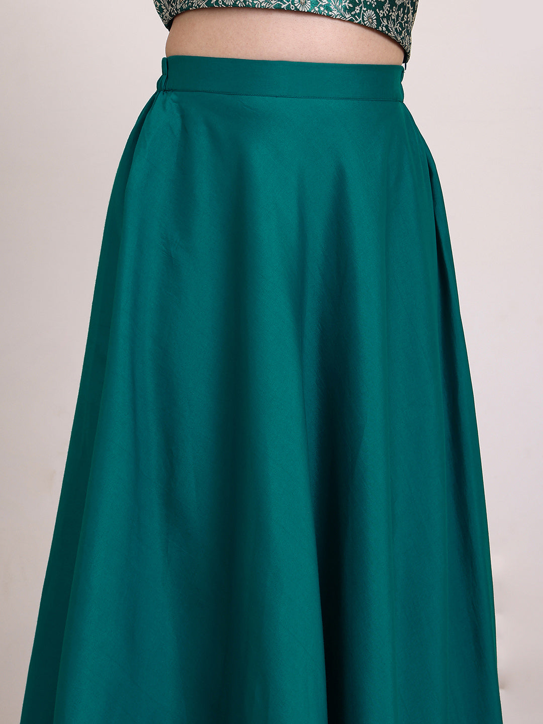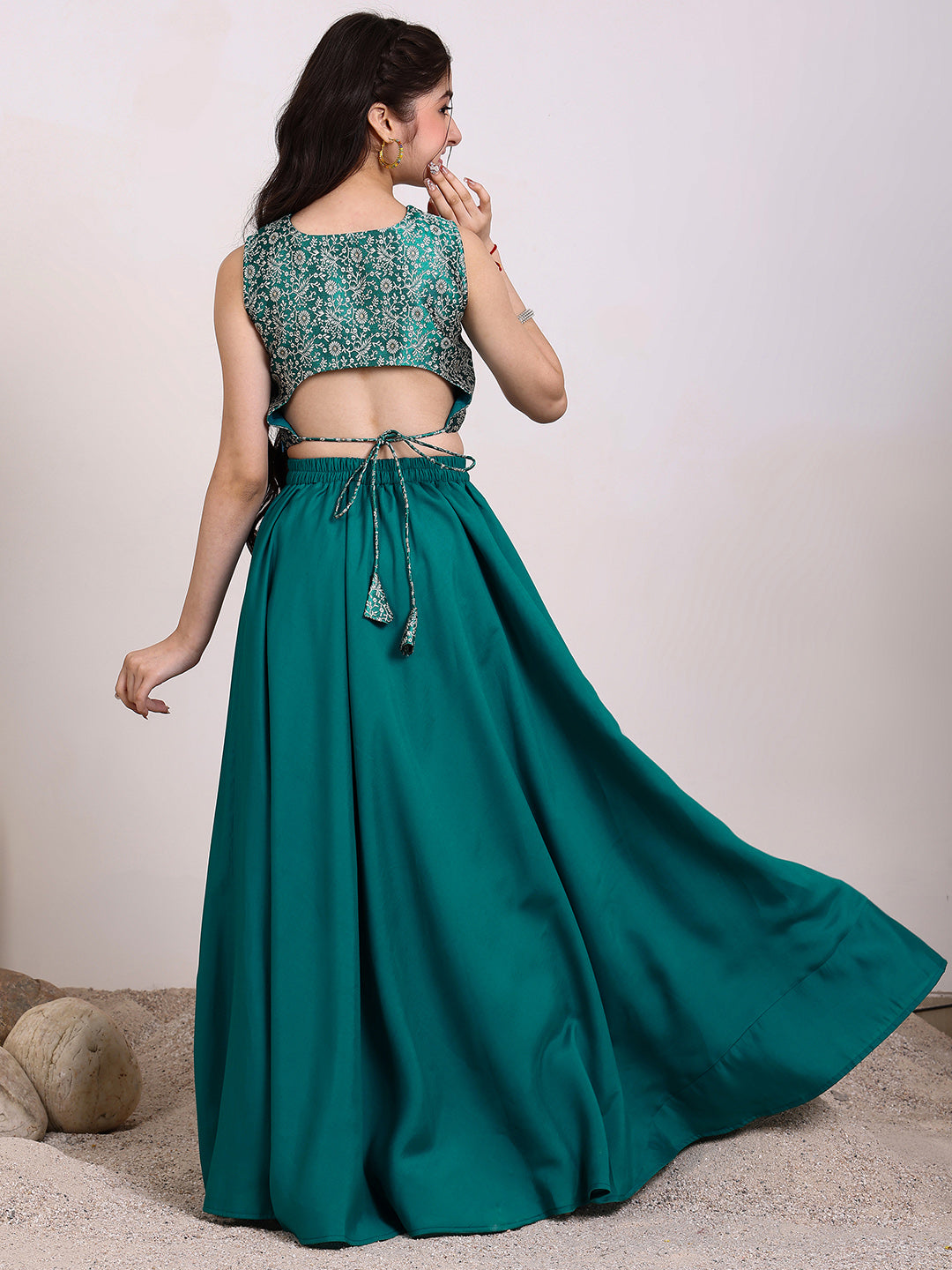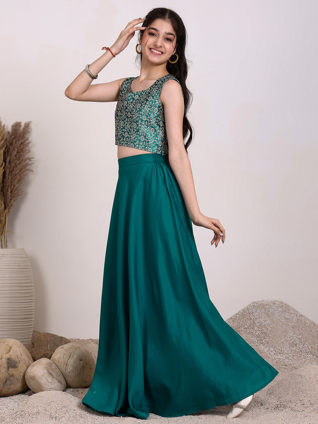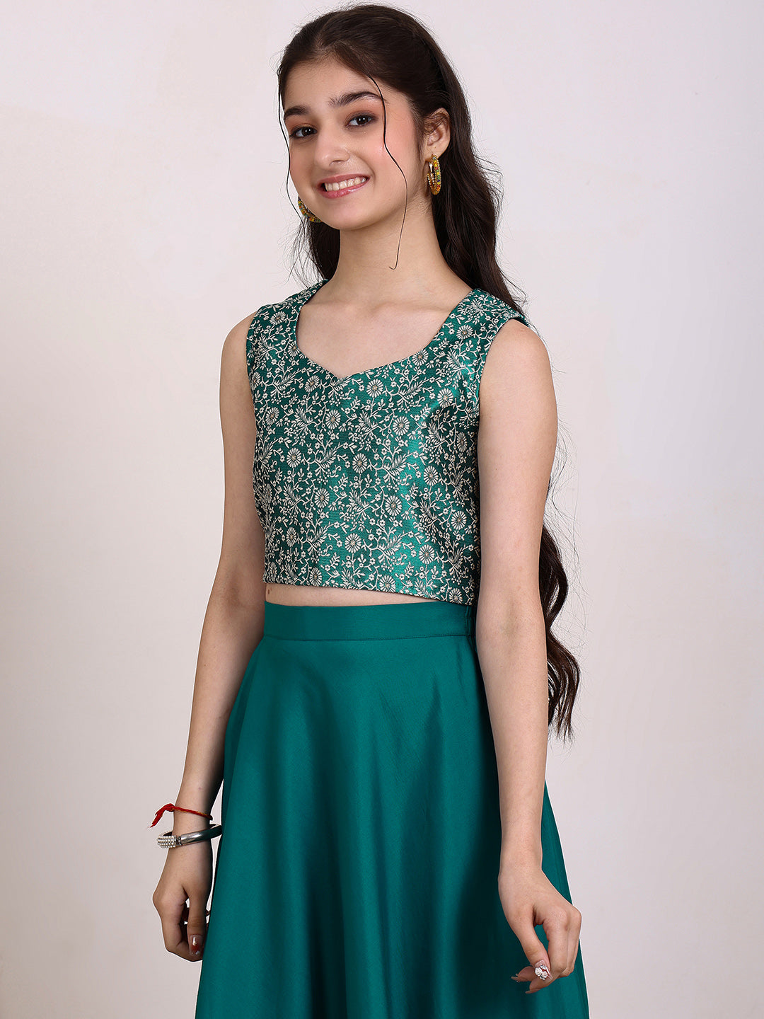 This Girls Embroidered Ready to Wear Lehenga & Blouse set features a stunning teal and white color combination with intricate zari embroidery. The blouse is sleeveless and easy to slip on, while the lehenga has a flared hem for a graceful look. The set also includes a teal and white dupatta with a beautiful border. Elevate your little girl's wardrobe with this elegant and hassle-free outfit.