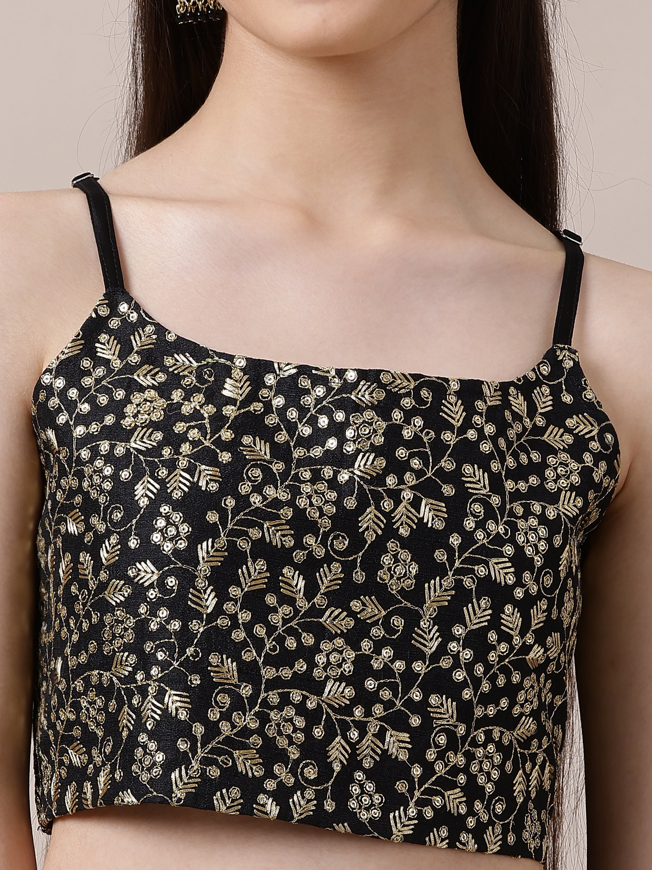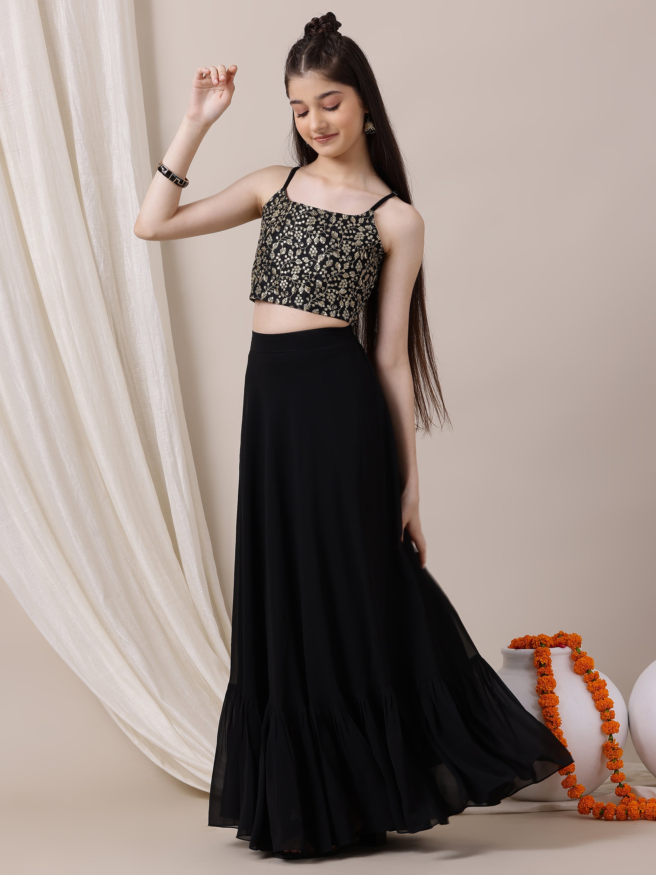 Expertly crafted with intricate embroidery and sparkling sequins, this Girls Embroidered Sequinned Ready to Wear Lehenga will make your little one stand out at any occasion. The top is made of a luxurious silk blend with a comfortable crepe inner, while the bottom is made of lightweight georgette with a crepe inner. With its easy slip-on closures and flared hem, this lehenga offers both style and convenience. Complete the look with the gorgeous black and gold-toned dupatta with a delicate border. Dry cleaning is recommended for maintenance, ensuring this lehenga stays in pristine condition for future wear.