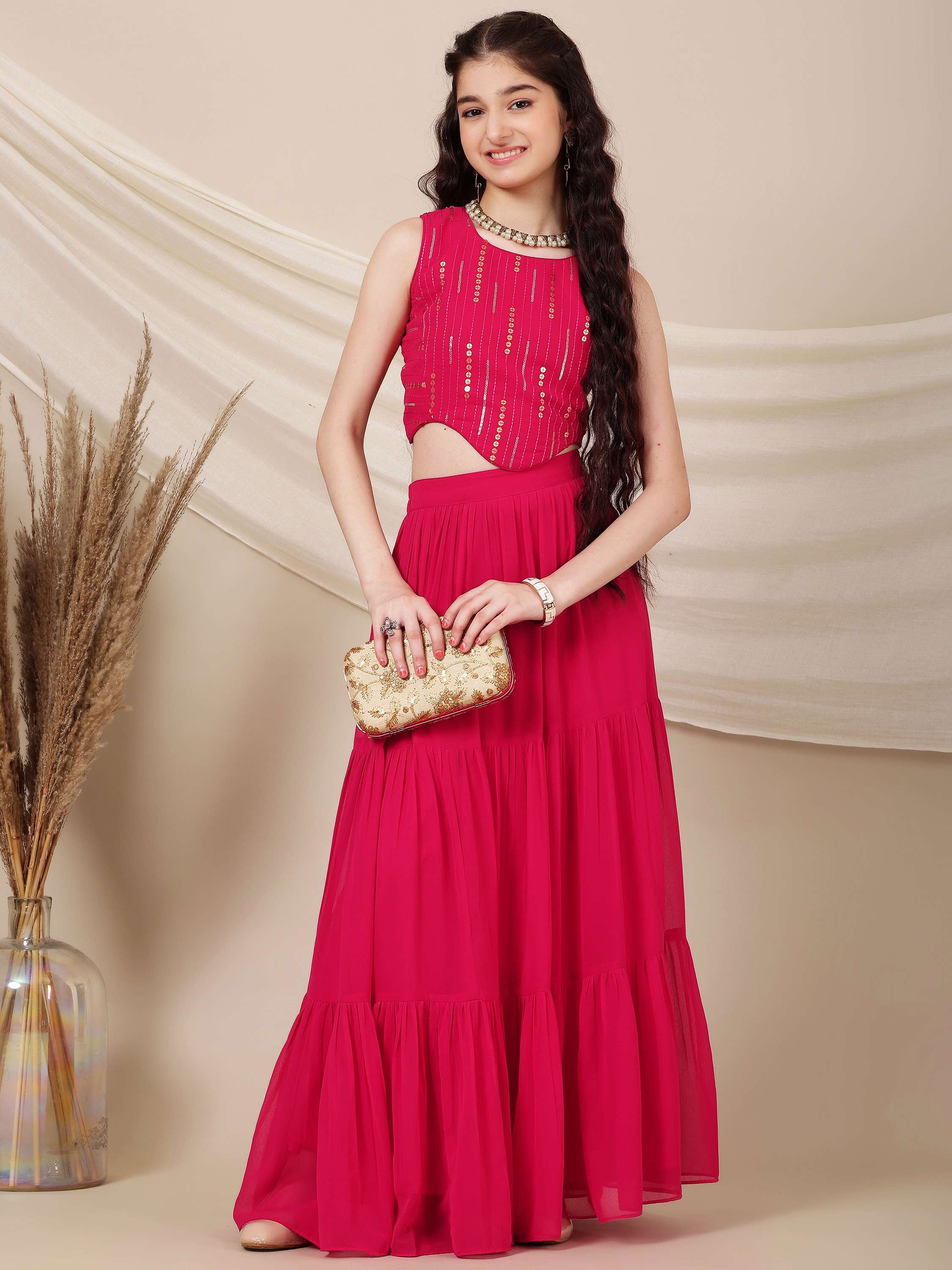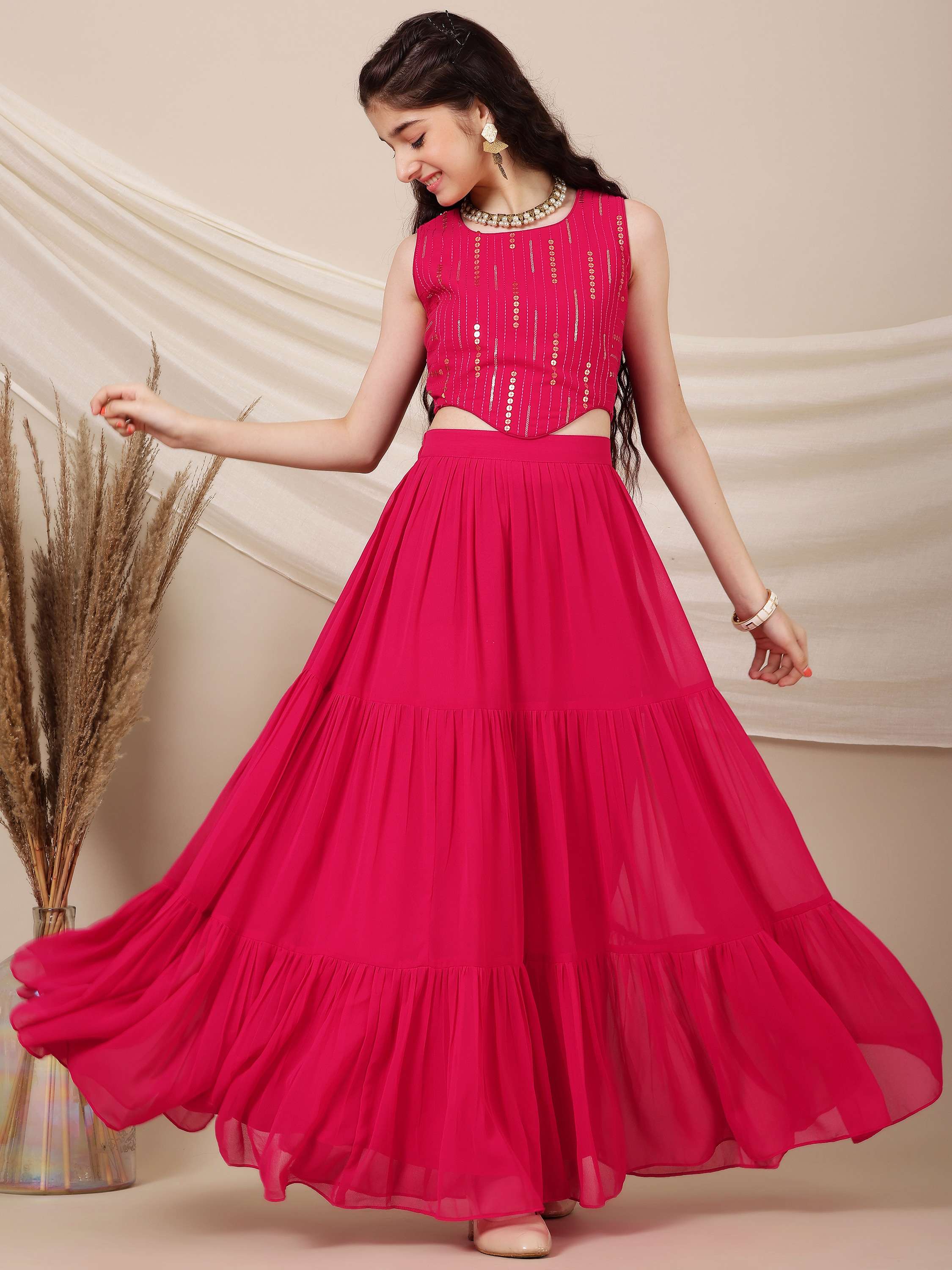 As a product expert, I am proud to introduce our Girls Embroidered Sequinned Ready to Wear Lehenga. This stunning traditional outfit features a magenta embroidered lehenga choli with sequins for a touch of sparkle. The ready to wear blouse has a round neck and sleeveless design for comfort and convenience, while the solid magenta lehenga and dupatta complete the elegant and timeless look. Perfect for any special occasion.