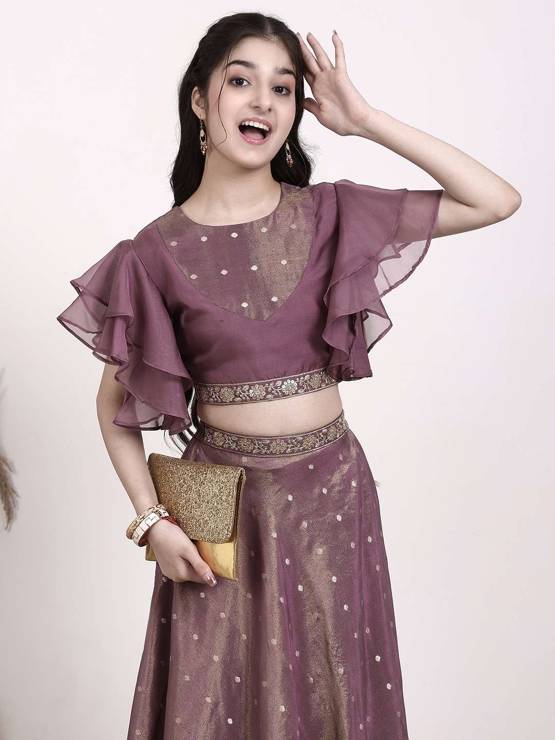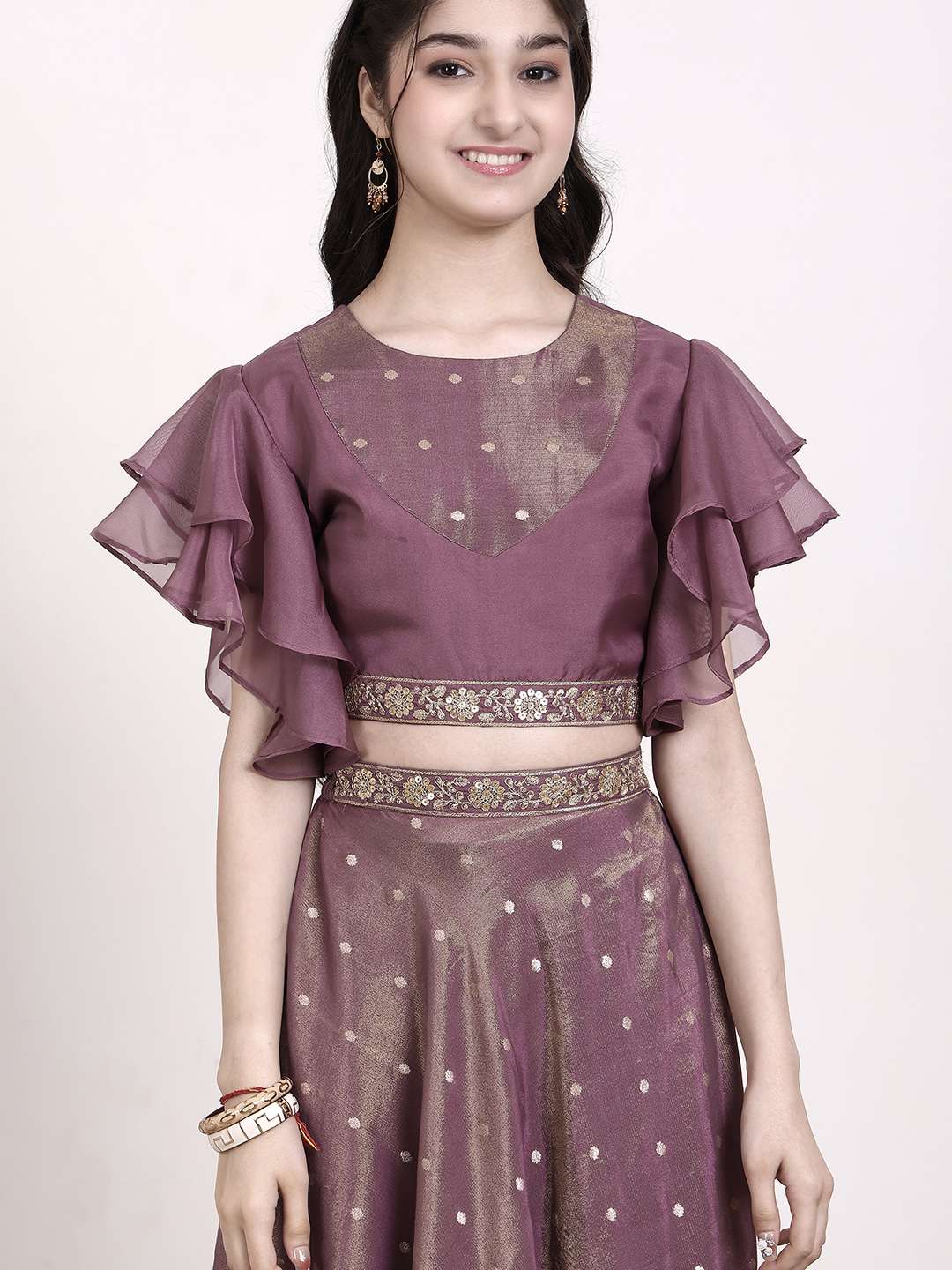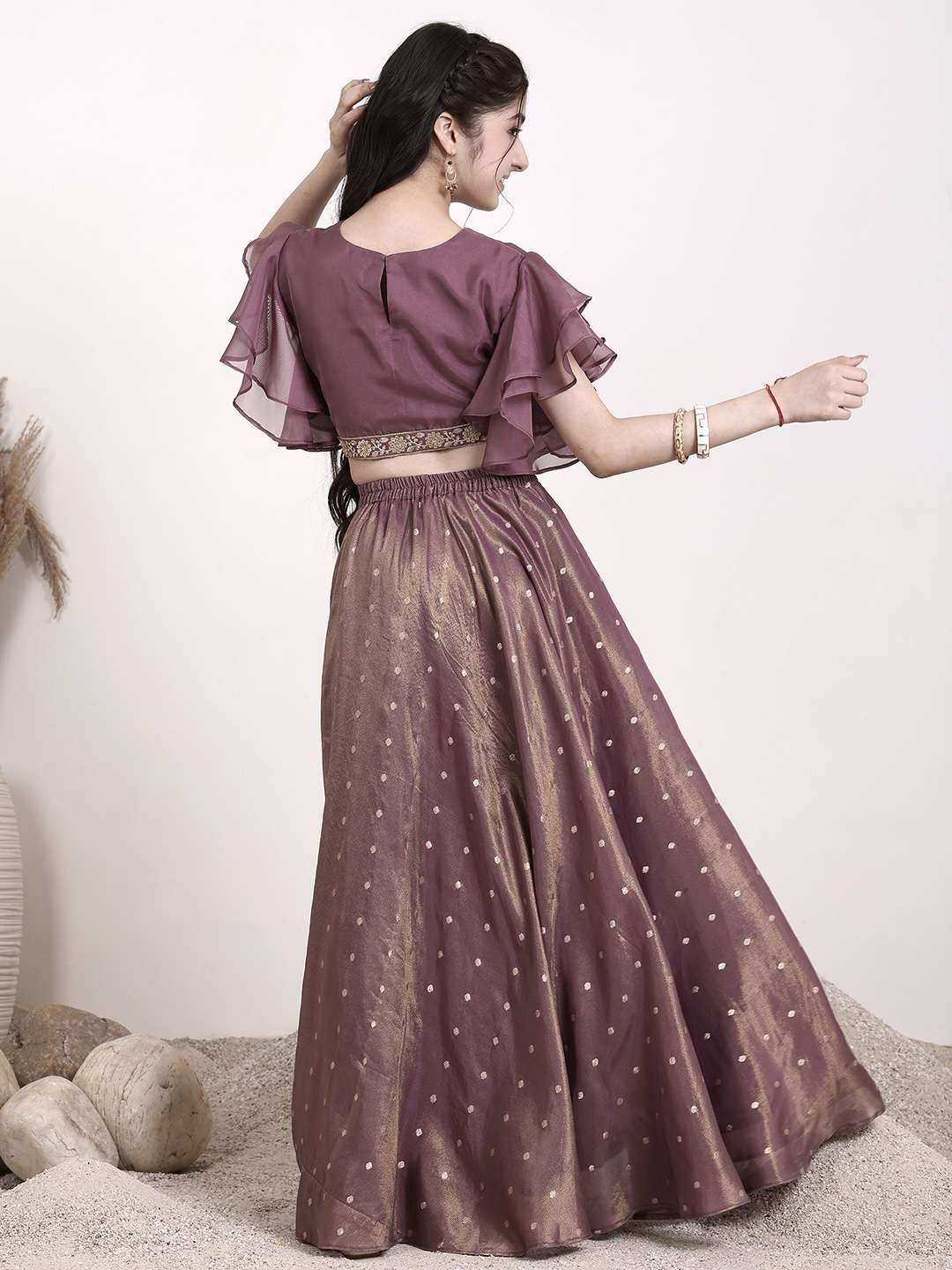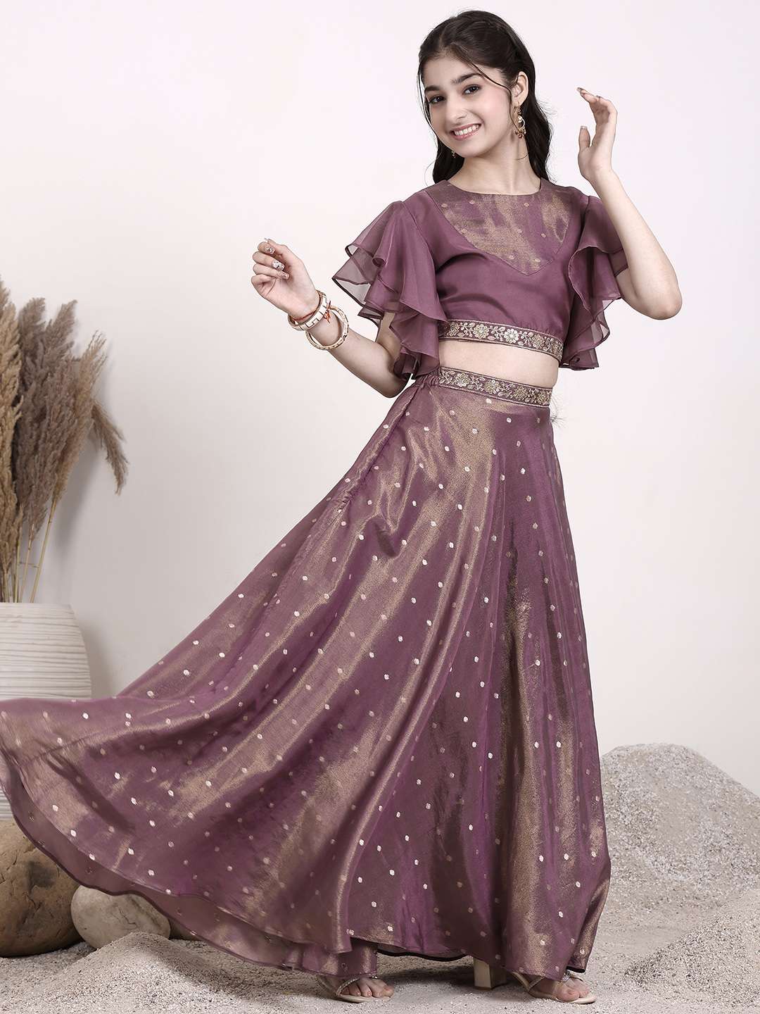 Effortlessly elegant and eye-catching, this Girls Sequinned Lehenga & Blouse set features exquisite mauve and gold embroidery on the lehenga and blouse. The ready-to-wear design includes a comfortable round neck and short sleeves on the blouse, while the lehenga boasts a flattering flared hem. Perfect for special occasions, this is a must-have addition to any little girl's wardrobe.