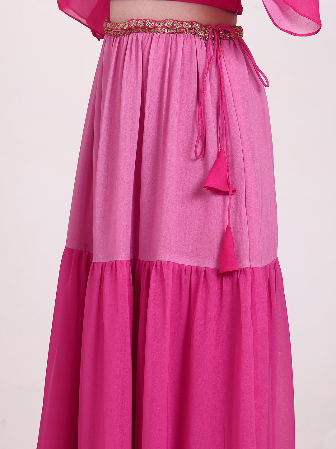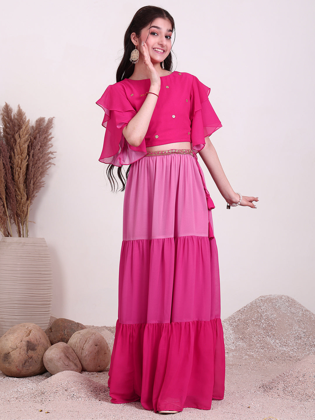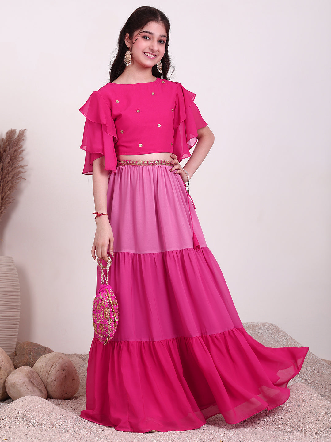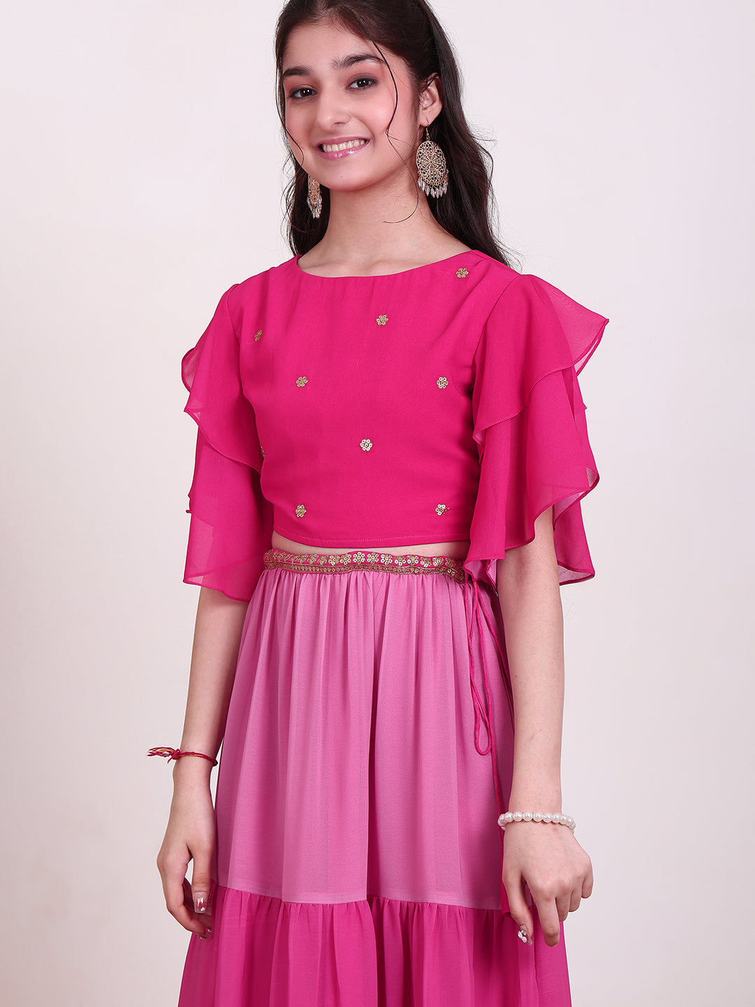 Pink and magenta embroidered ready to wear blouse, has a round neck, short sleeves, pink and magenta solid ready to wear lehenga, has slip-on closure, flared hem