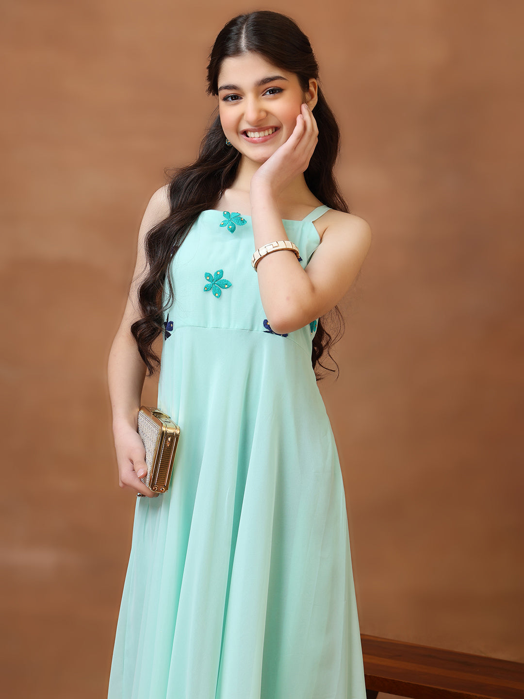 Elevate your girl's ethnic wardrobe with this stunning green A-line dress. Featuring delicate floral prints and elegant shoulder straps, this sleeveless design offers a graceful silhouette perfect for festive occasions and celebrations.