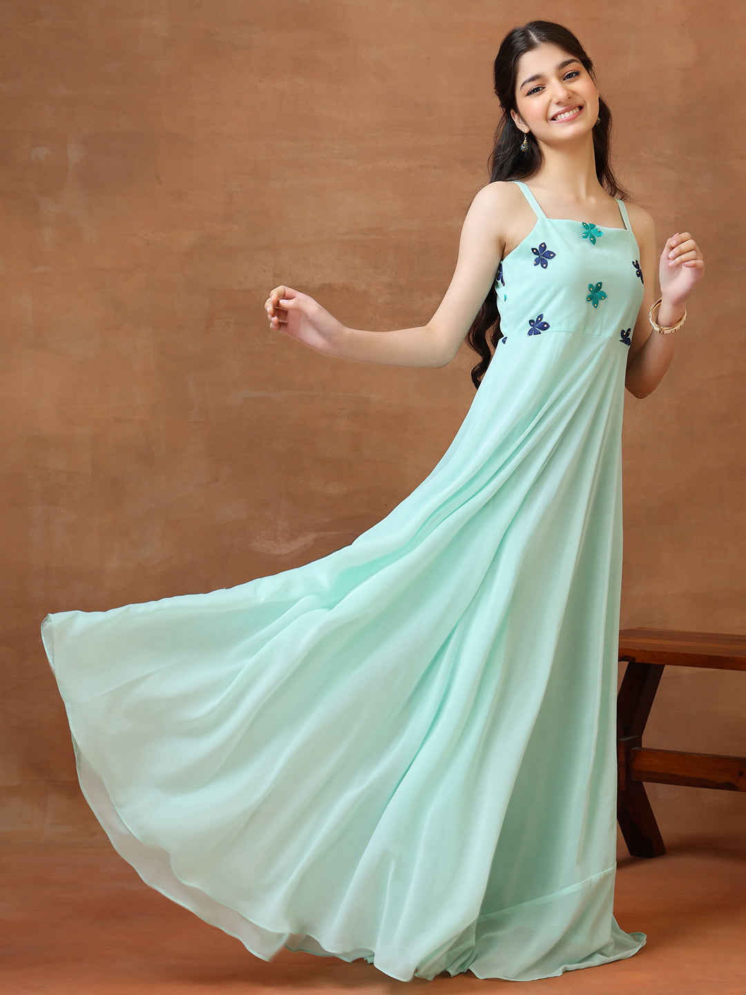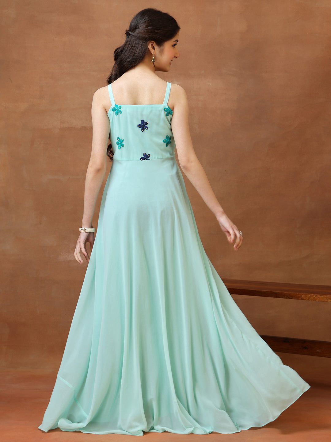 Crafted from premium georgette fabric, this dress drapes elegantly and feels soft against the skin. The material provides a sophisticated look ideal for ethnic occasions. Dry clean recommended to maintain the dress's vibrant colors and intricate details.