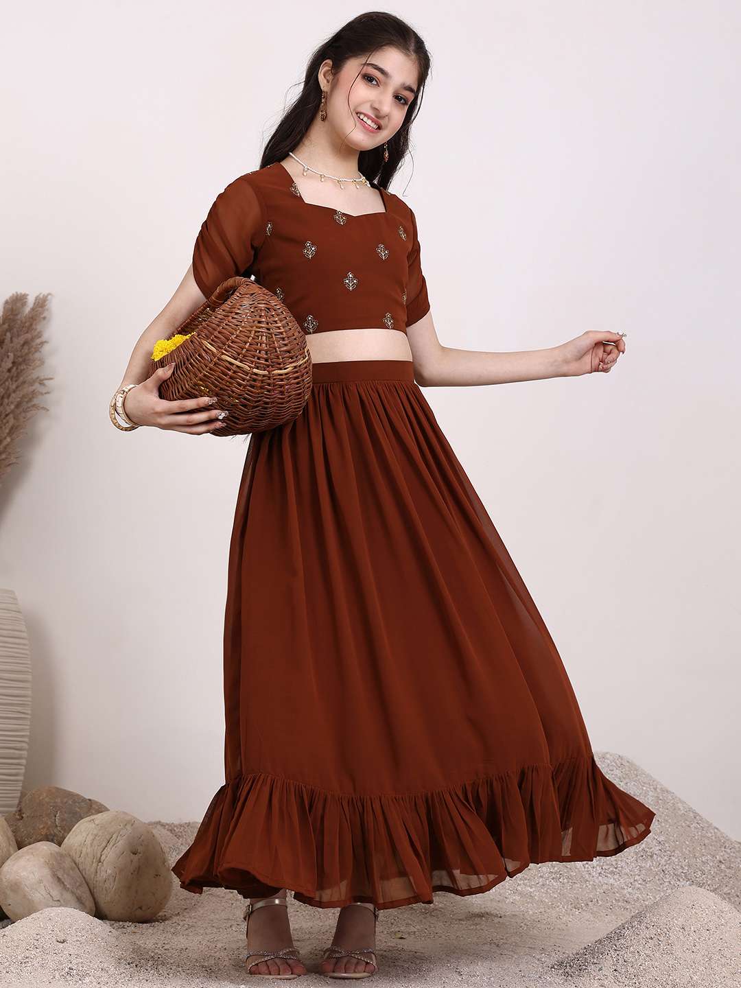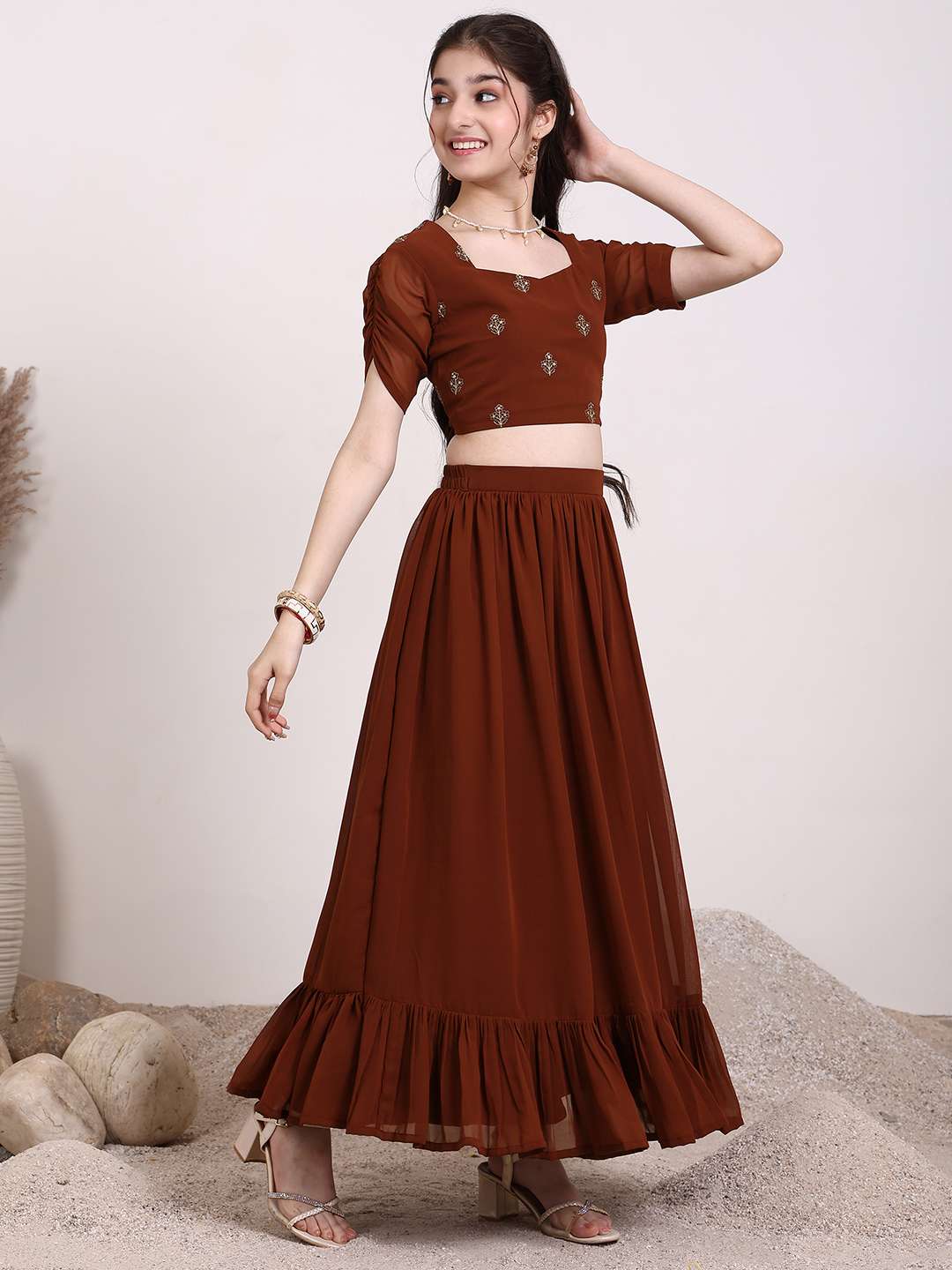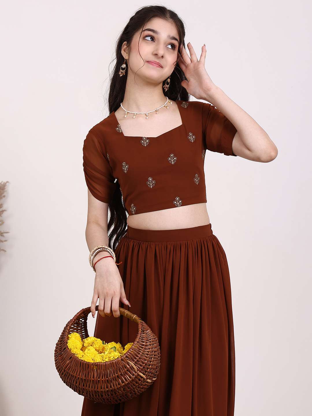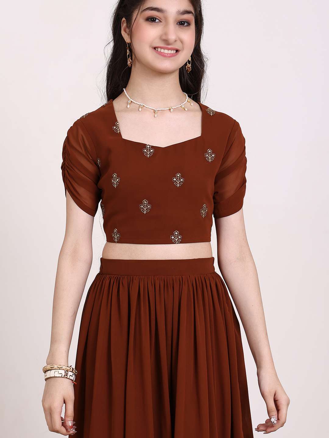 Brown embroidered ready to wear blouse, has a square neck, short sleeves, brown solid ready to wear lehenga, has slip-on closure, flared hem