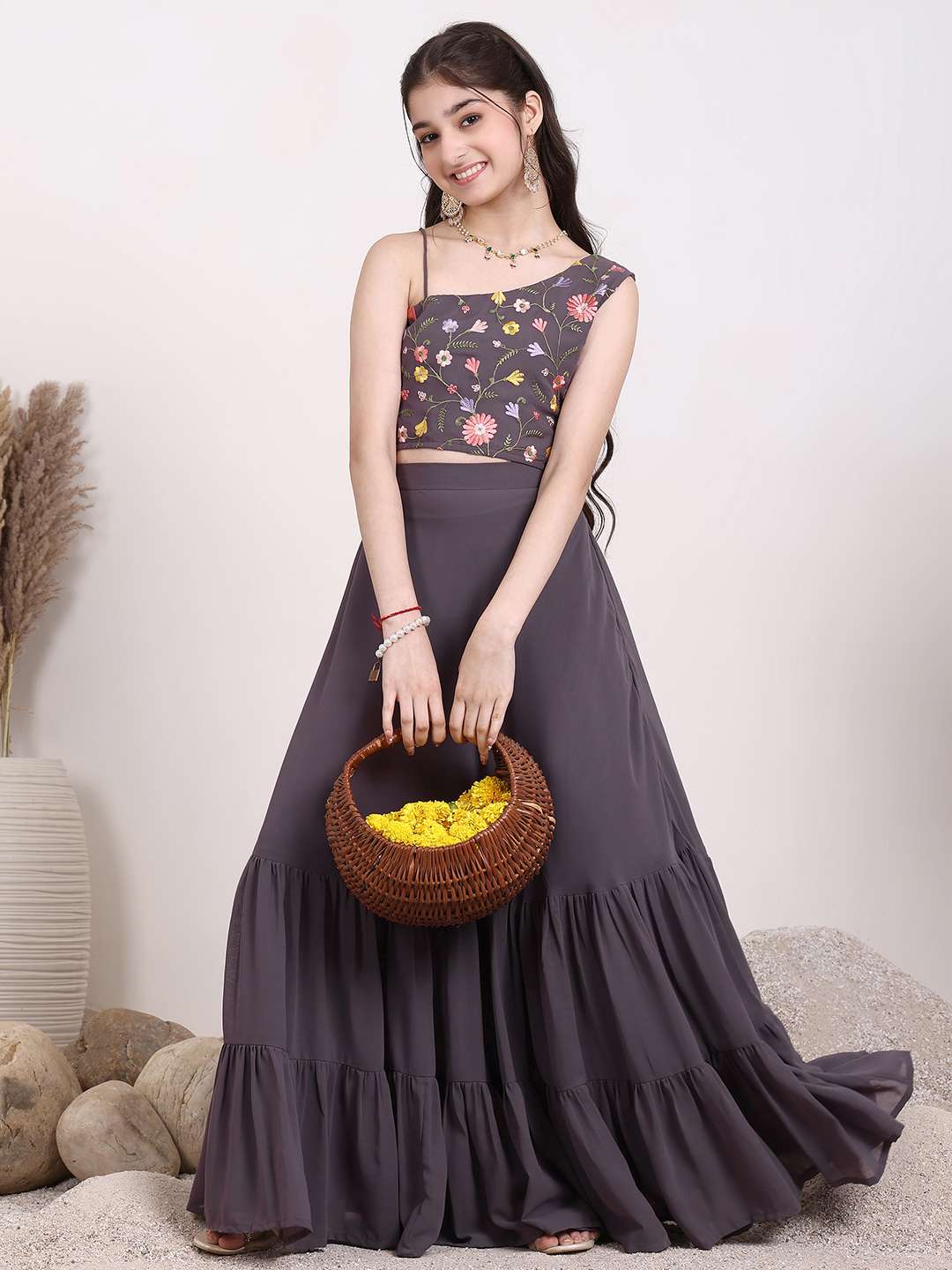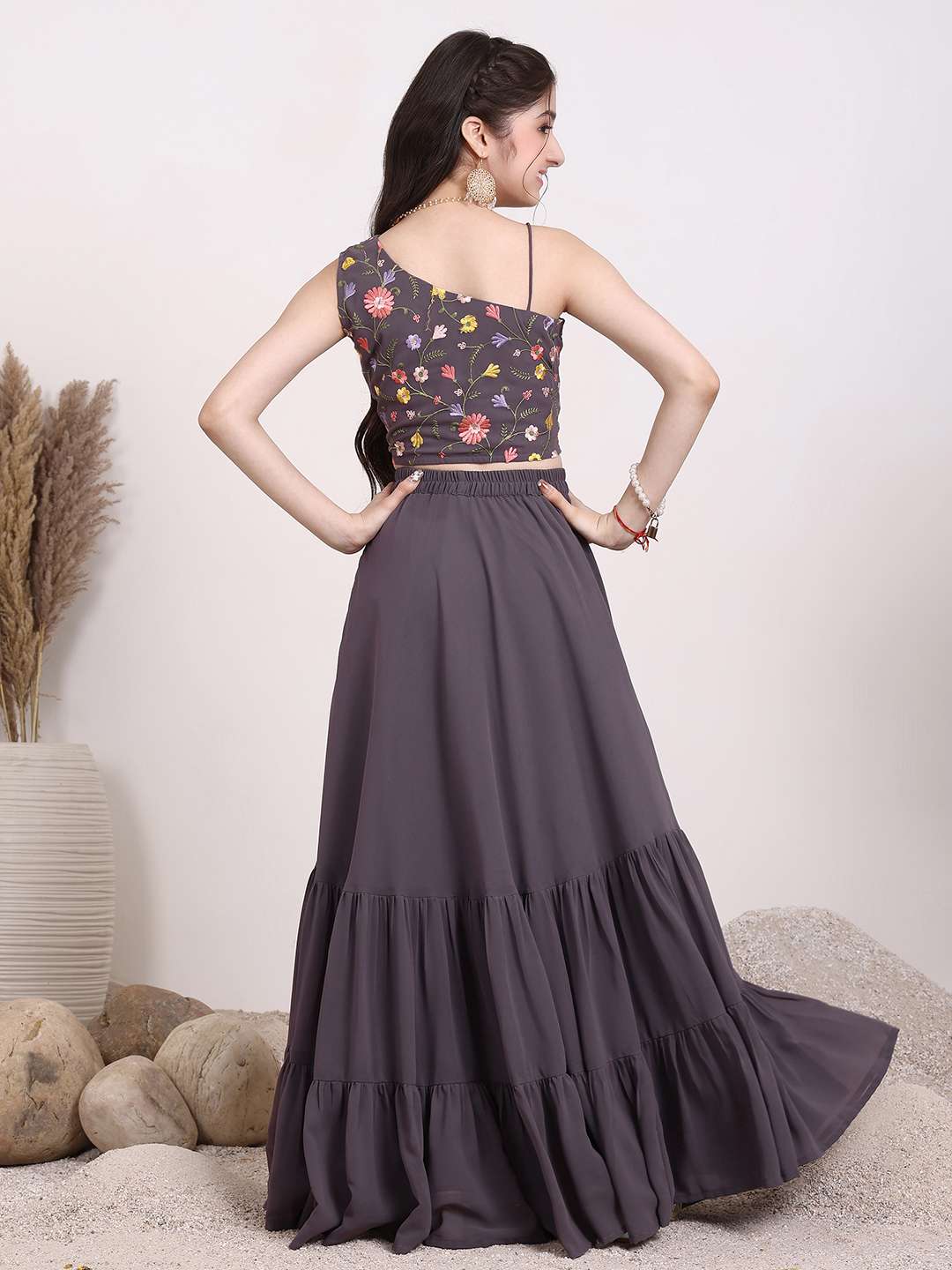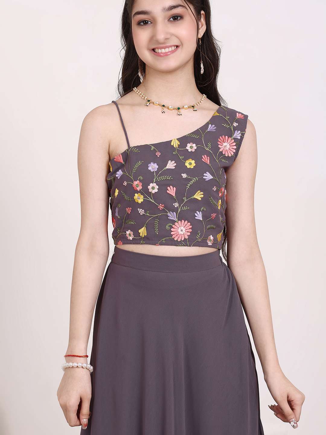 Mauve embroidered ready to wear blouse, has a one shoulder, sleeveless, mauve solid ready to wear lehenga, has slip-on closure, flared hem