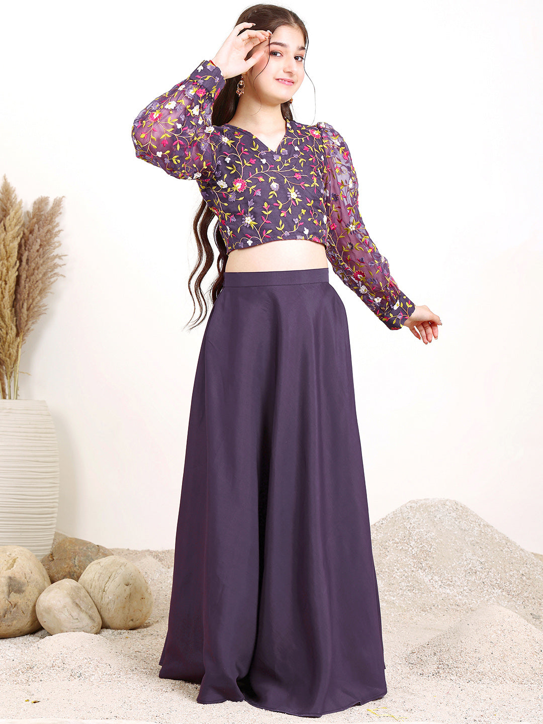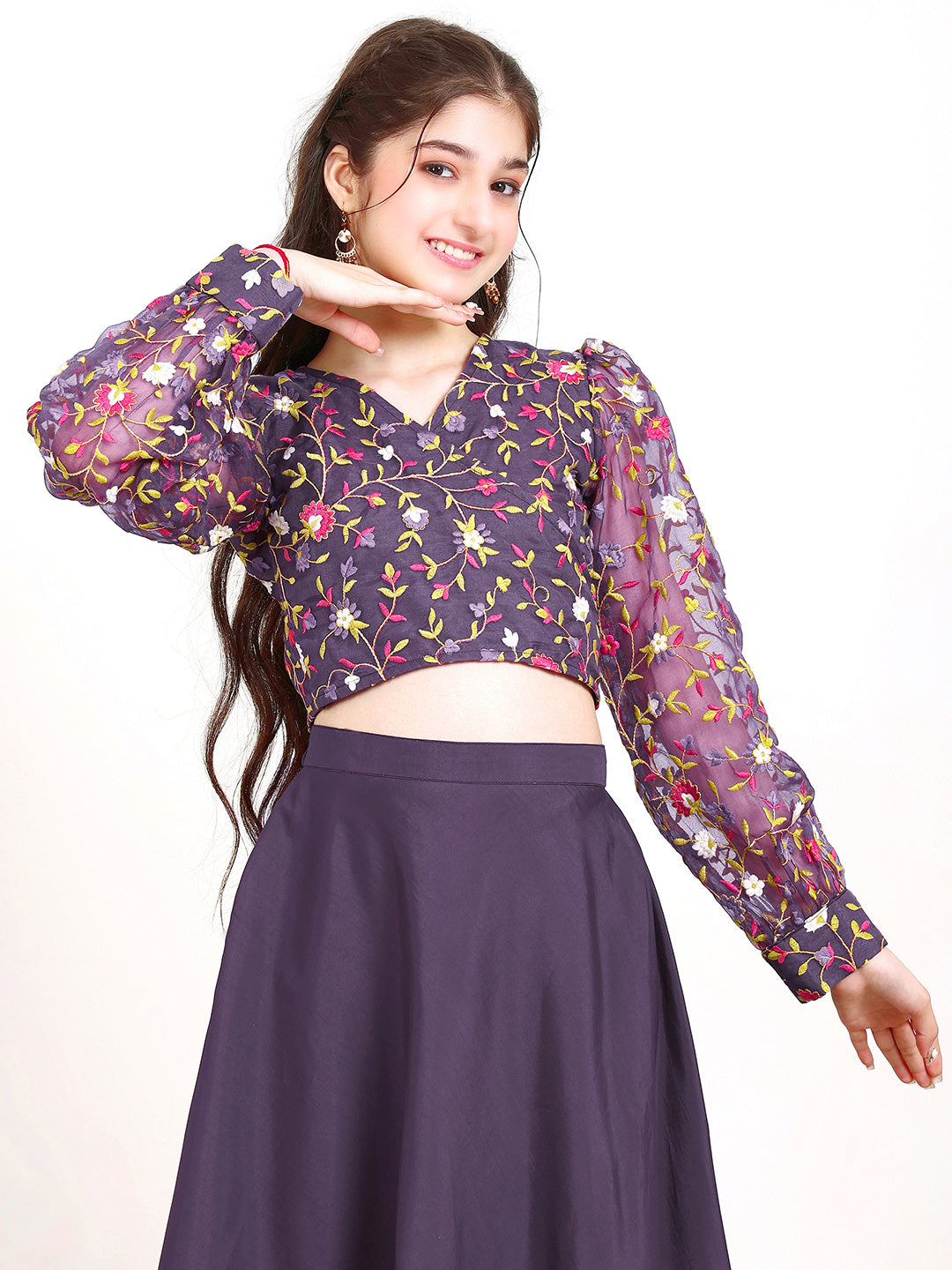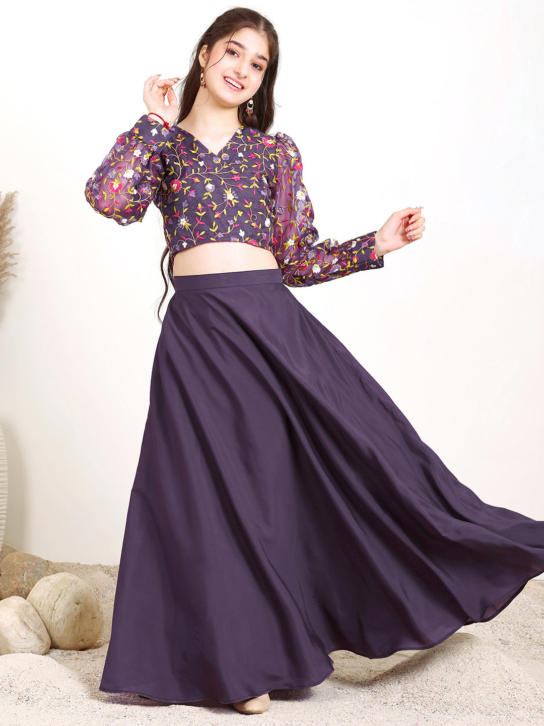 This girls embroidered lehenga and blouse set showcases beautiful purple and yellow thread work. The ready-to-wear design features a v-neck blouse with long sleeves, a slip-on purple and yellow lehenga, and a matching dupatta with intricate border details. Perfect for any formal occasion, this set offers a stylish and effortless look for your little one.