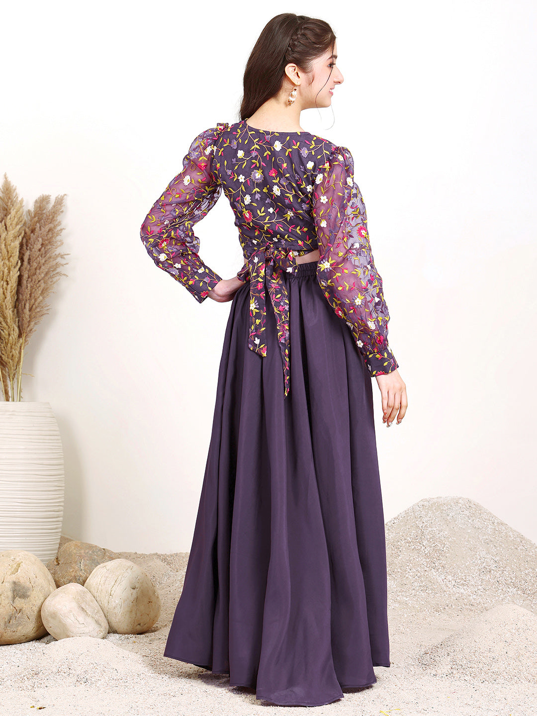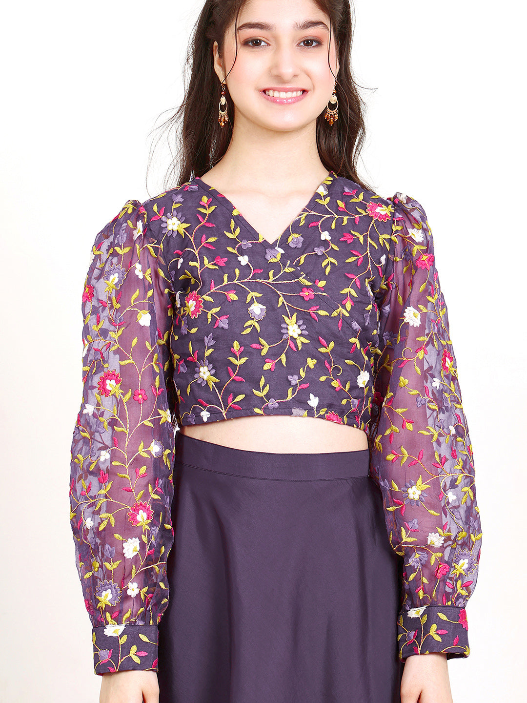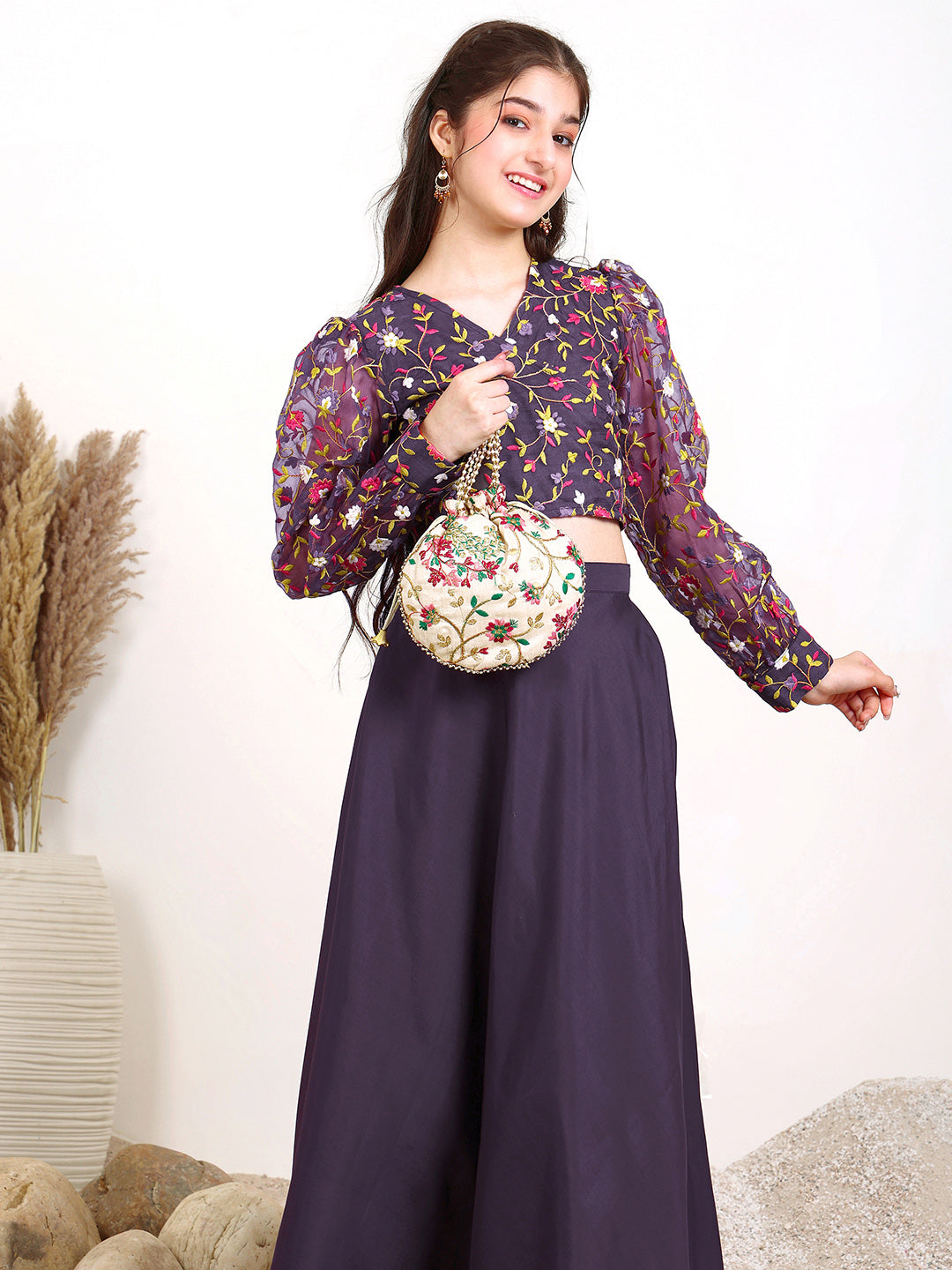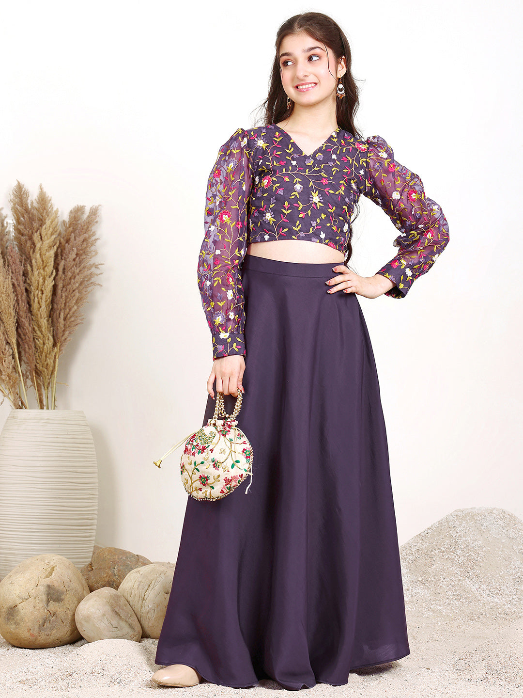 This girls embroidered lehenga and blouse set showcases beautiful purple and yellow thread work. The ready-to-wear design features a v-neck blouse with long sleeves, a slip-on purple and yellow lehenga, and a matching dupatta with intricate border details. Perfect for any formal occasion, this set offers a stylish and effortless look for your little one.