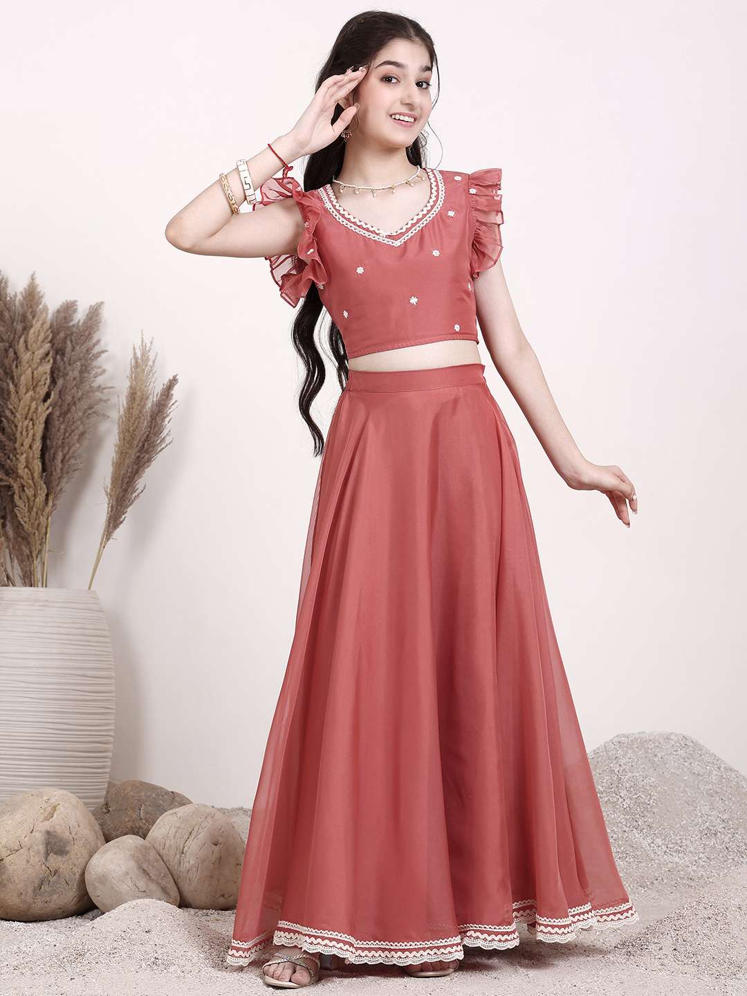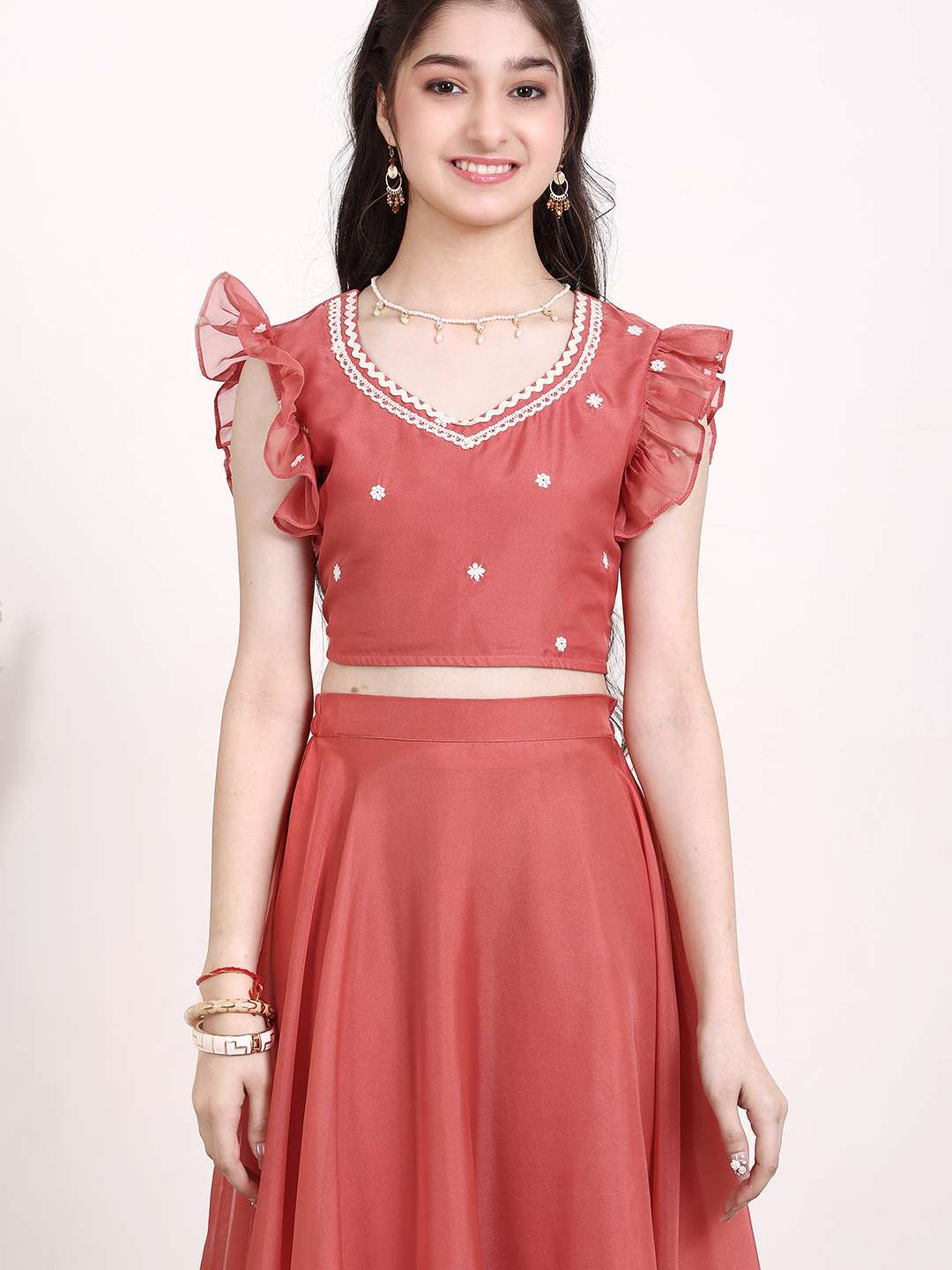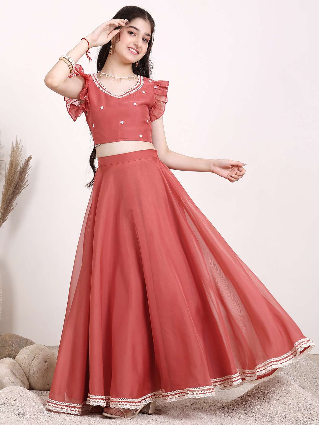 This ready to wear lehenga and blouse set features a beautiful rust and white embroidered design, showcasing expertly crafted thread work. The v-neck and short sleeves of the blouse add a touch of elegance to the ensemble. With a slip-on closure and flared hem, the lehenga offers both comfort and style. Complete the traditional look with the rust and white dupatta, featuring a complementary border. Perfect for any special occasion.