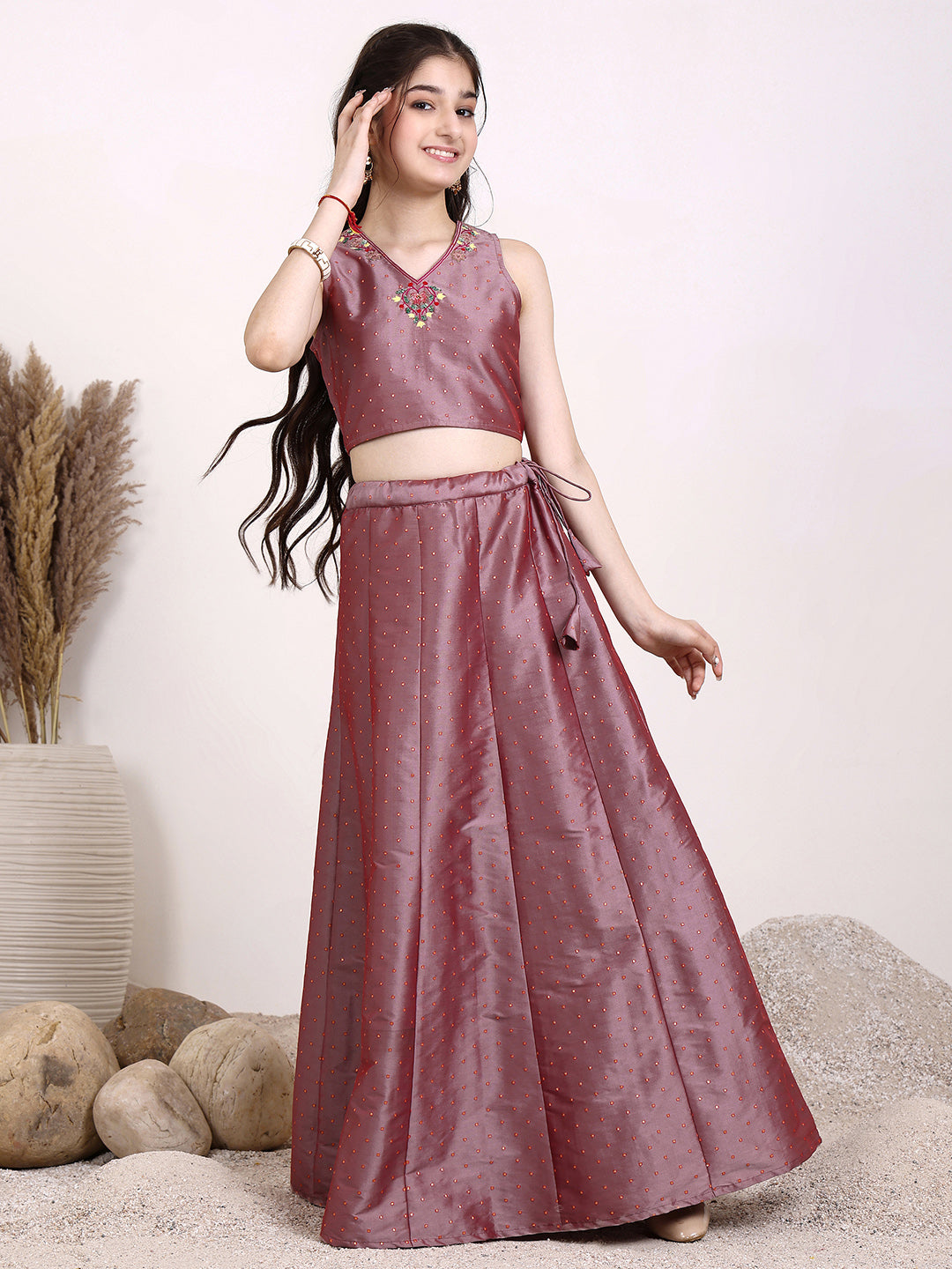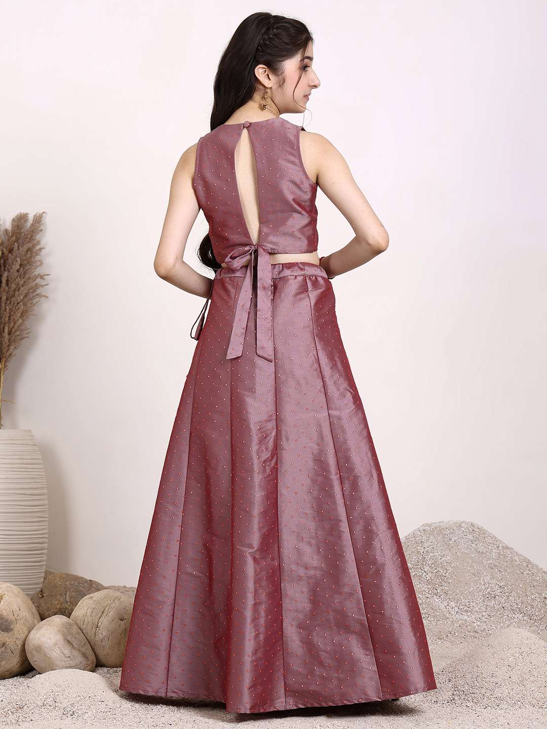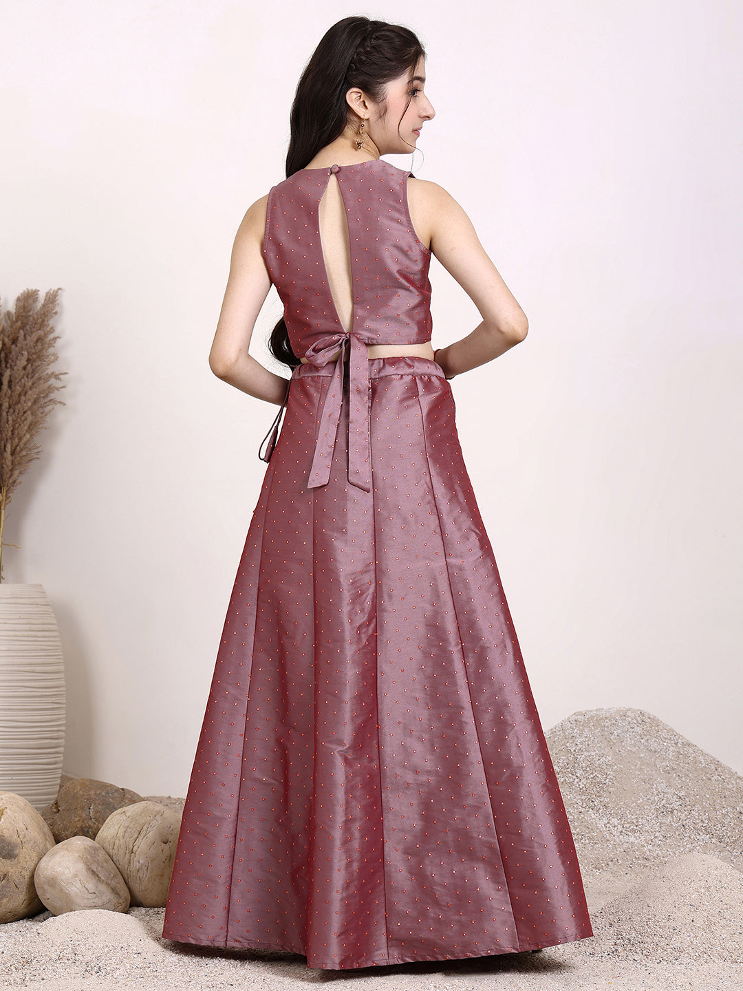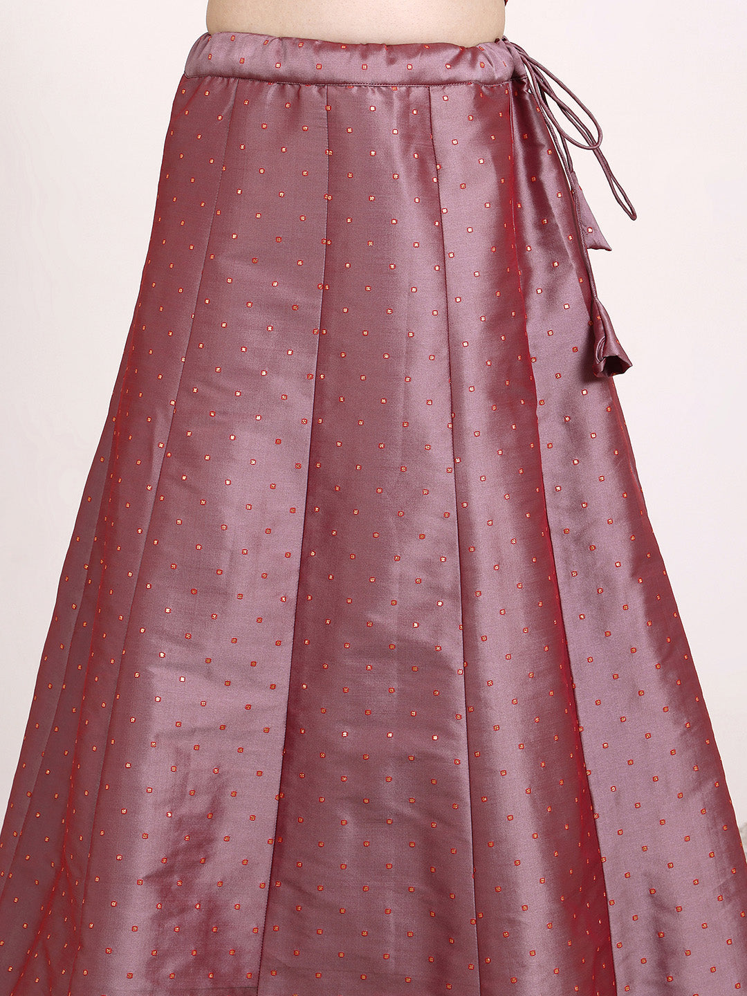 Mauve woven design ready to wear lehenga, has slip-on closure, flared hem