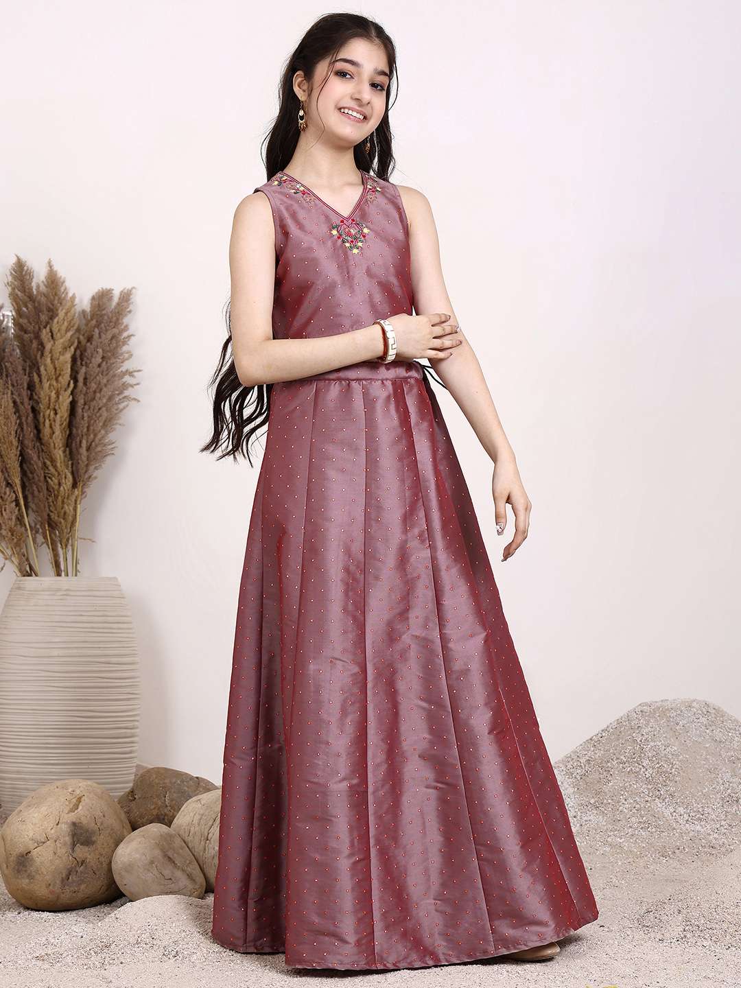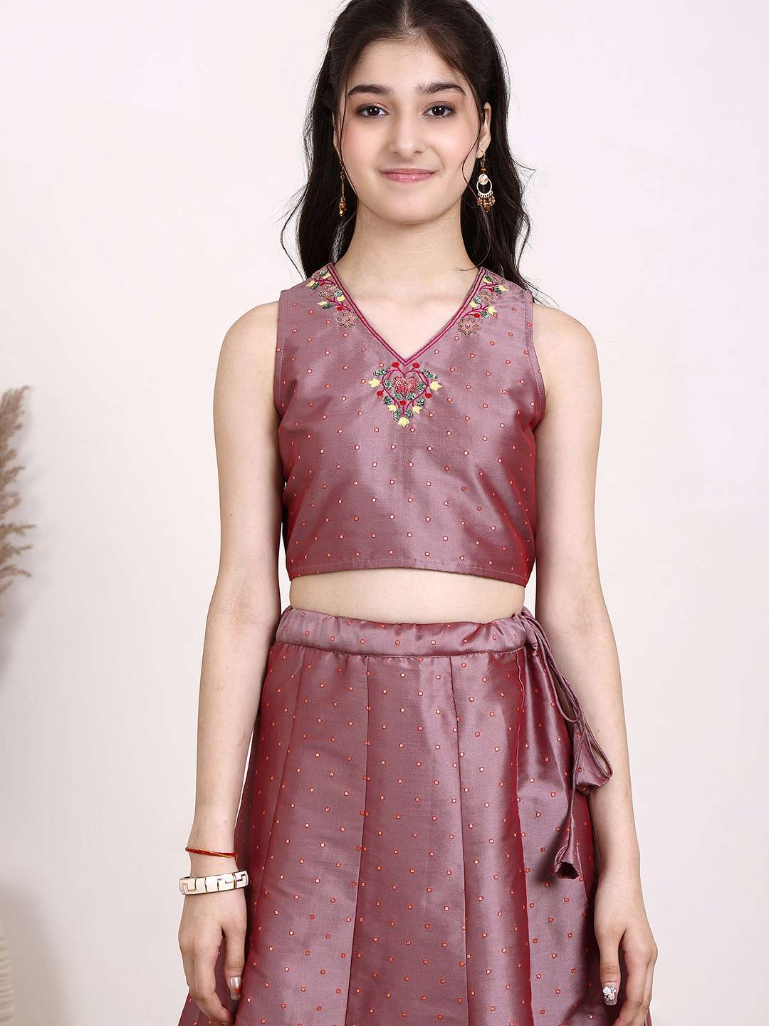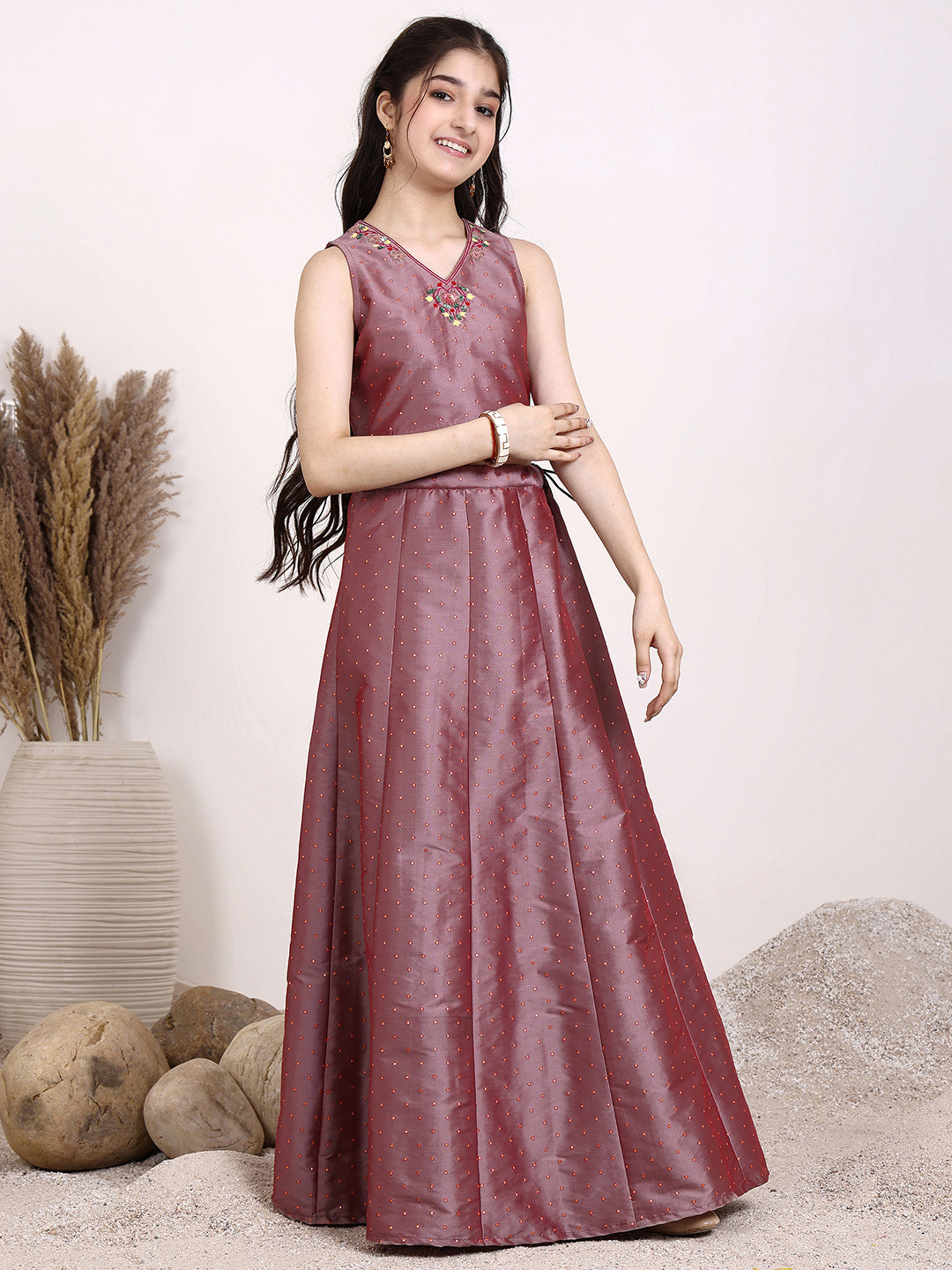 Mauve embroidered ready to wear blouse, has a v-neck, sleeveless, slip-on closure