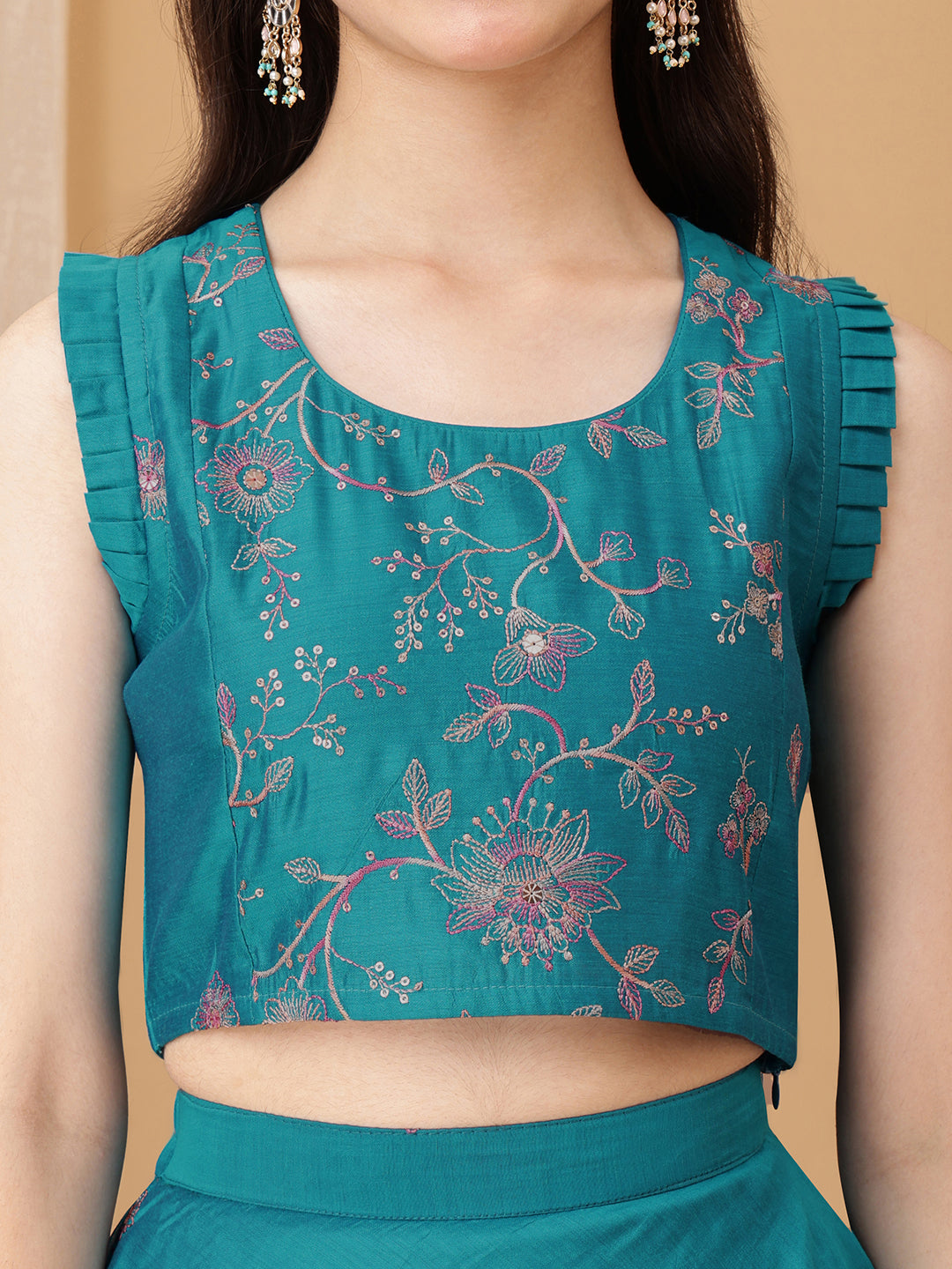 Teal and rose gold embroidered ready to wear lehenga, has slip-on closure, flared hem