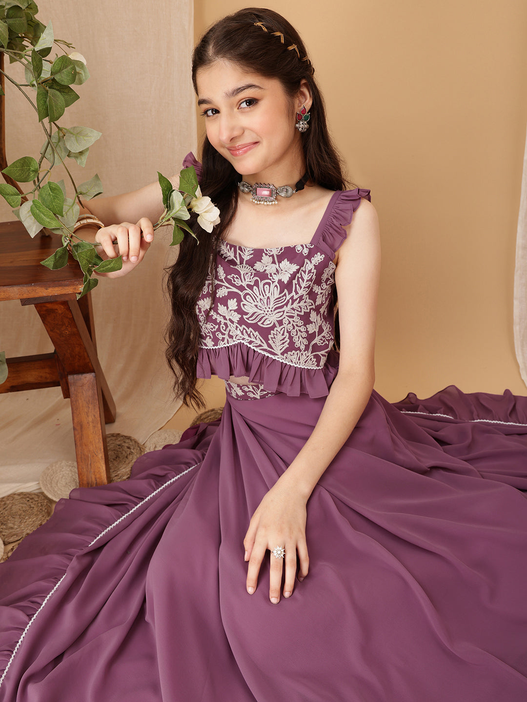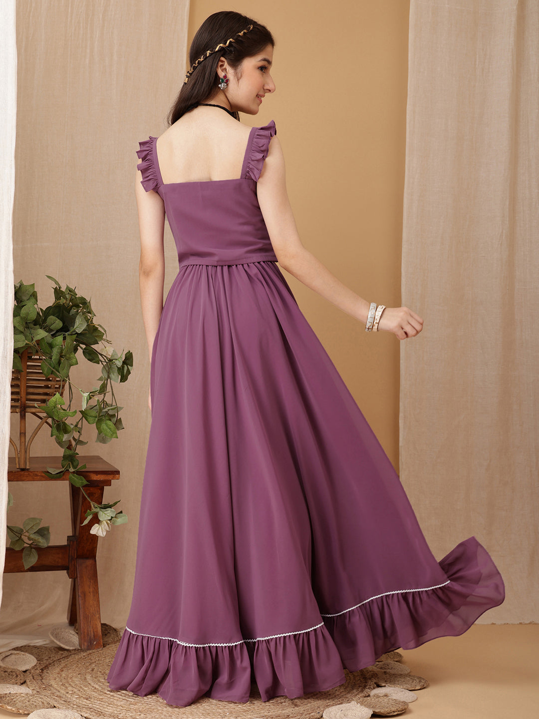 Mauve and white solid ready to wear lehenga, has slip-on closure, flared hem