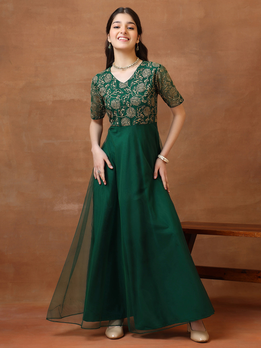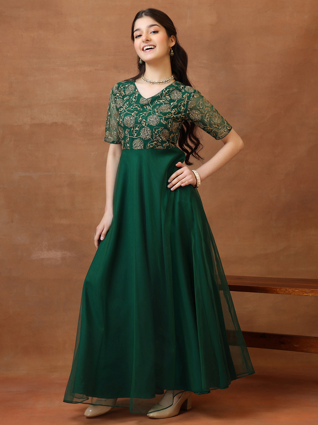 Elevate your girl's ethnic wardrobe with this stunning green and gold A-line dress. Featuring delicate floral prints and a flattering V-neckline, this piece combines traditional charm with modern style. The fitted waist belt accentuates the silhouette while short sleeves and a gracefully flared hem ensure comfort and movement. A convenient zip closure makes dressing effortless. Crafted from a luxurious blend of net and shantoon fabric, this dress offers an elegant drape perfect for festive occasions and celebrations. The intricate embroidery details add a touch of sophistication. Dry clean only to maintain the beauty and longevity of this heirloom-worthy piece.