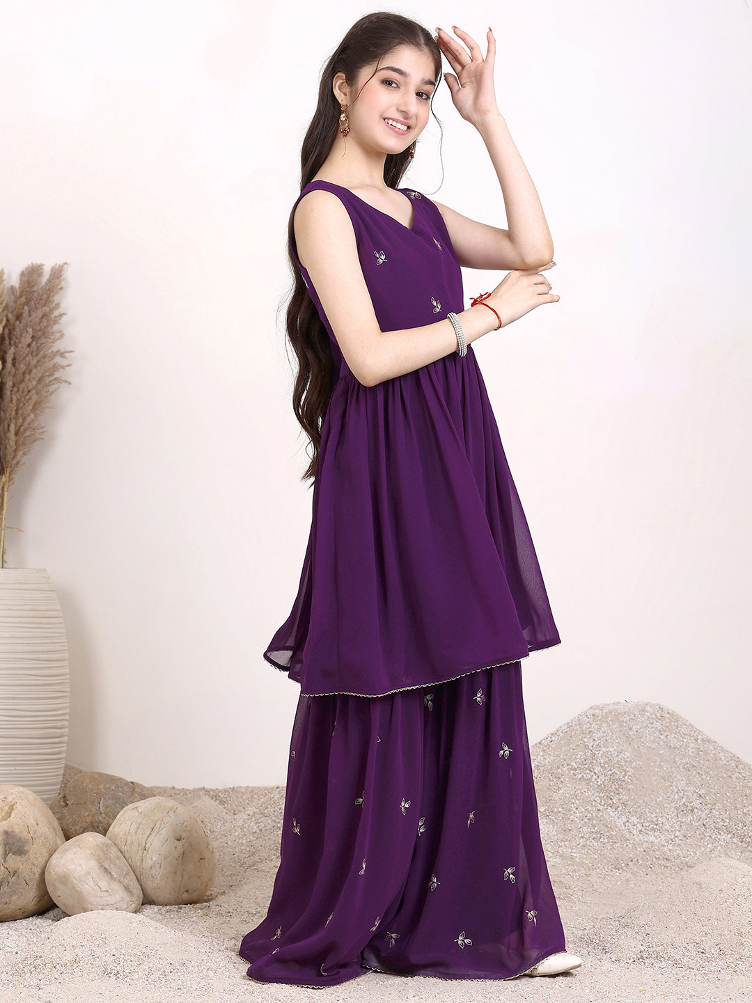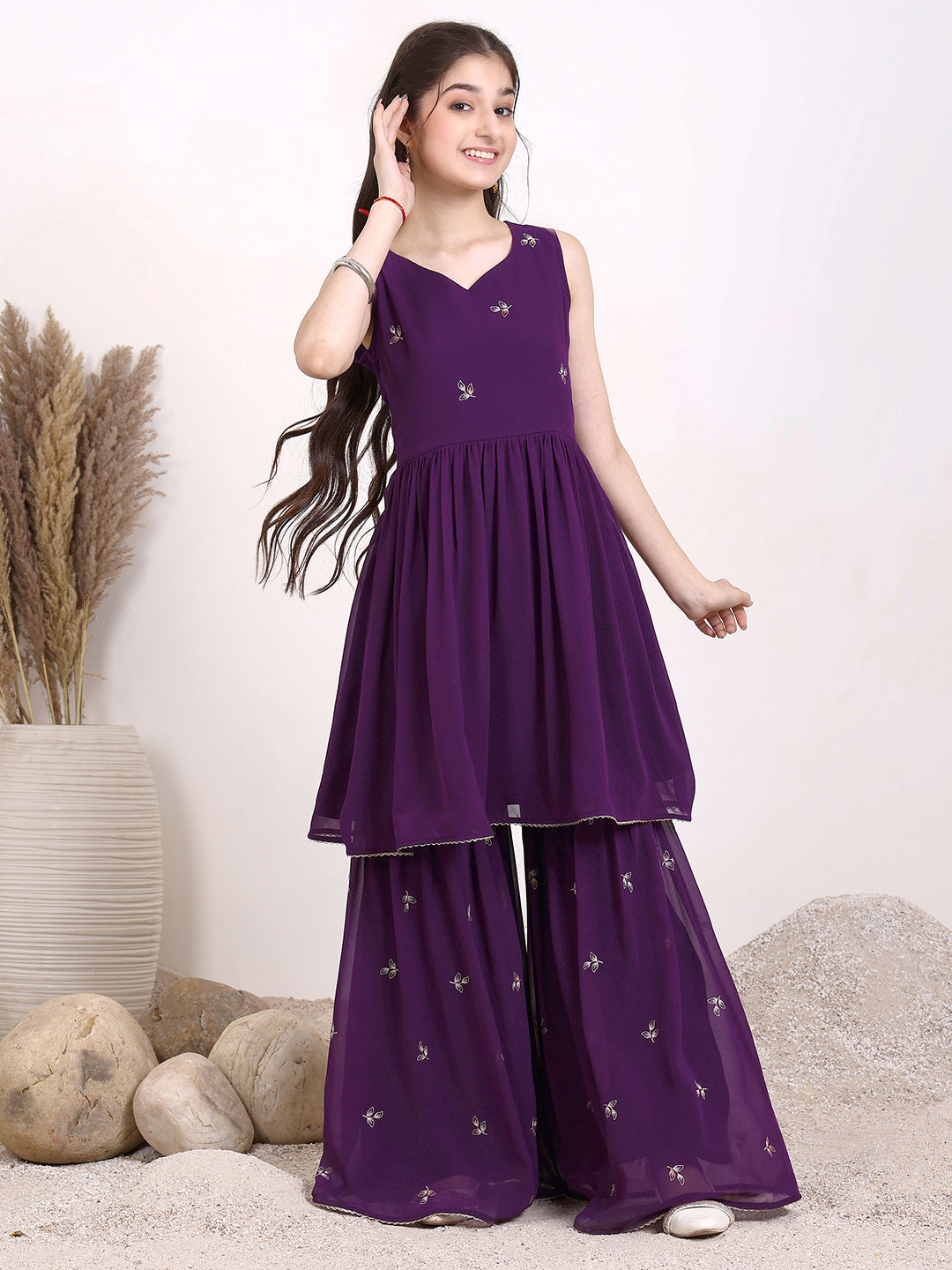 This purple and gold toned embroidered kurta with sharara exudes elegance and style. The sweetheart neck and knee length with flared hem create a flattering A-line shape. Made from georgette fabric, the kurta features a beautiful embroidered yoke design and pleated style. The sharara is also embroidered and has a partially elasticated waistband for comfort and a slip-on closure for convenience. Perfect for special occasions and celebrations.
