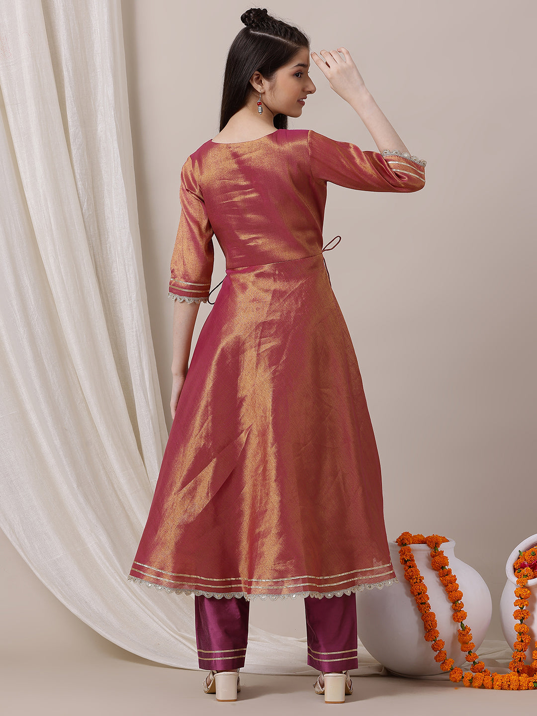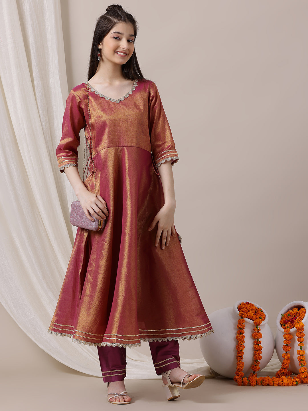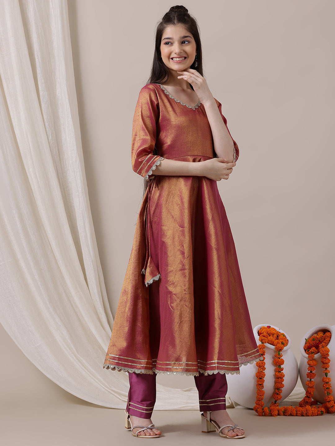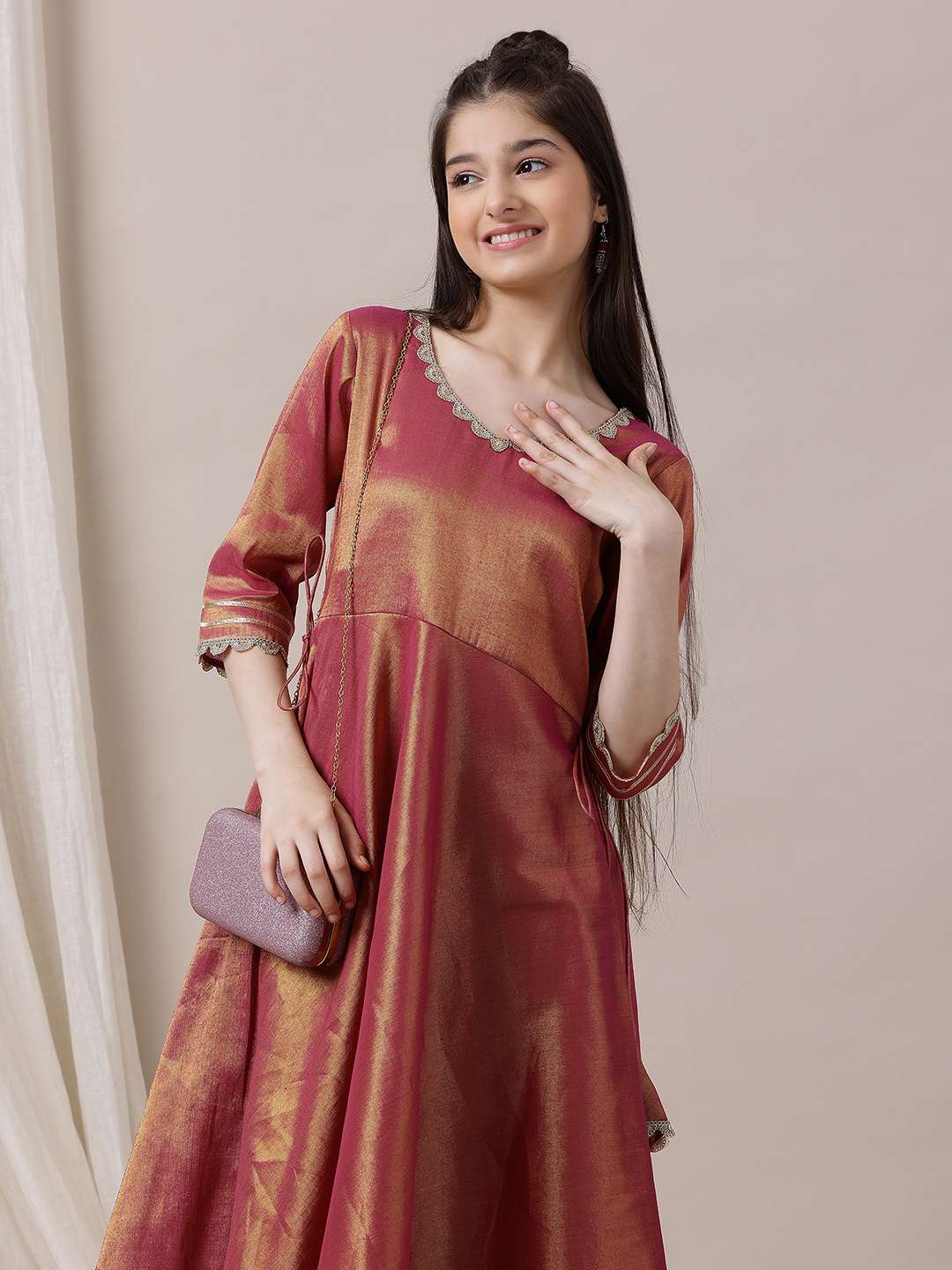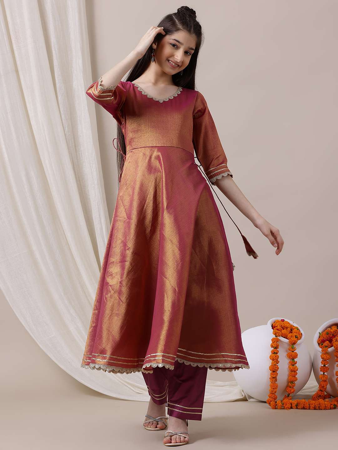 Elevate your little girl's wardrobe with our Girls Empire Anarkali Kurta and Trousers set. The pink and gold toned kurta features an elegant Anarkali shape, V-neck, and zari details, made from a delicate tissue machine weave fabric. The solid trousers have a partially elasticated waistband for comfort and a slip-on closure for easy wear. Perfect for any occasion with its stylish design and scalloped hem.
