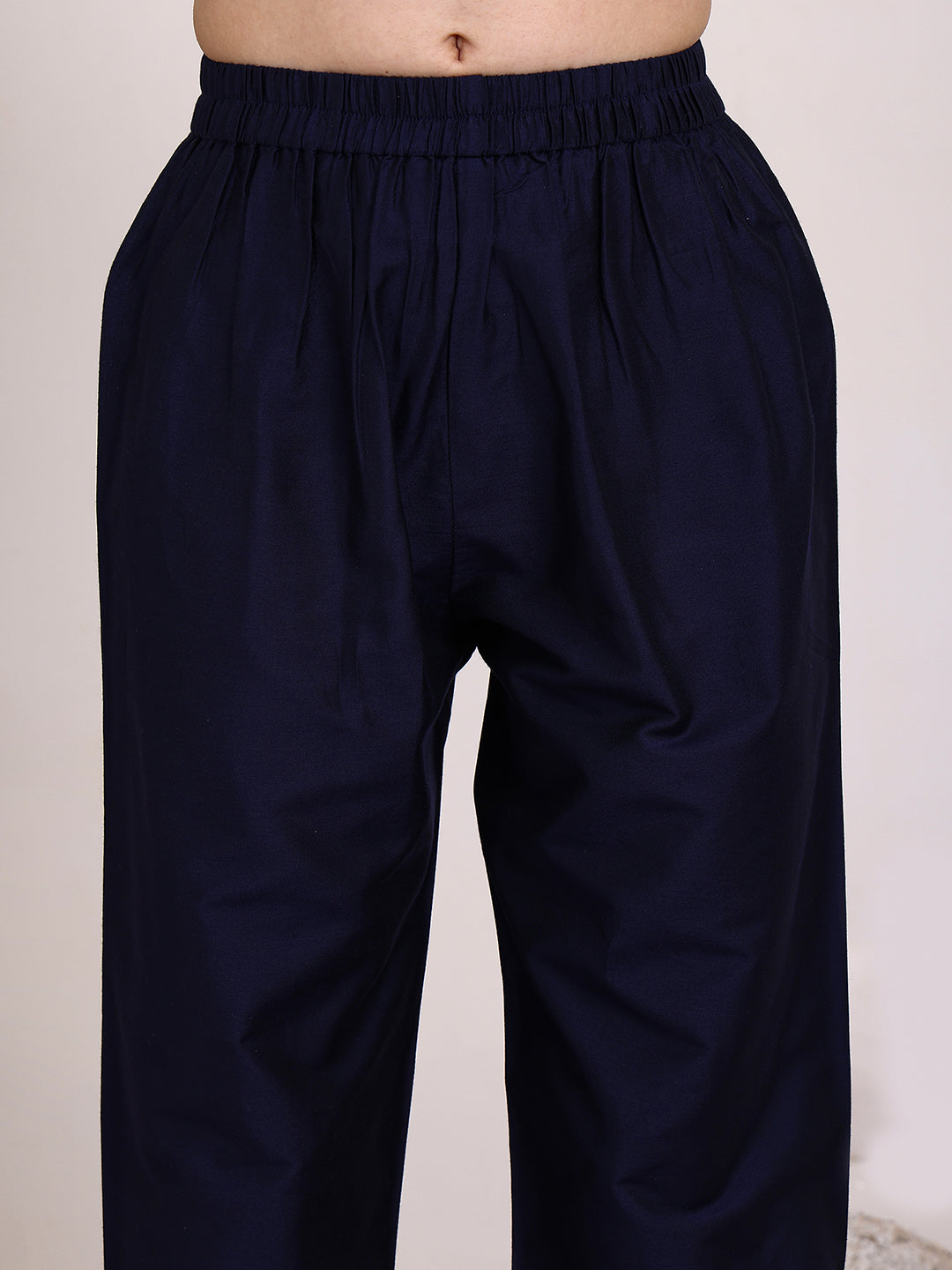 This navy blue Kurta with Trousers features ethnic motifs embroidery, A-line shape, and angrakha style that adds a touch of tradition to your wardrobe. The silk blend fabric is smooth to the touch, and the partially elasticated waistband offers a comfortable fit. Perfect for formal occasions or everyday wear.