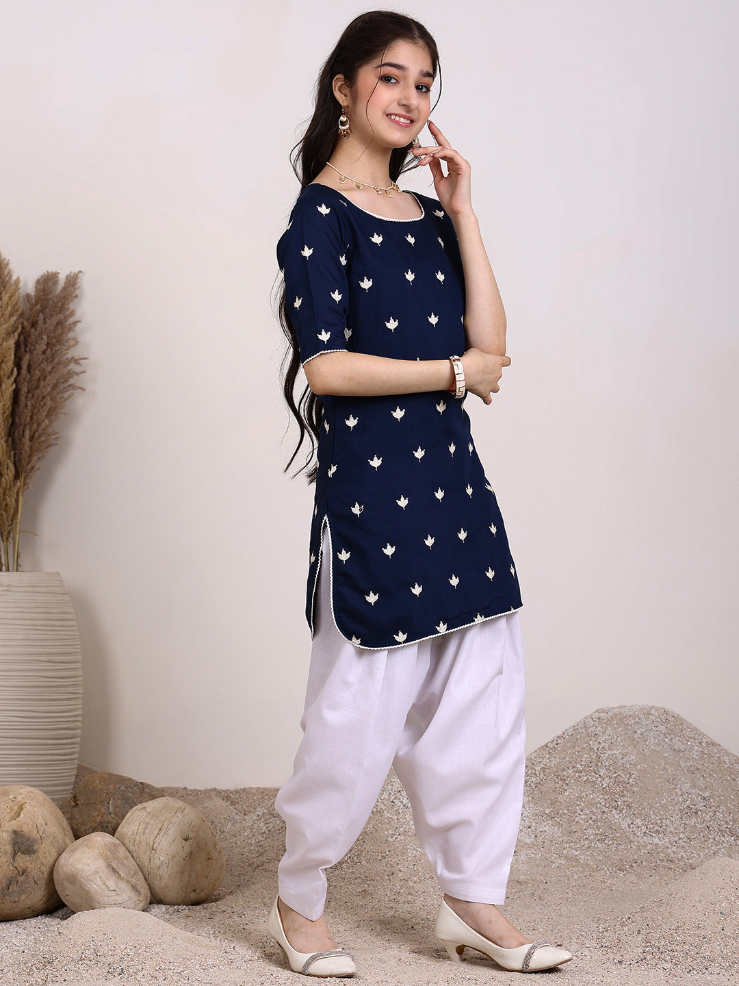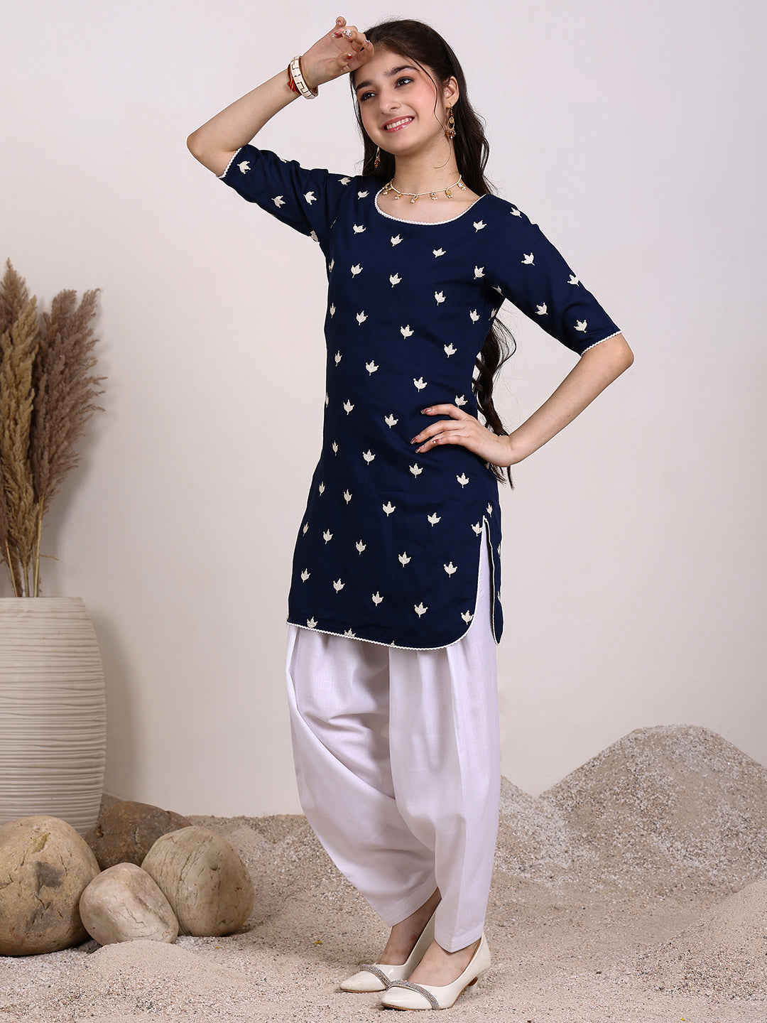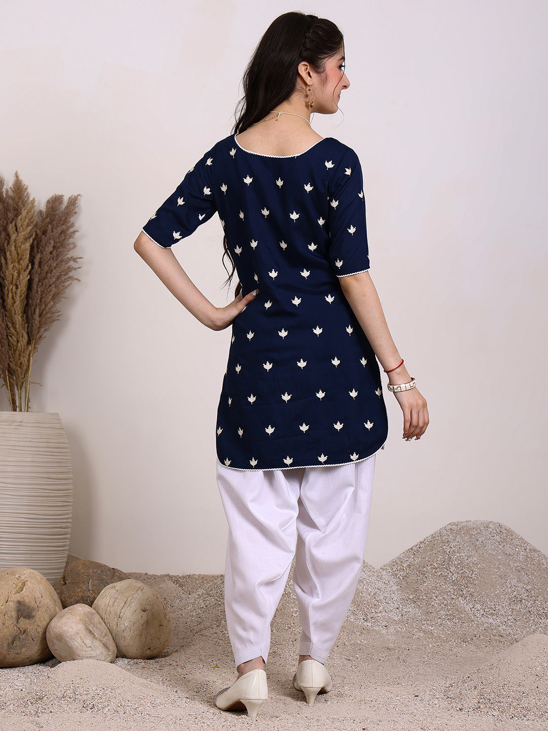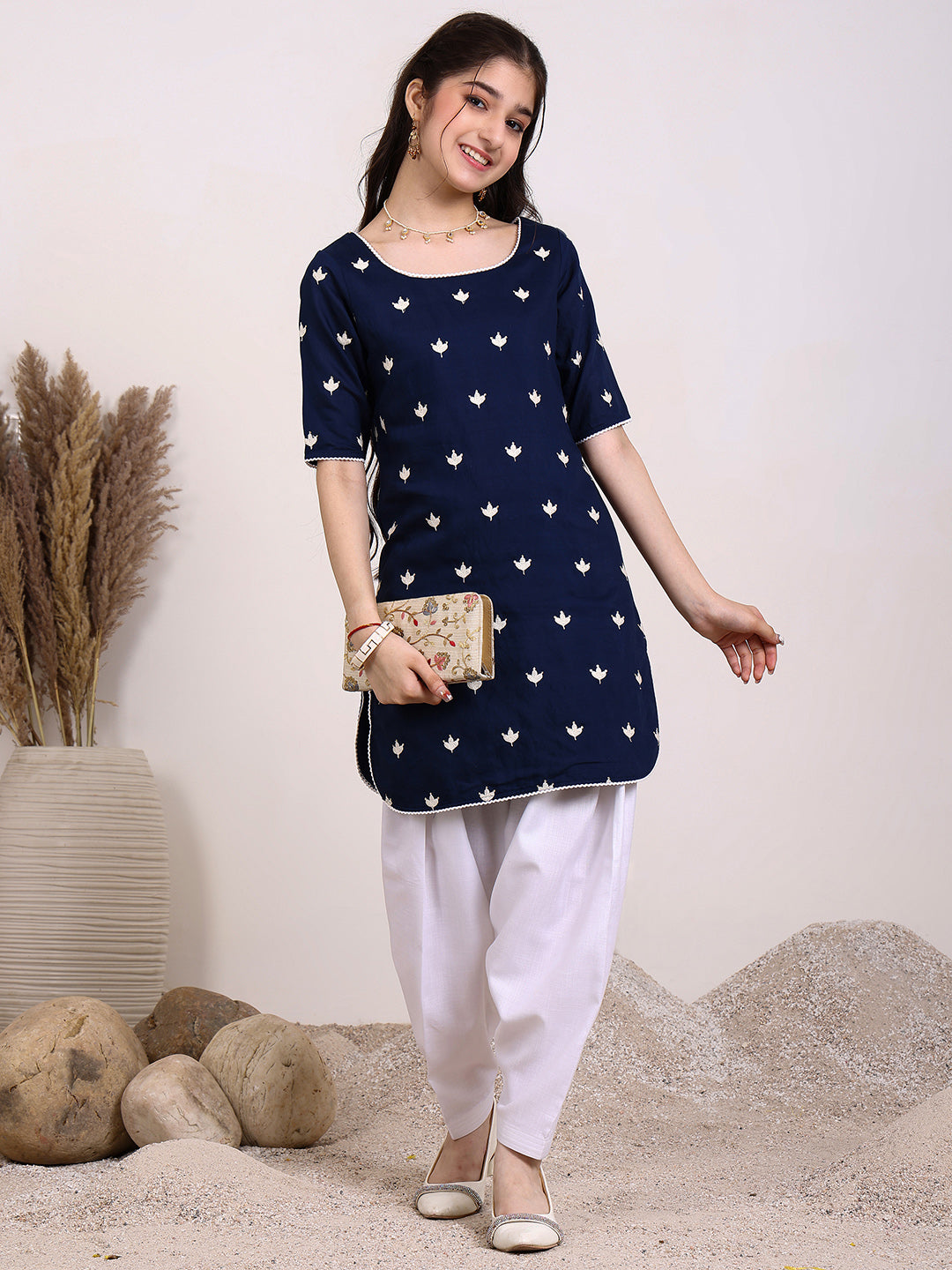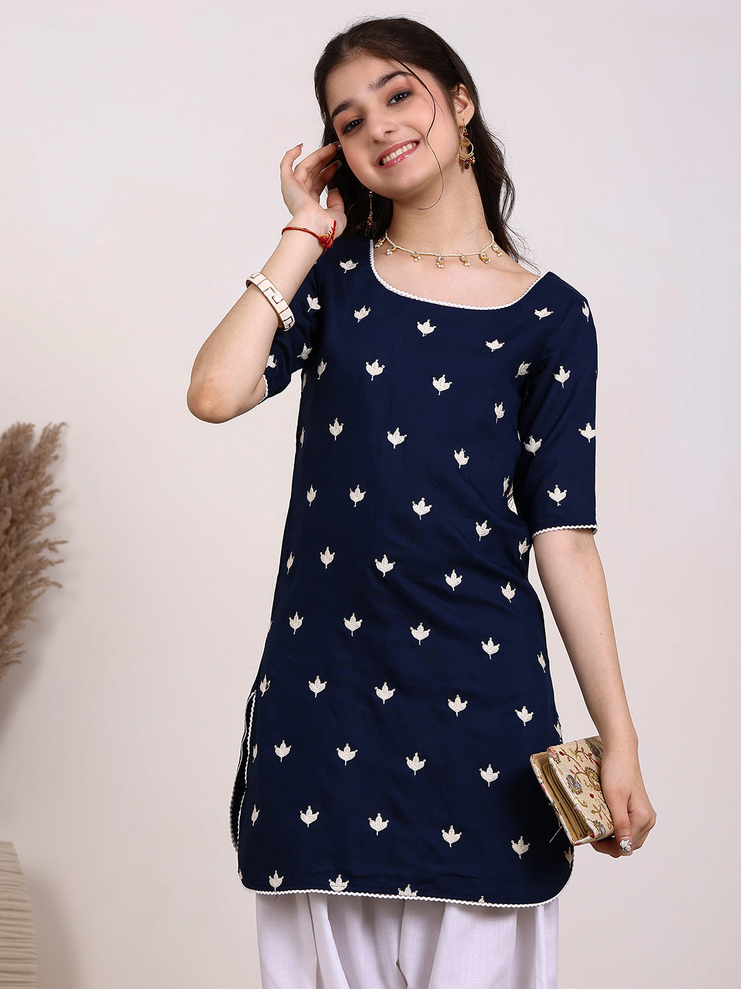 This navy blue embroidered Kurta and Dhoti Pants set features traditional ethnic motifs, a straight shape, and a U-neck with short sleeves. The Chanderi cotton fabric is machine-woven for durability and comfort, while the curved hem and knee-length add a touch of modern style. The solid Dhoti Pants have a partially elasticated waistband for easy wear, making this set perfect for any occasion.