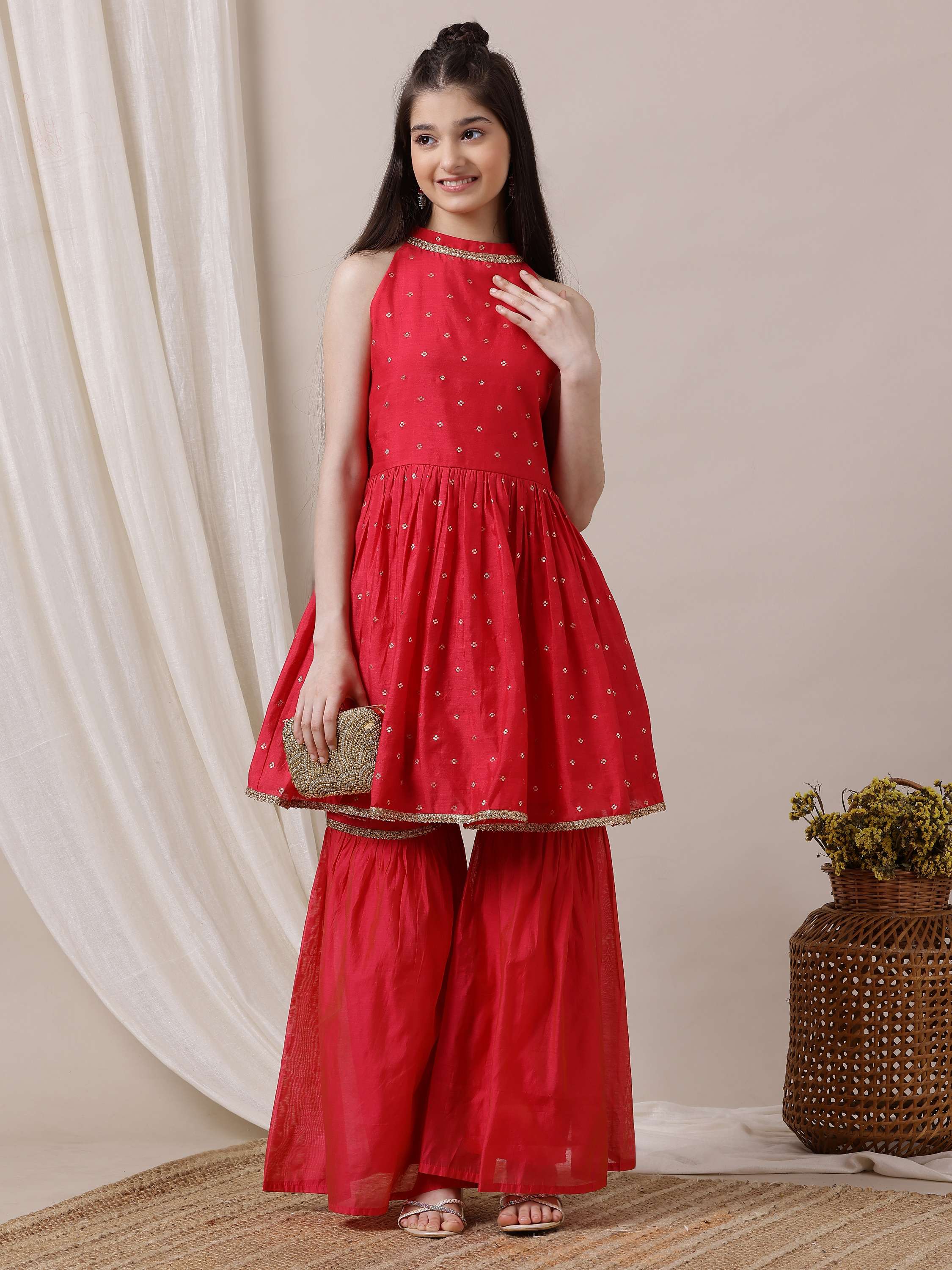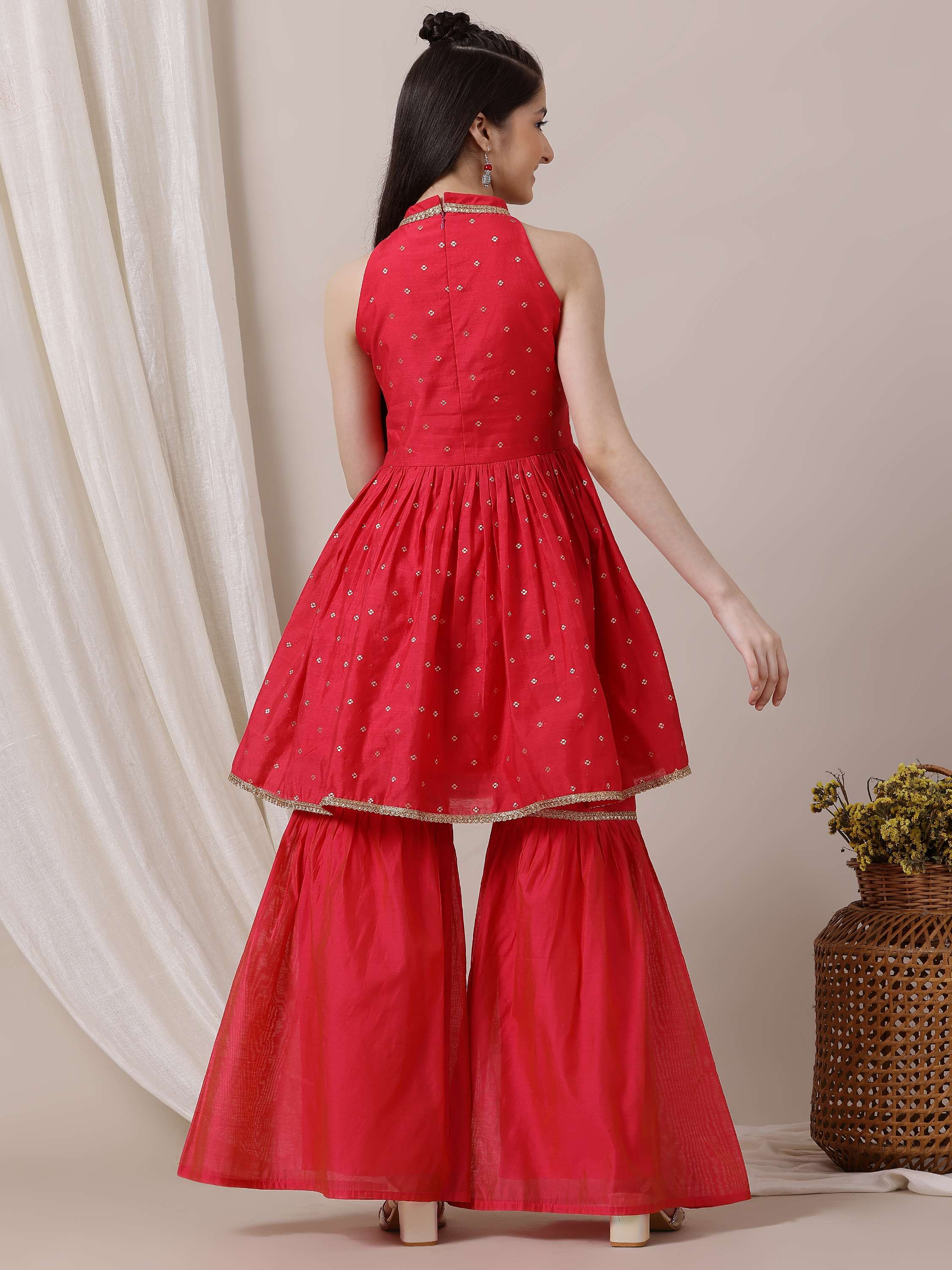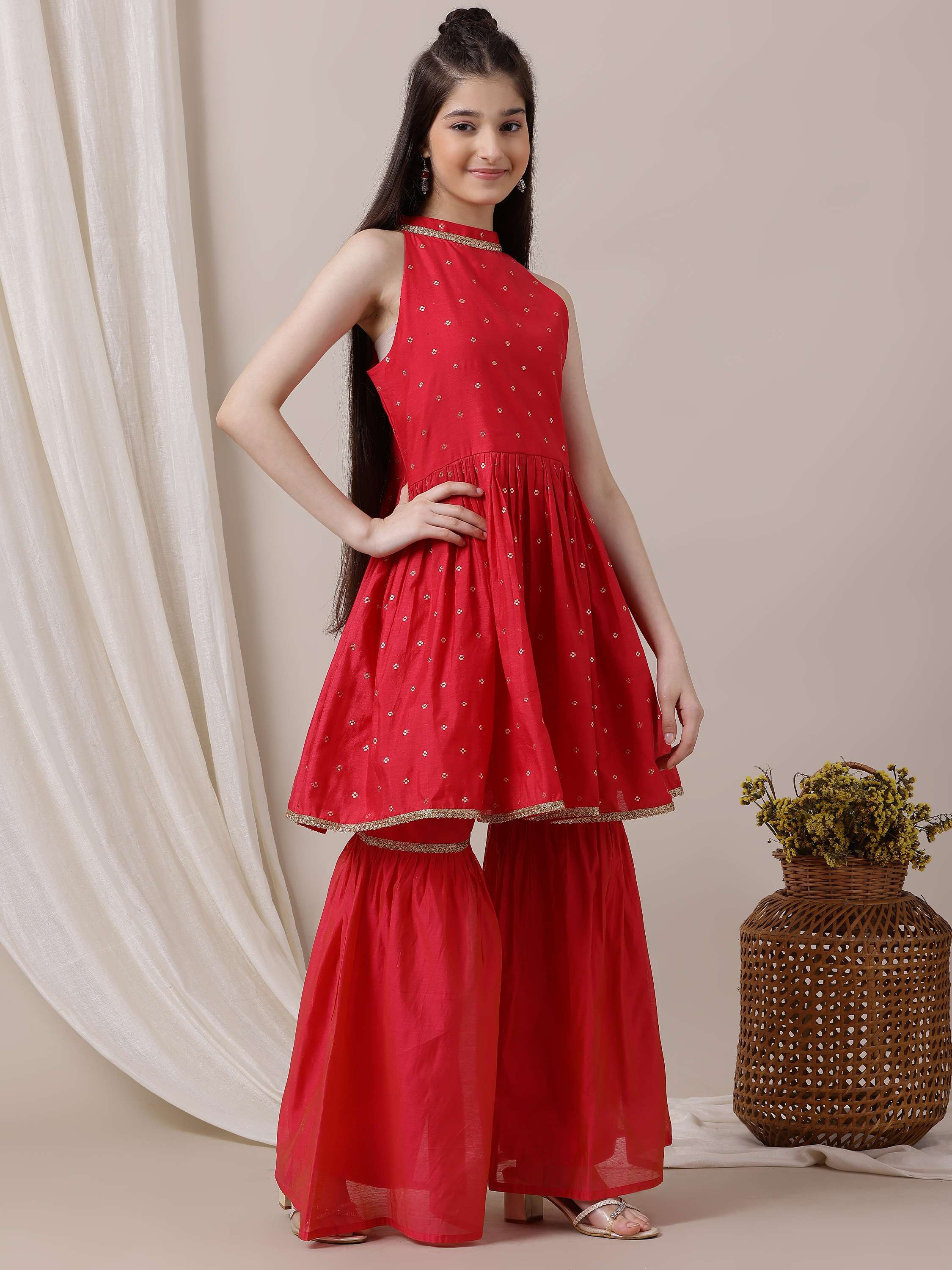 Discover traditional elegance with our Girls Ethnic Motifs Pleated Chanderi Cotton Kurta with Sharara. Features an A-line shape, halter neck, and pleated style for a flattering fit. The woven design and flared hem add a touch of sophistication, while the partially elasticated waistband on the solid Sharara offers comfortable and easy wear. Crafted from Chanderi cotton, this kurta and sharara set is perfect for special occasions. Dry clean only for long-lasting wear.