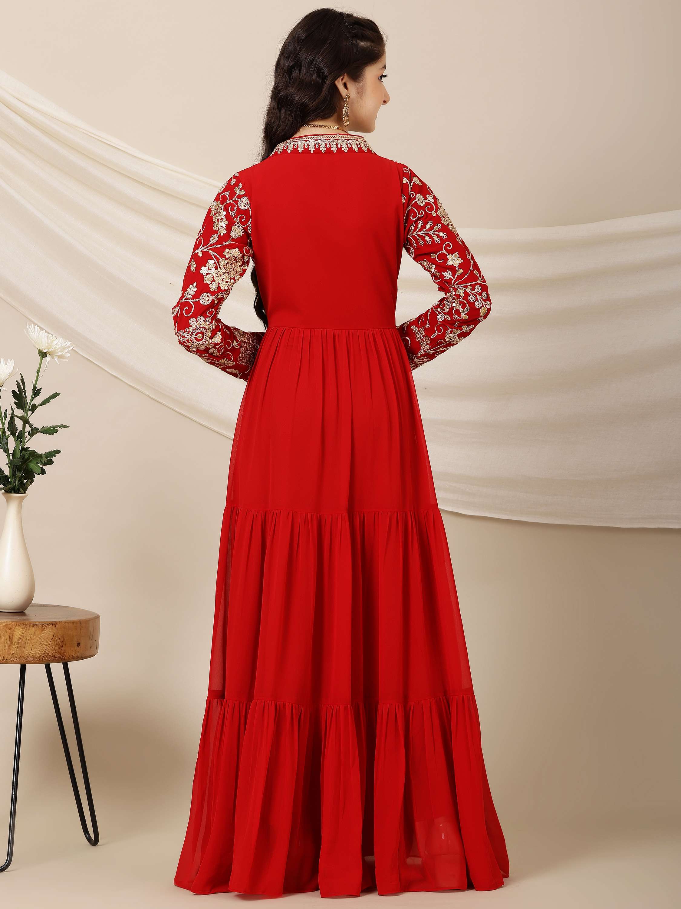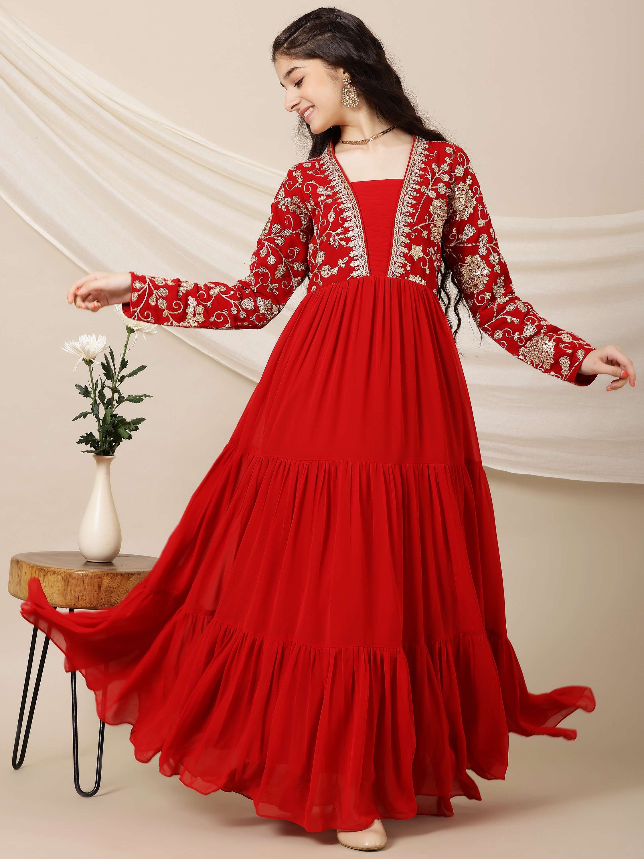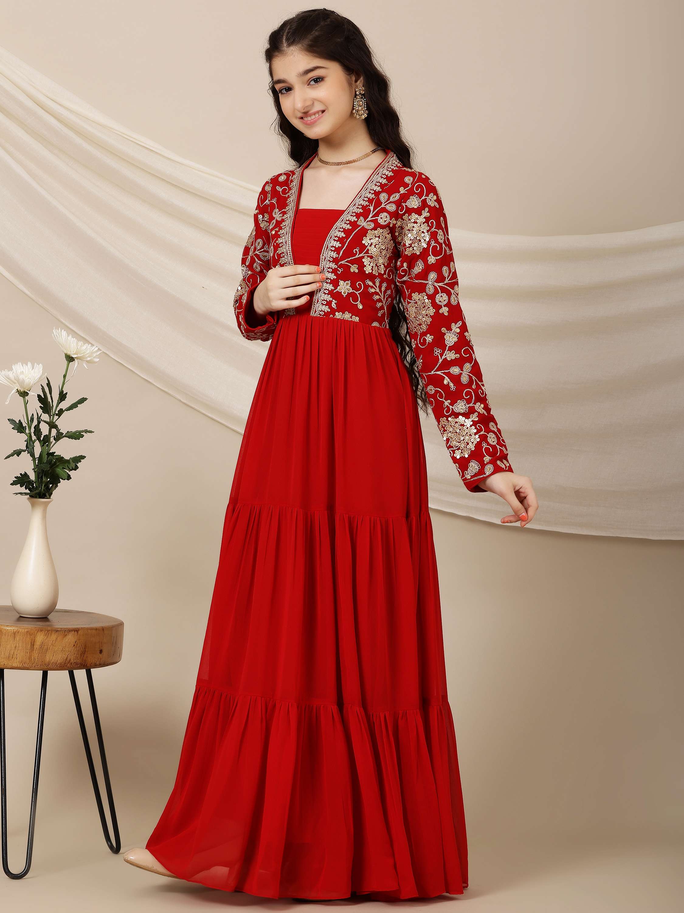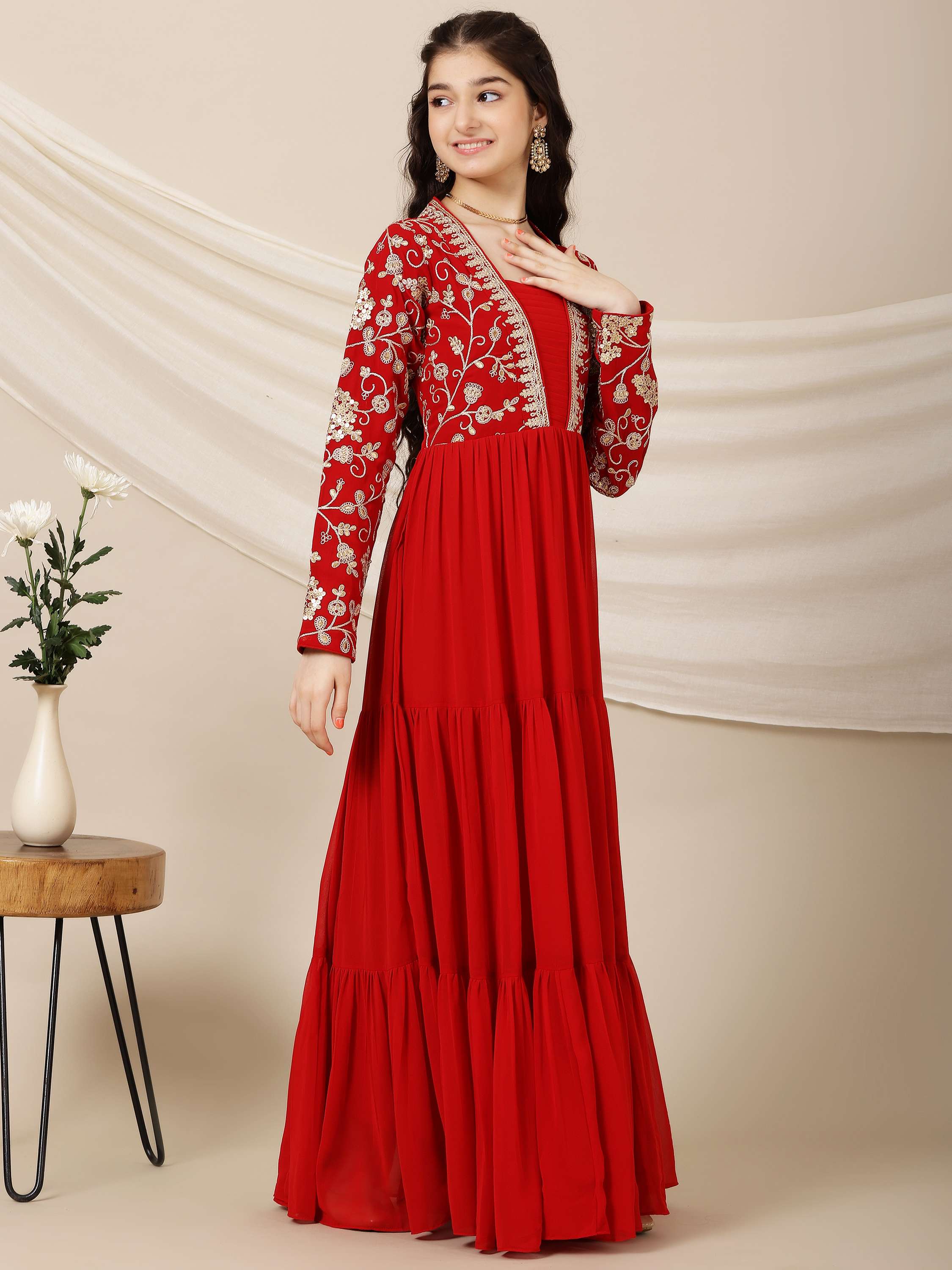 This stylish Girls Floral Embroidered A-Line Maxi Ethnic Dress features a beautiful red color with intricate floral embroidery. The A-line shape flatters any figure, while the V-neck and long sleeves add elegance. The flared hem and slip-on design make it effortless to wear. Perfect for any occasion!