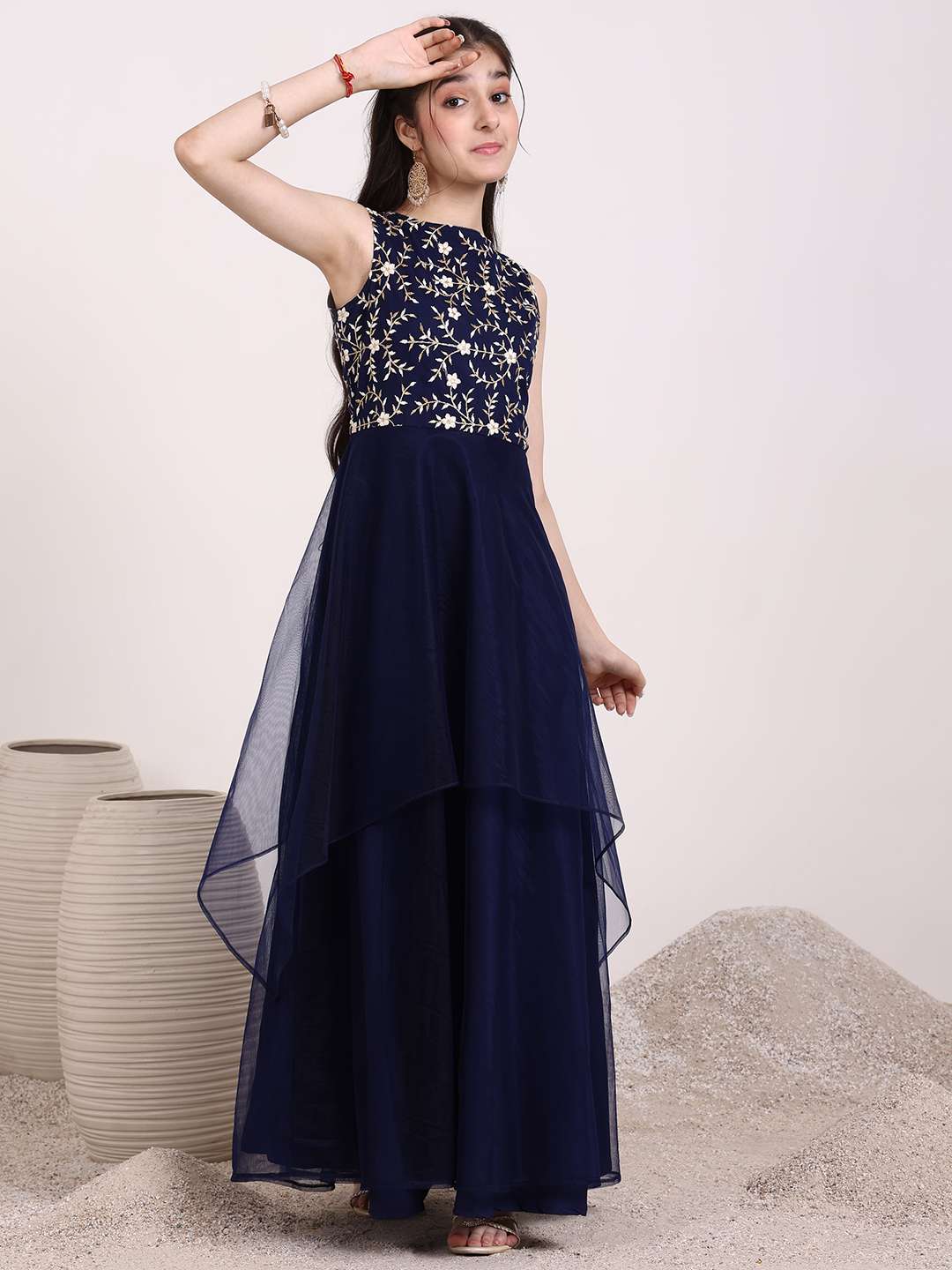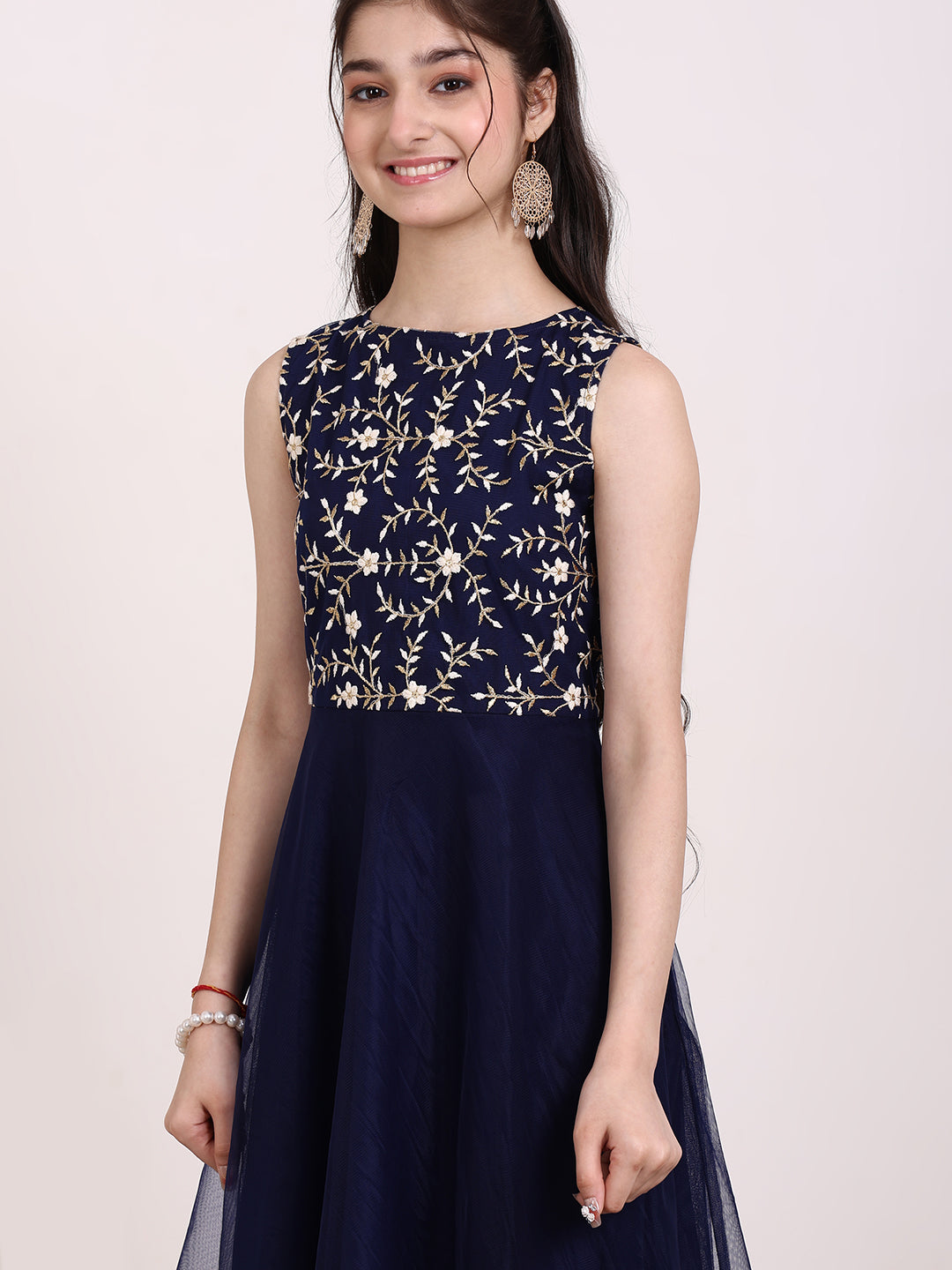 Expertly designed for a refined ethnic look, this beautiful Navy blue and beige dress features intricate floral embroidery and a stylish boat neckline. The sleeveless, Gown-shaped design and flared hem add a touch of elegance, perfect for any special occasion. With a slip-on closure, it's easy to wear and effortlessly stylish.