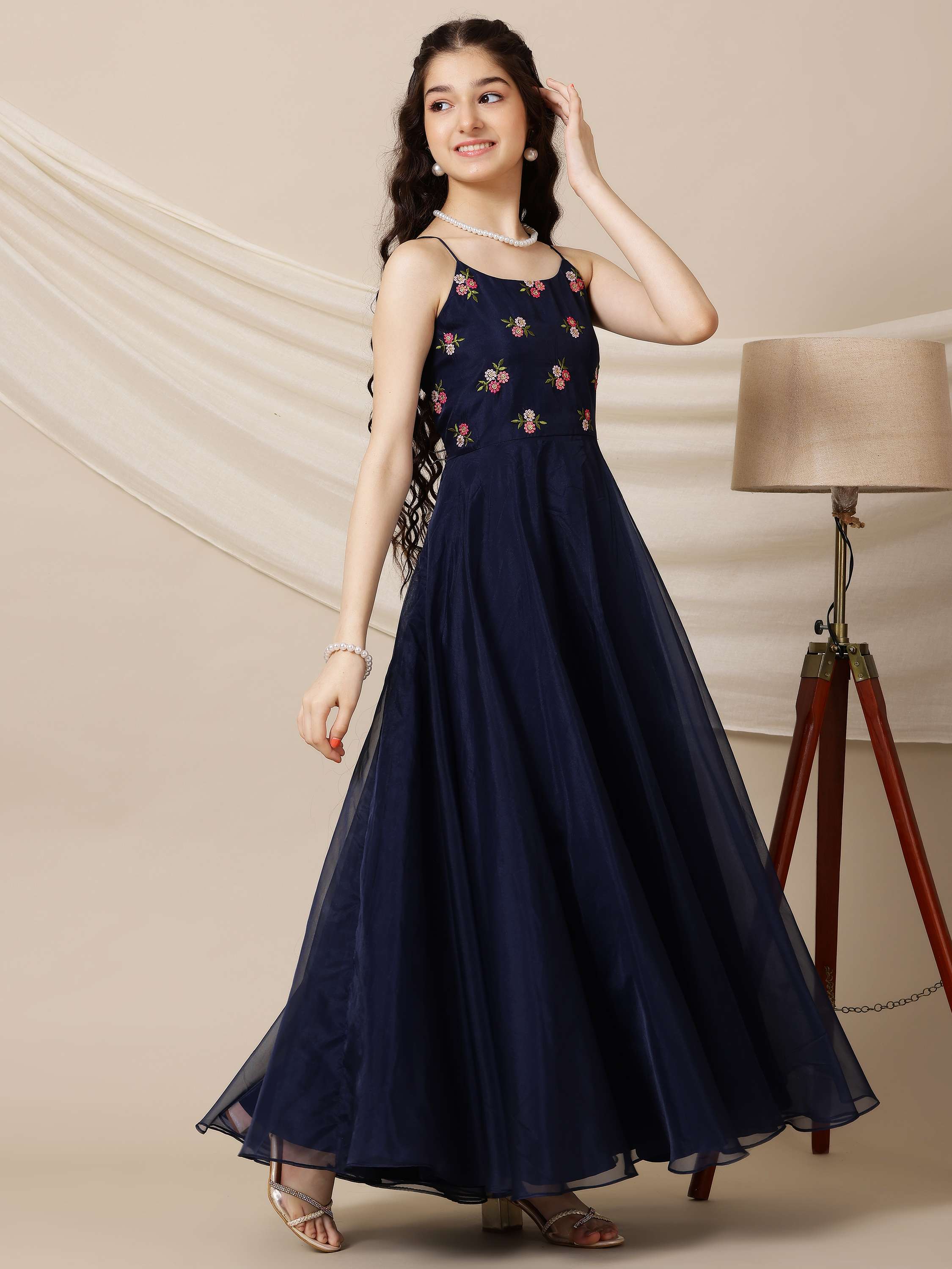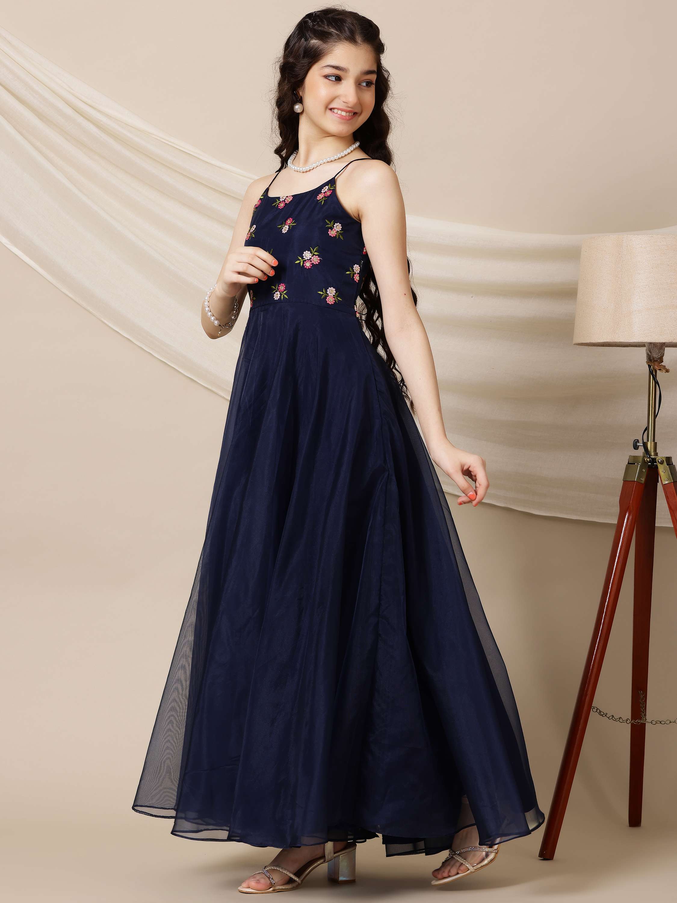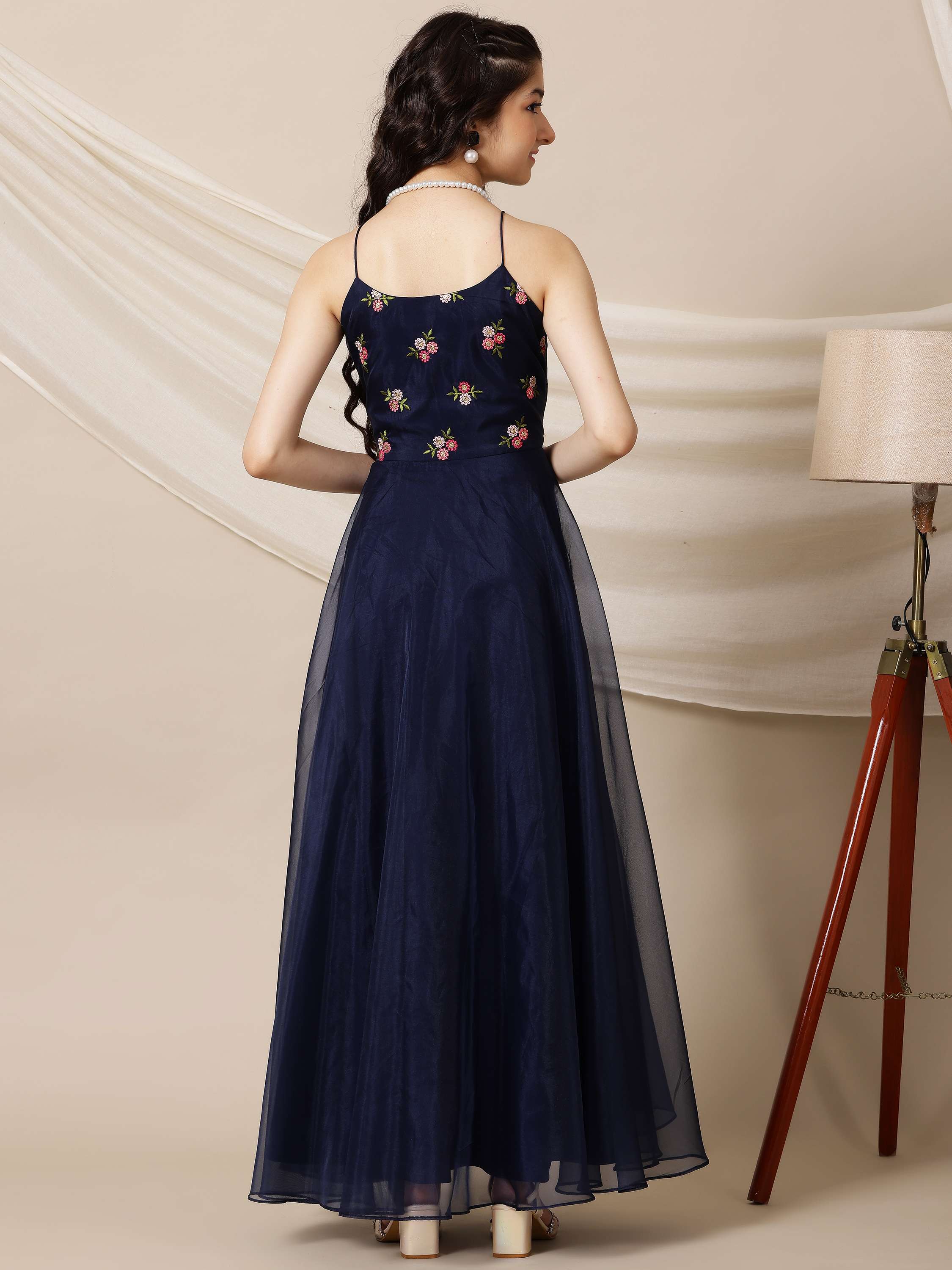 This navy blue ethnic dress features beautiful floral embroidery, a trendy A-line shape, and a flattering waist belt. The shoulder straps and sleeveless design add a touch of elegance, while the flared hem creates a flowy and feminine silhouette. With a slip-on closure, it's easy to wear and perfect for any occasion. Embrace the beauty of ethnic fashion with this stunning maxi dress.