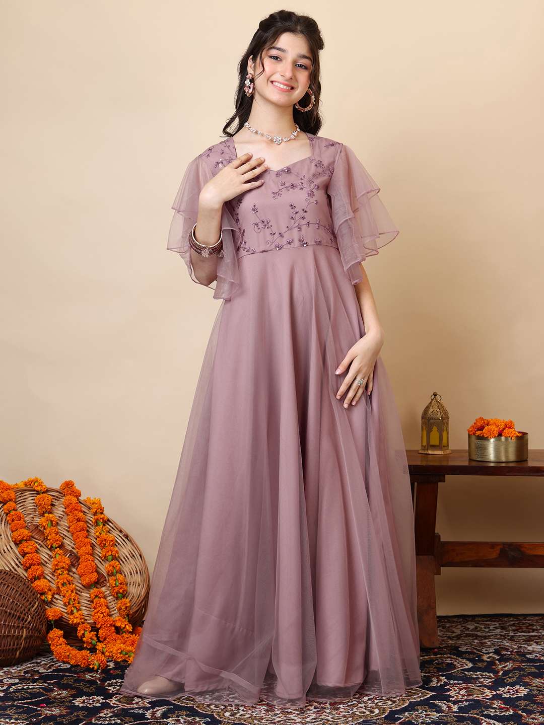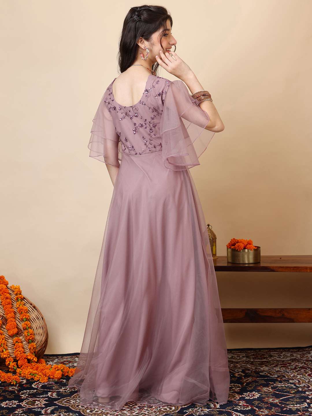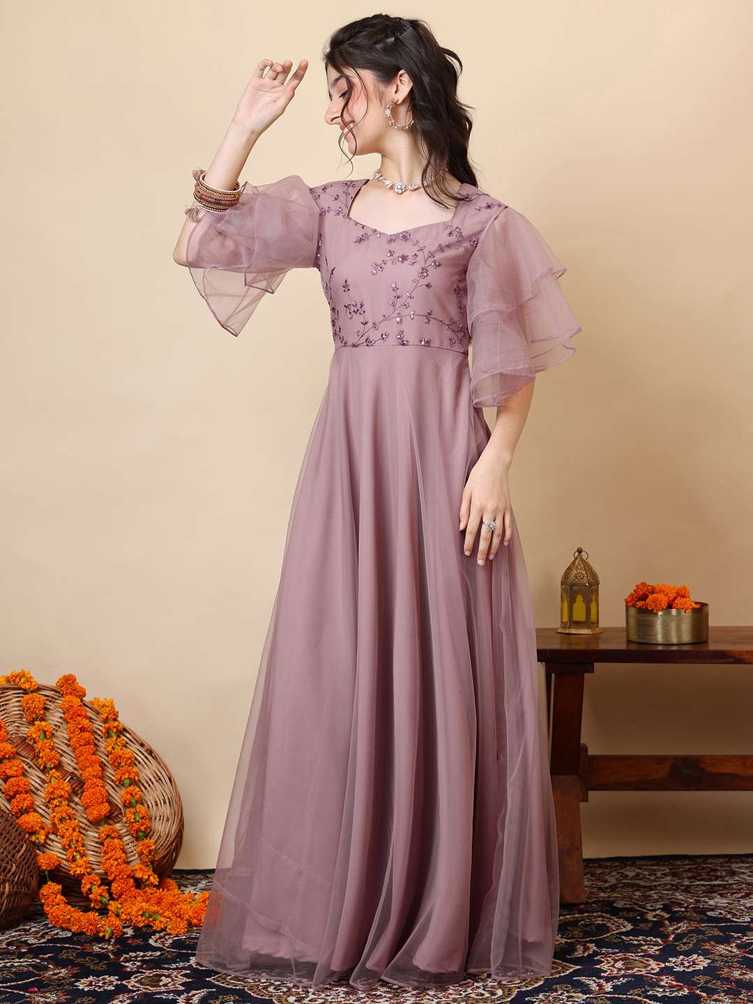 Elegant mauve ethnic dress perfect for special occasions. Crafted from delicate net fabric, this A-line maxi features intricate floral embroidery that adds timeless charm. The sweetheart neckline and short regular sleeves create a graceful silhouette, while the flared hem offers comfortable movement. Slip-on closure ensures easy wear. Ideal for celebrations, festivals, and formal events. Dry clean only to maintain the fabric's beauty and embroidered details.