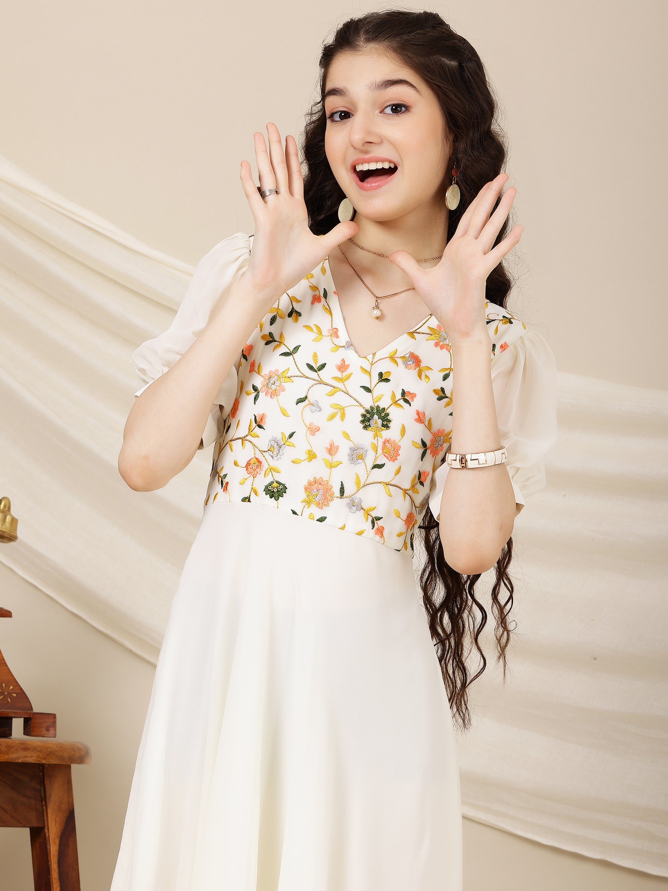 Expertly crafted for your little fashionista, this Girls Floral Multi Thread Embroidered A-Line Ethnic Dress will add a touch of elegance to her wardrobe. Featuring delicate floral embroidery, a flattering A-line shape, and a comfortable slip-on closure, this off white, yellow, and brown dress is perfect for any occasion.