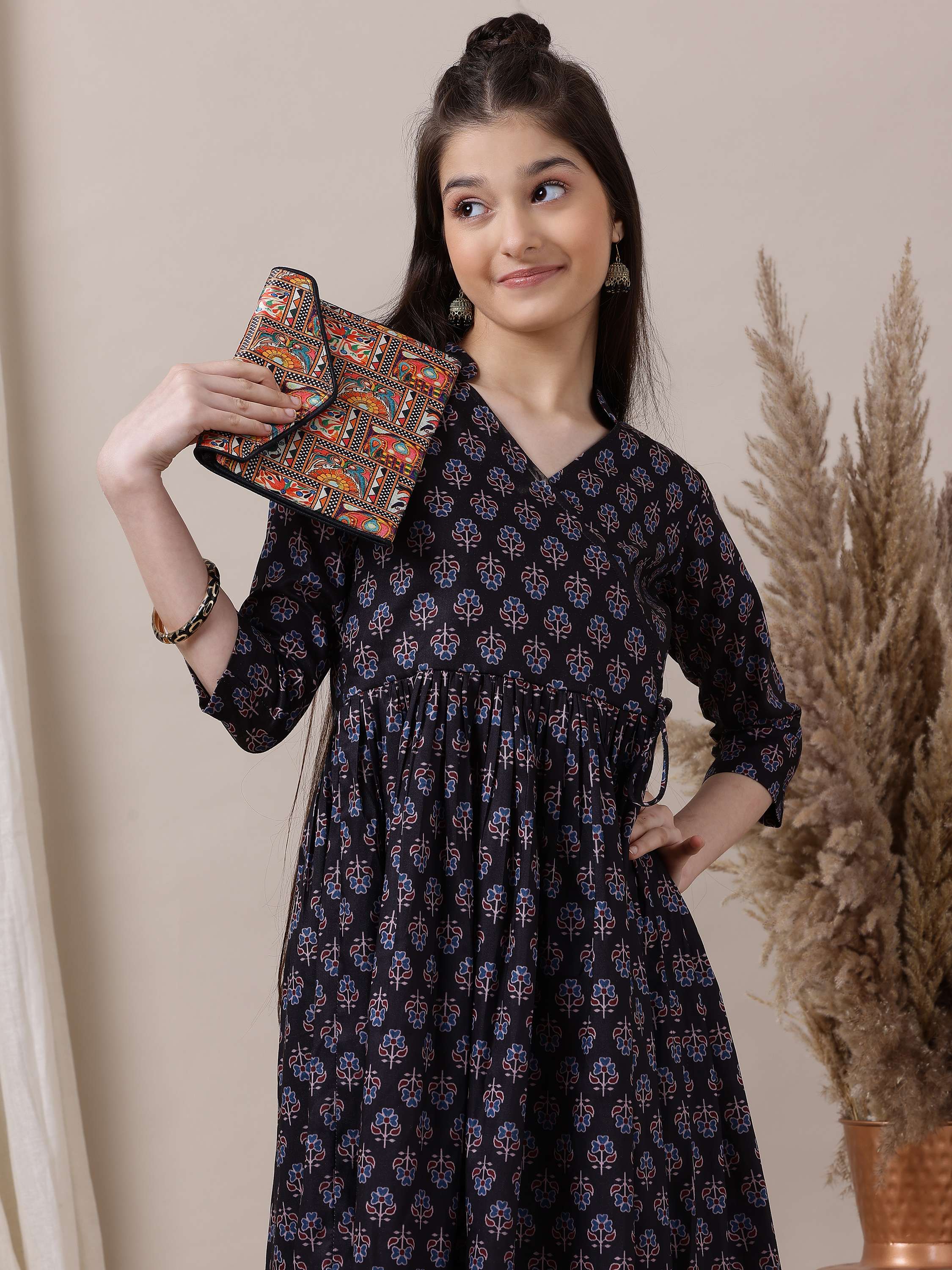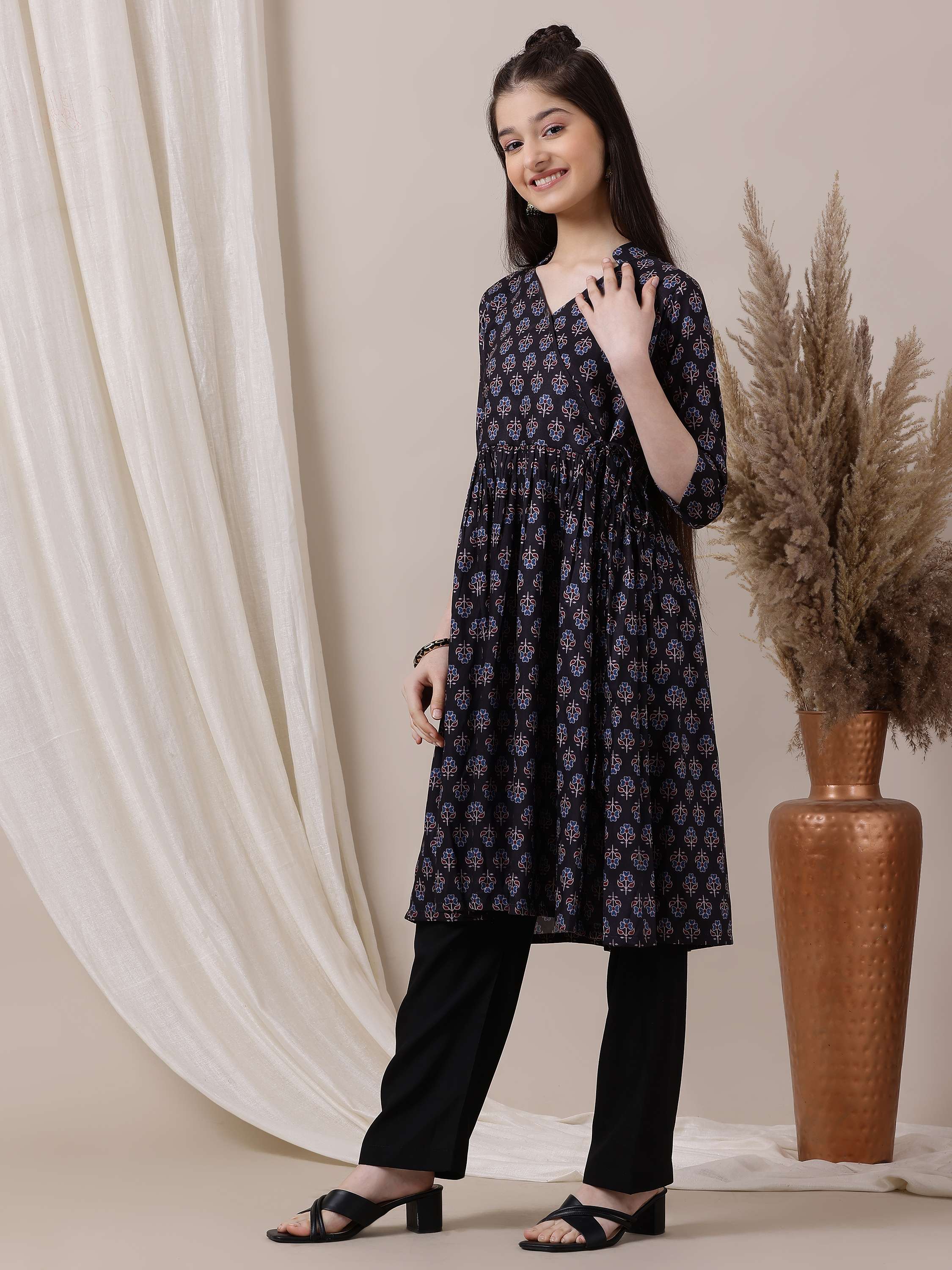 Expertly crafted from a cotton blend using machine weave fabric, this Girls Floral Printed Angrakha Kurta with Trousers is perfect for any occasion. The A-line shape, V-neck and short regular sleeves add a touch of femininity while the angrakha style and calf length with flared hem give it a traditional look. The partially elasticated waistband and slip-on closure make the solid trousers comfortable and easy to wear.