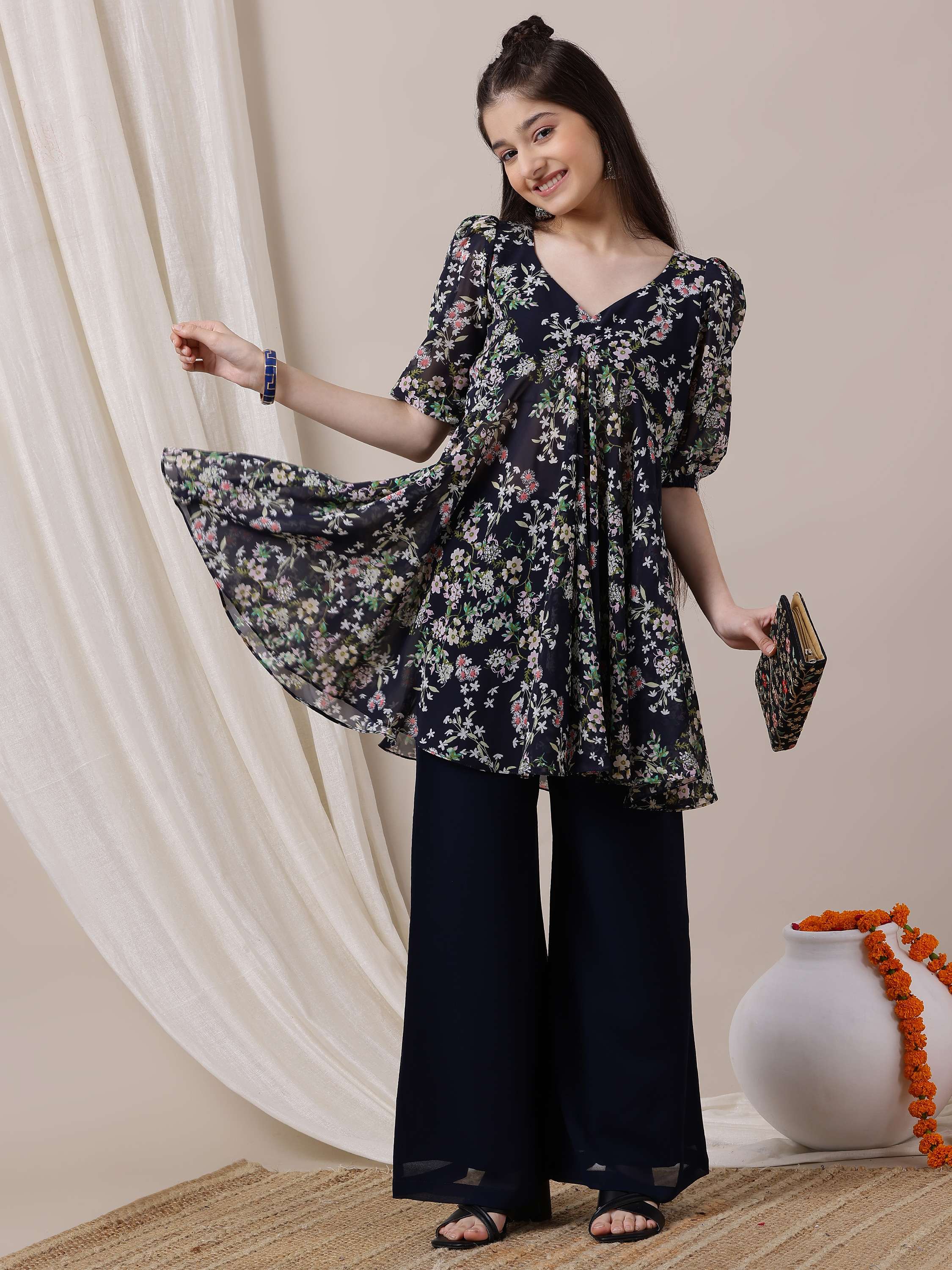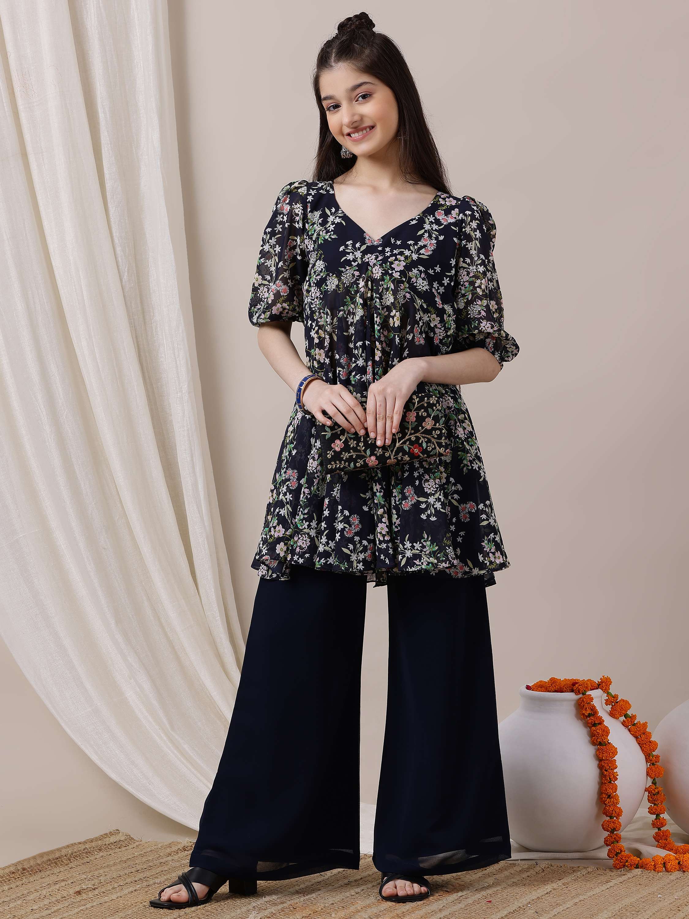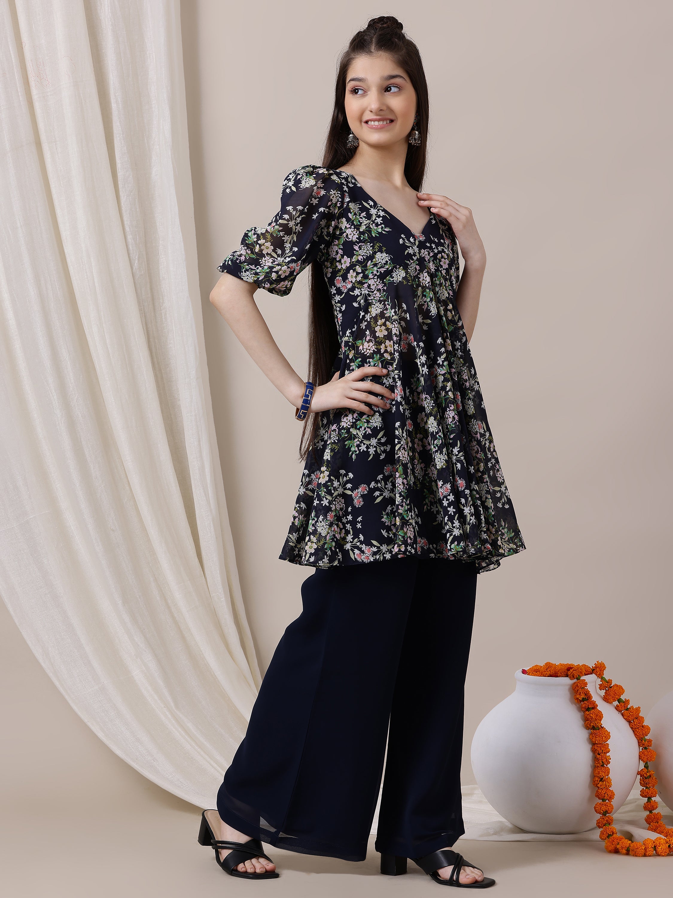 Discover the perfect fusion of style and comfort with our Navy Blue Floral Printed Kurta paired with Solid Palazzos. The A-line silhouette and empire style accentuate your figure, while the printed georgette fabric provides a soft and flowy fit. The partially elasticated waistband ensures a comfortable and secure fit.