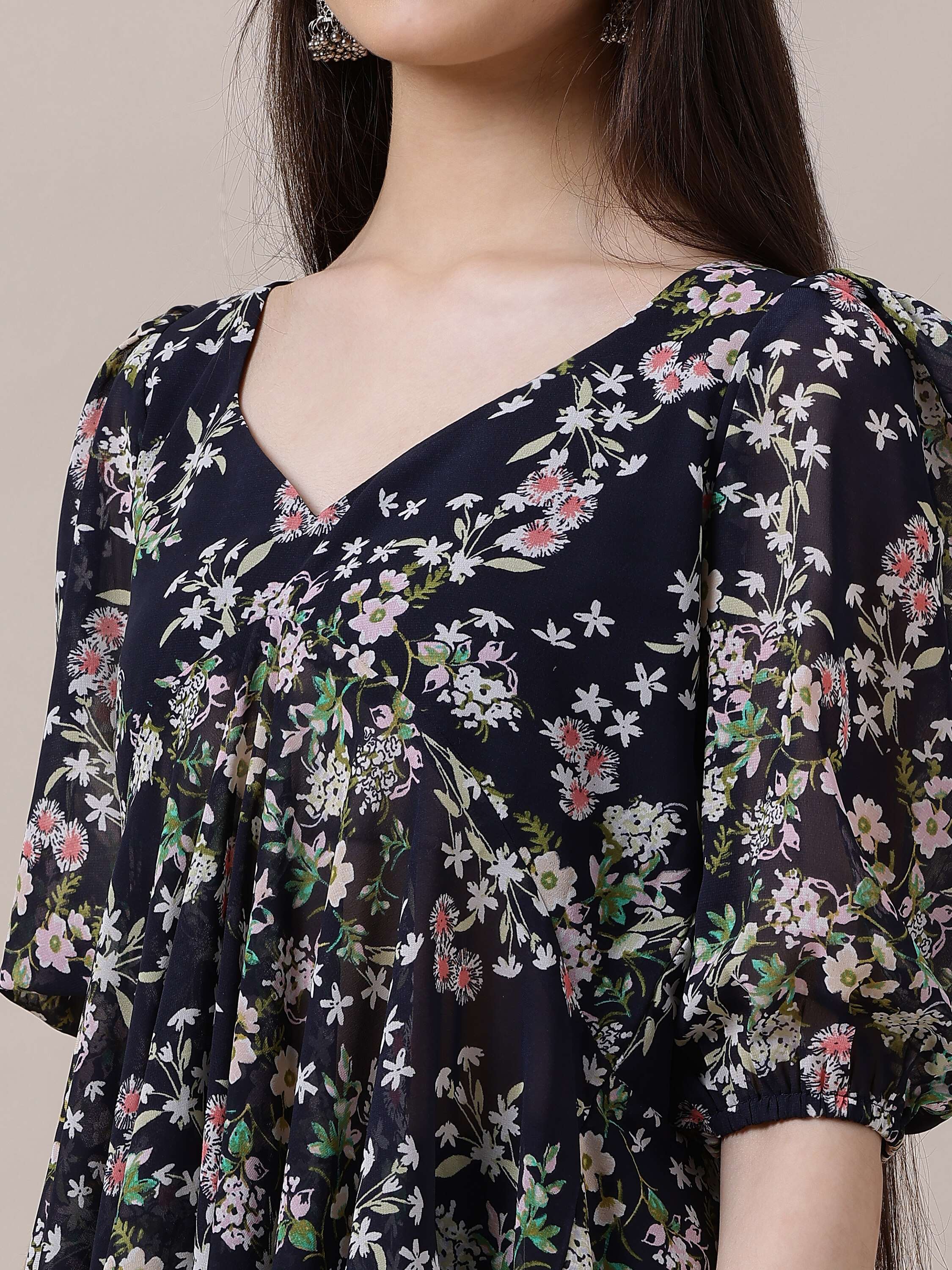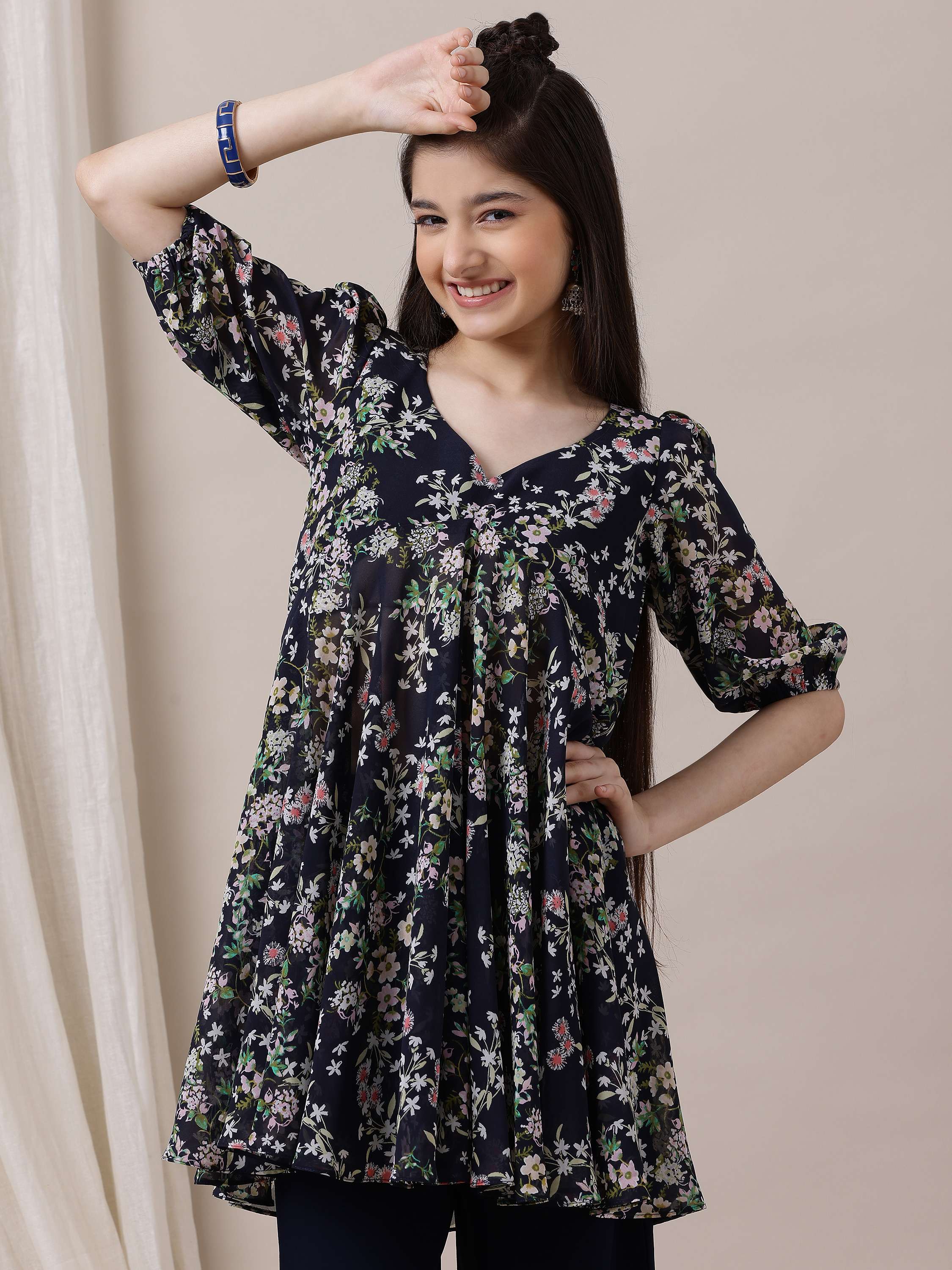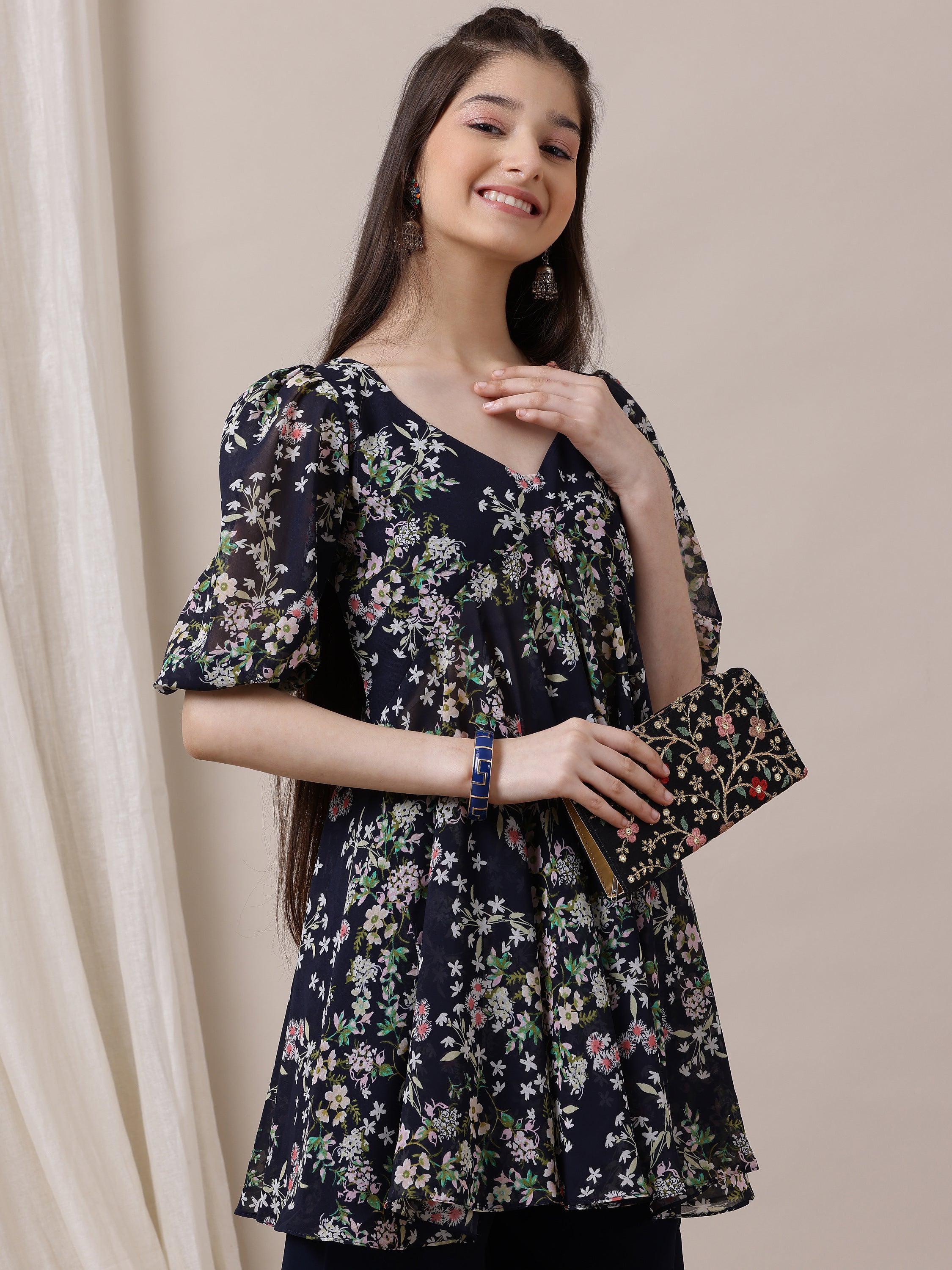 Discover the perfect fusion of style and comfort with our Navy Blue Floral Printed Kurta paired with Solid Palazzos. The A-line silhouette and empire style accentuate your figure, while the printed georgette fabric provides a soft and flowy fit. The partially elasticated waistband ensures a comfortable and secure fit.