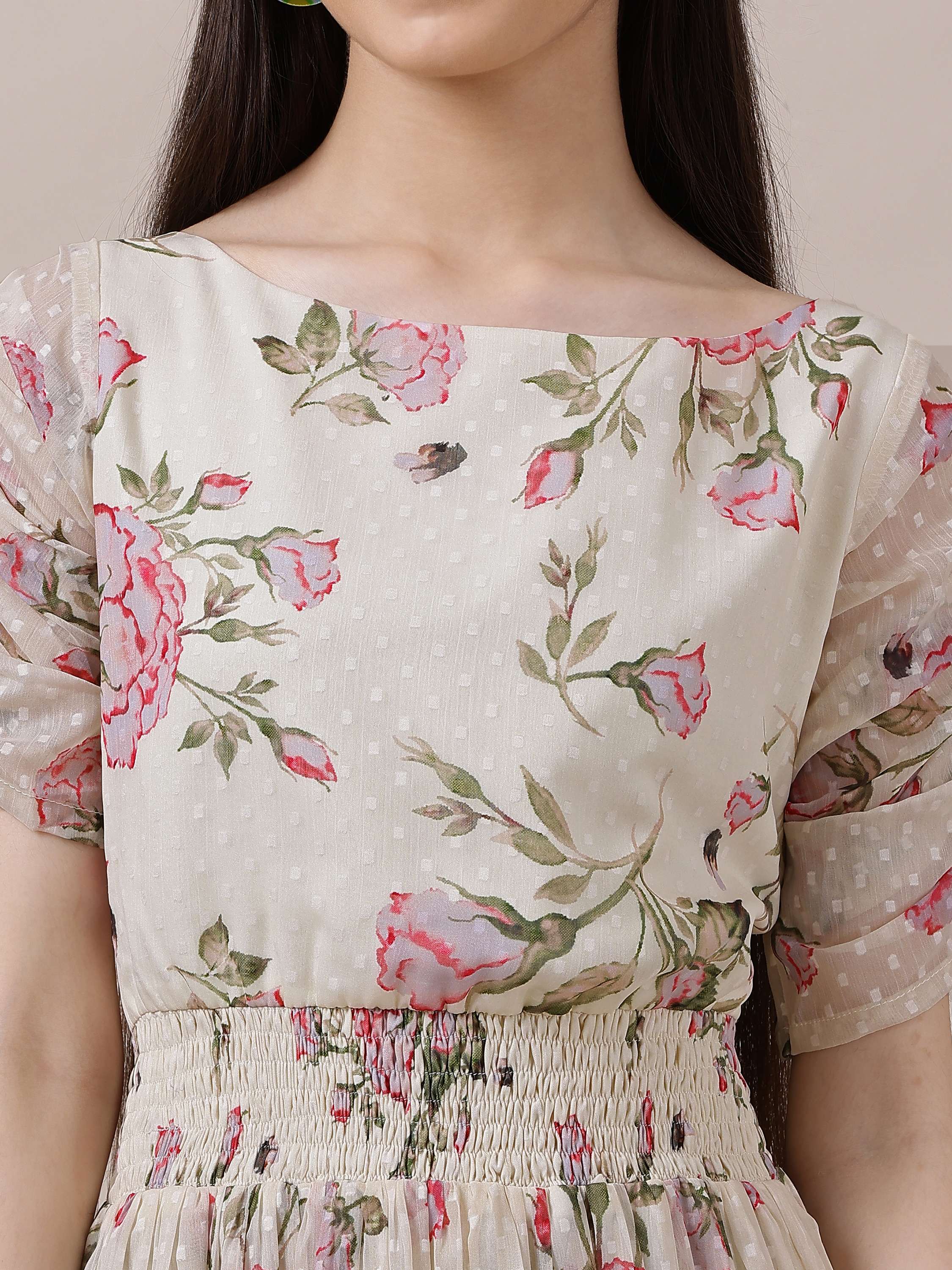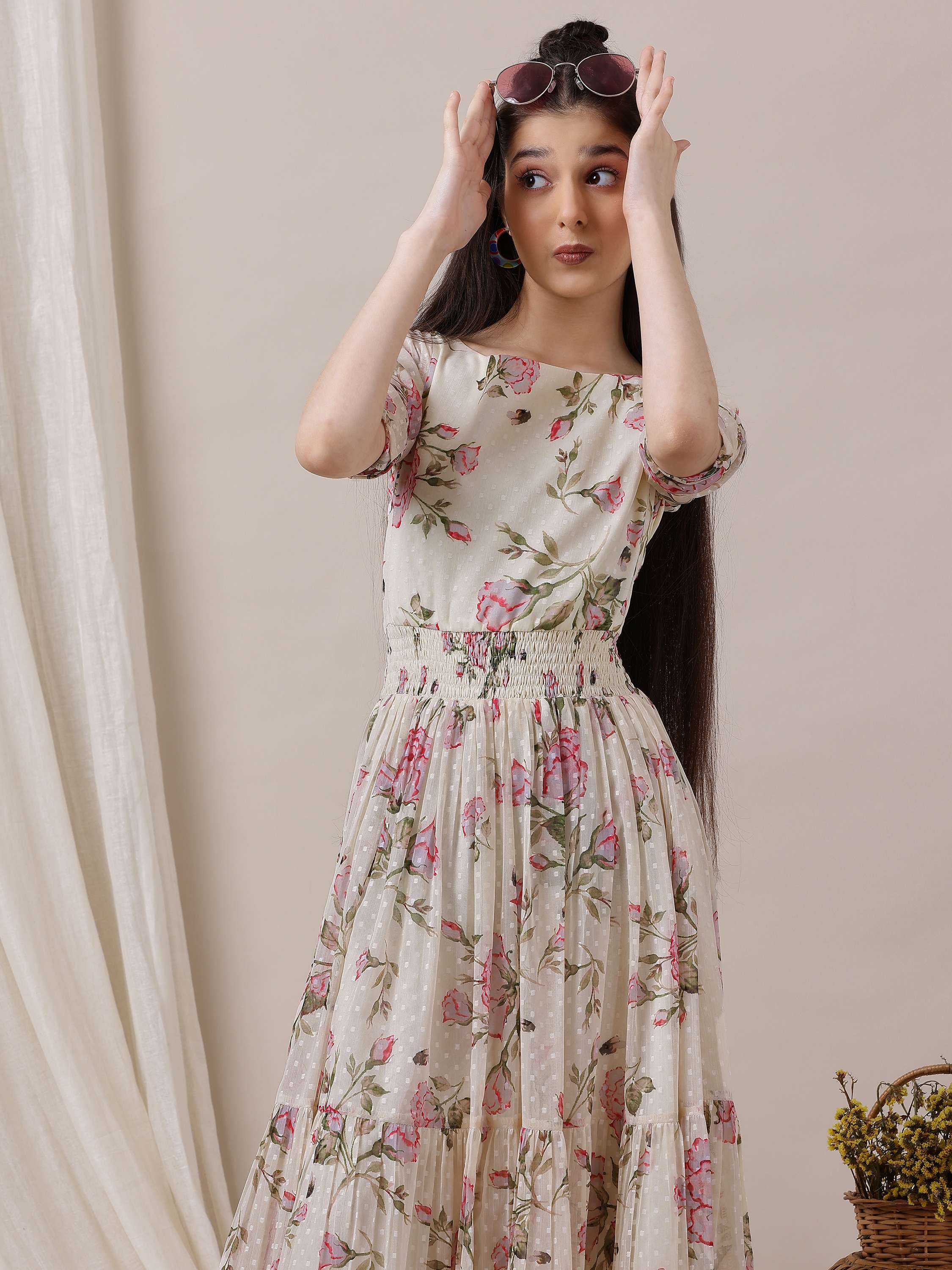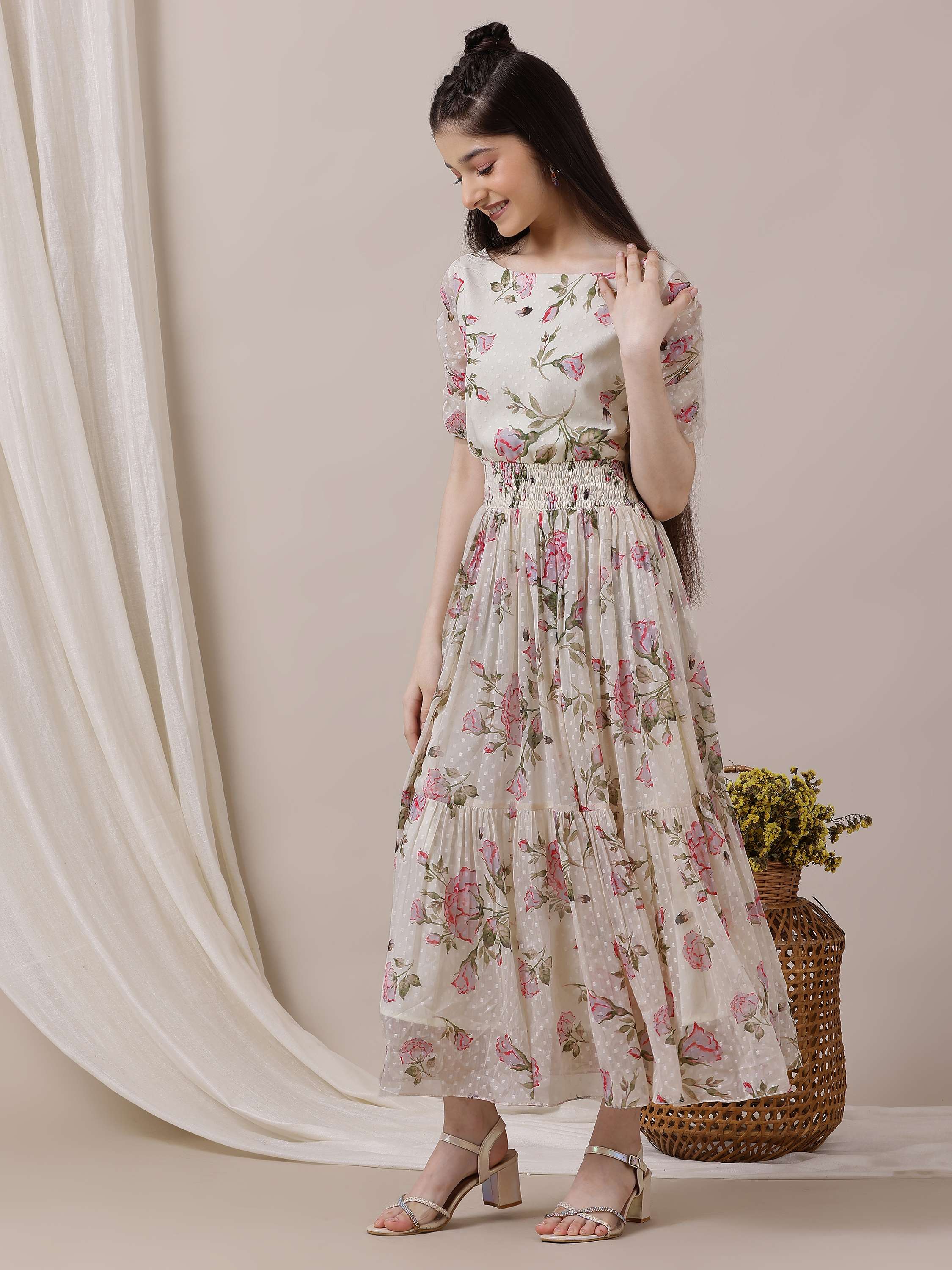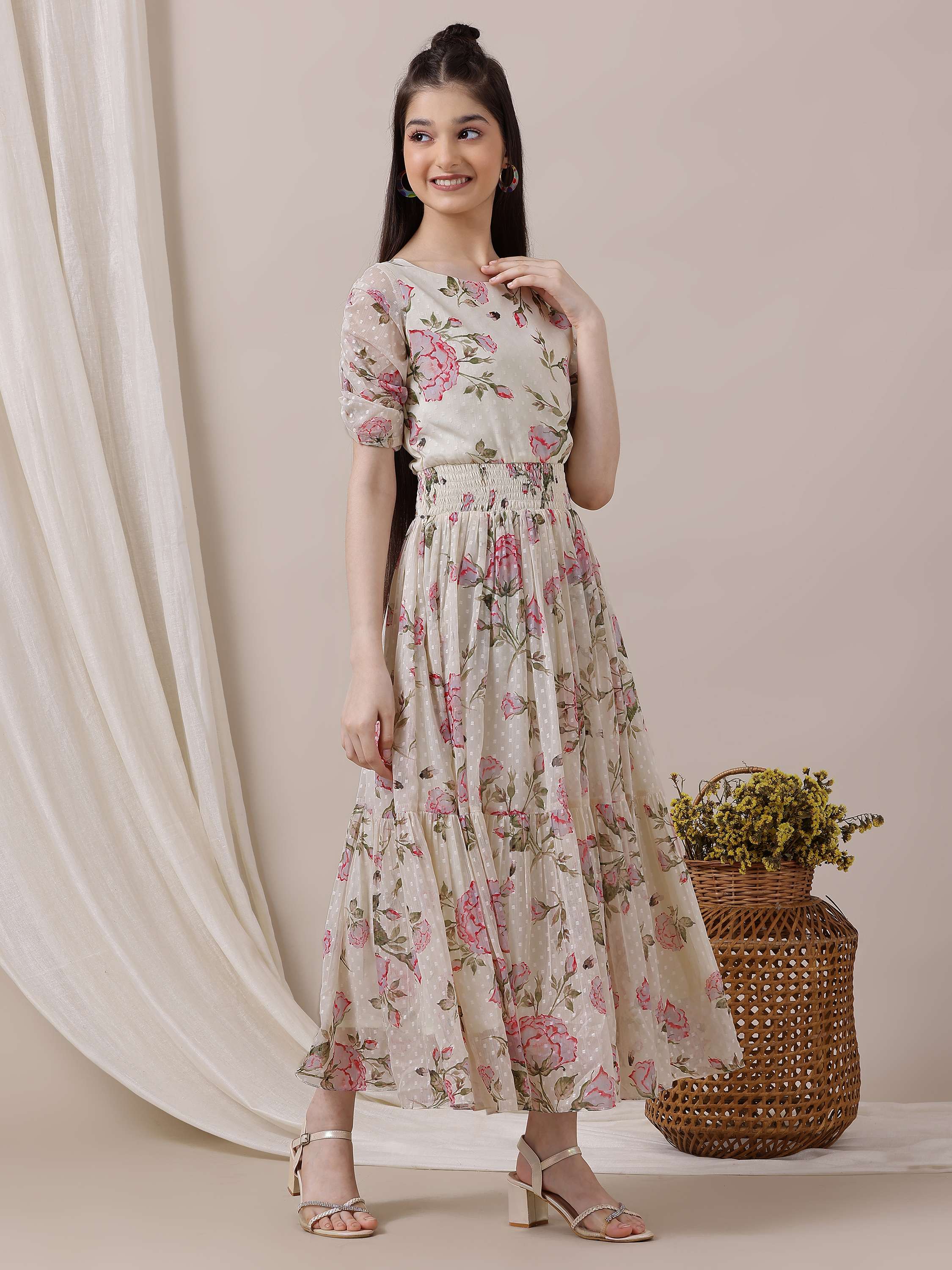 Expertly crafted with a unique cream-colored and green ethnic print, this Girls Floral Printed Ethnic Dress is sure to make a statement. The A-line shape and flared hem create a flattering silhouette, enhanced by the waist belt. With a comfortable round-neck, short sleeves, and easy slip-on closure, this dress is perfect for any occasion.