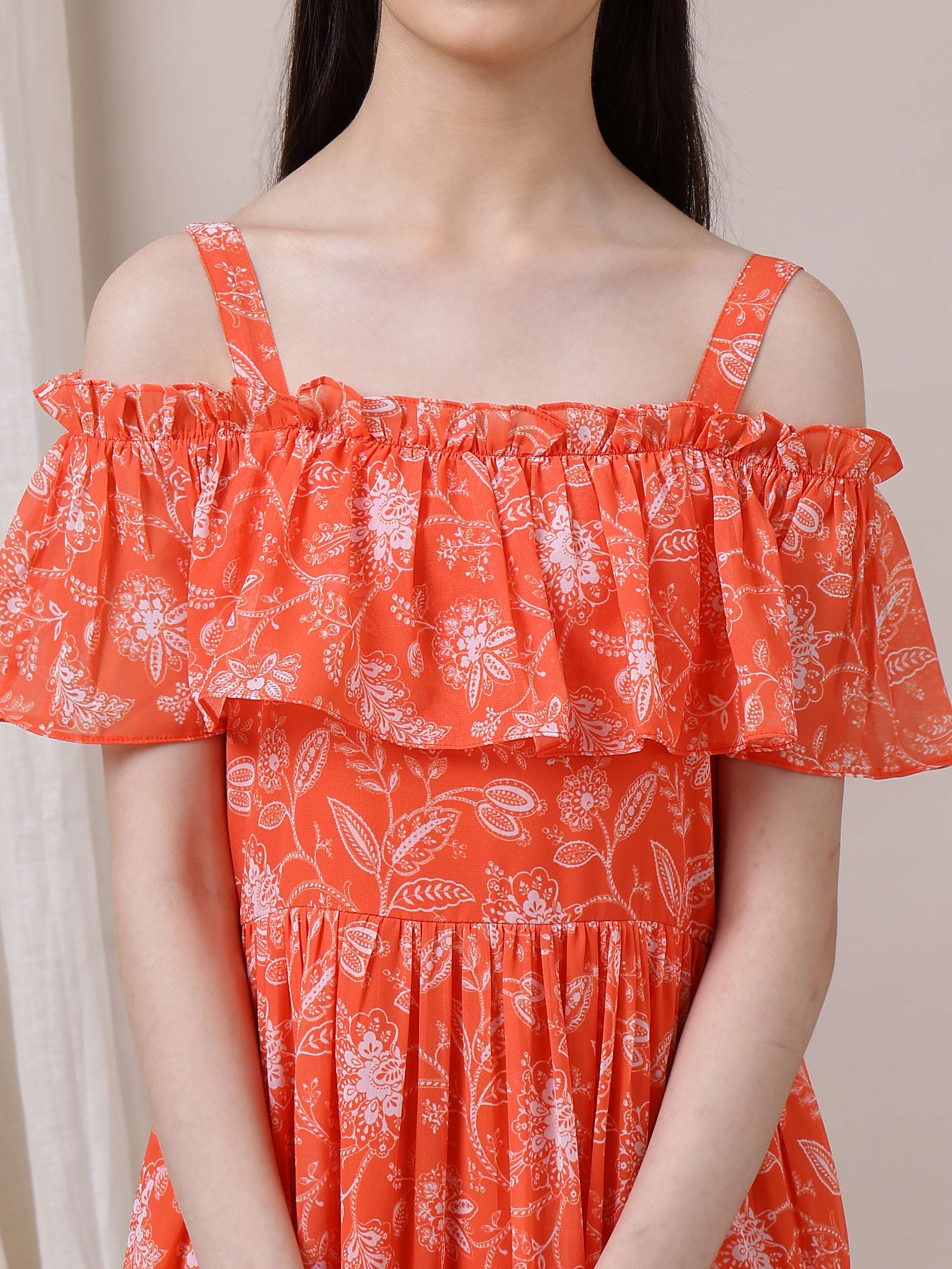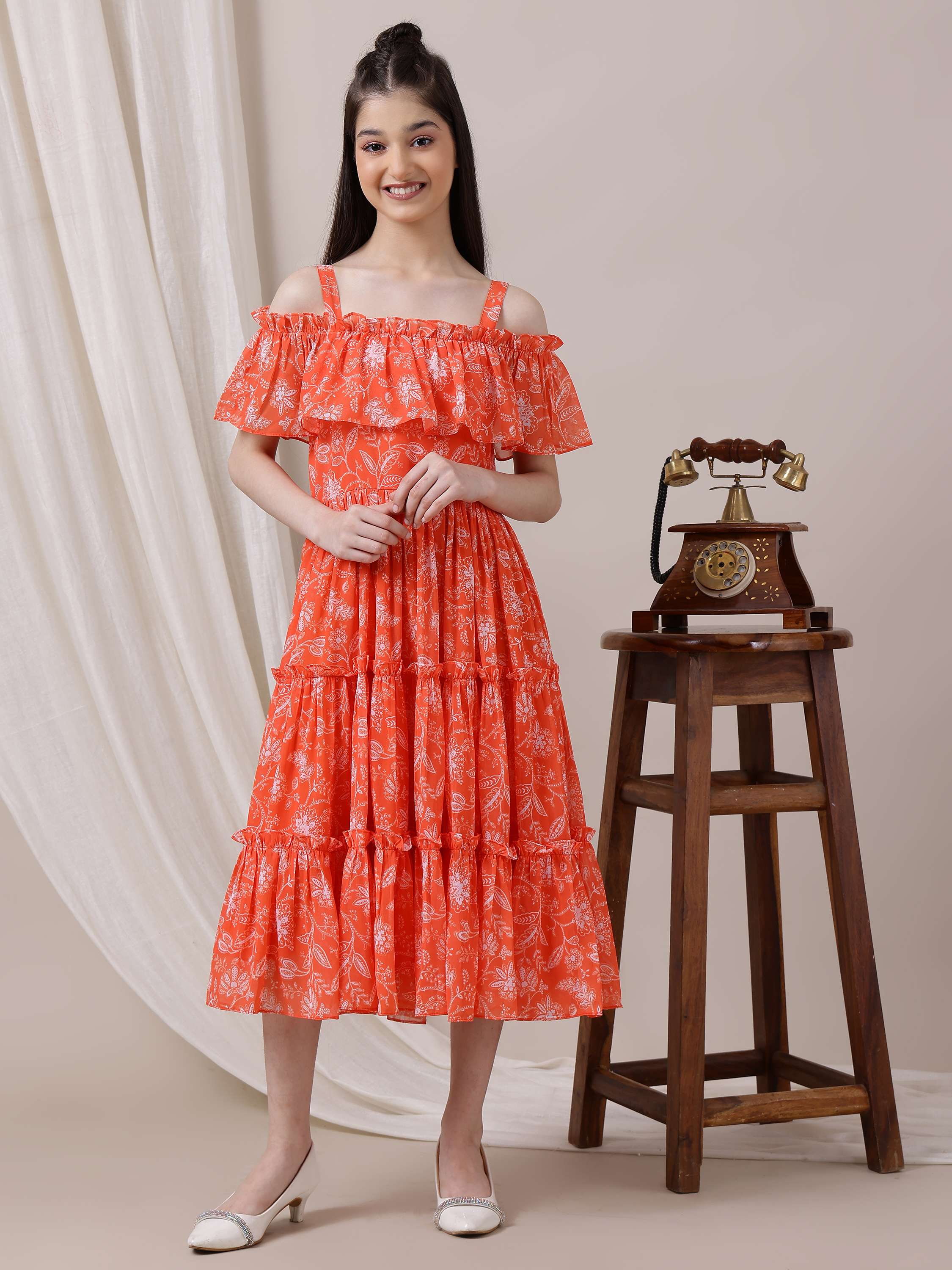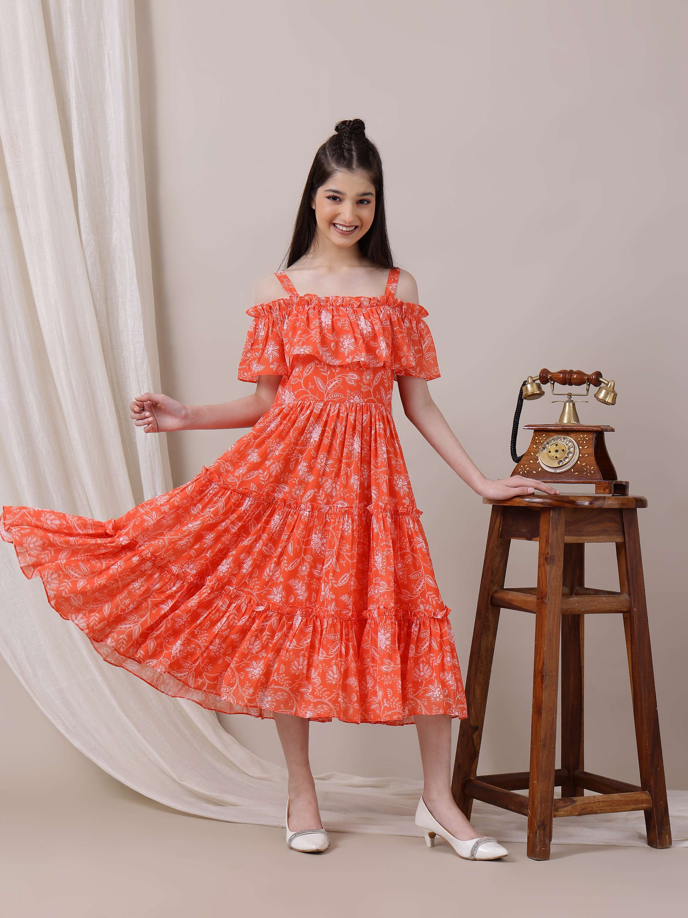 This Girls Floral Printed Fit and Flare Ethnic Dress is a perfect addition to any girl's wardrobe. Adorned with orange and white floral prints, it features a ruffle detailed neck, short sleeves, and a flared hem for a charming look. Made of georgette material, it is lightweight, comfortable and can be easily put on with its slip-on closure. It also requires low maintenance with just a dry clean.