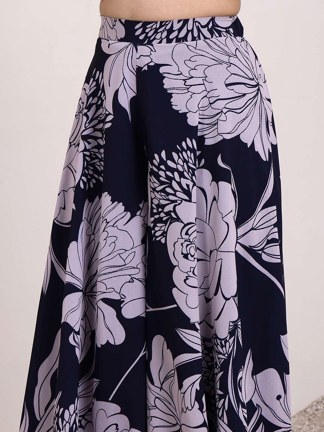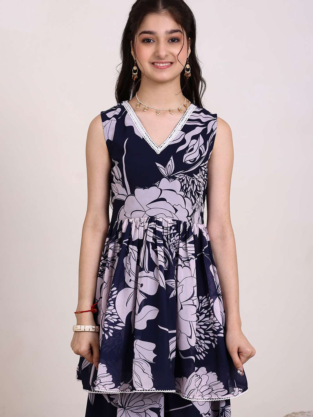 Expertly crafted with navy blue and grey georgette fabric, this girls' kurta set features a stunning floral print and elegant pleated design. The V-neck and sleeveless silhouette are accentuated by gotta patti detailing, while the flared hem and A-line shape provide a flattering fit. The included printed palazzos with a partially elasticated waistband complete the outfit with comfort and style. Perfect for celebrations, festivals, and special occasions. Material & Care Kurta: Georgette Trousers: Georgette Dry Clean