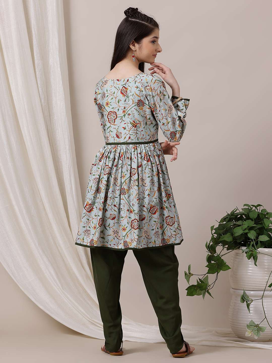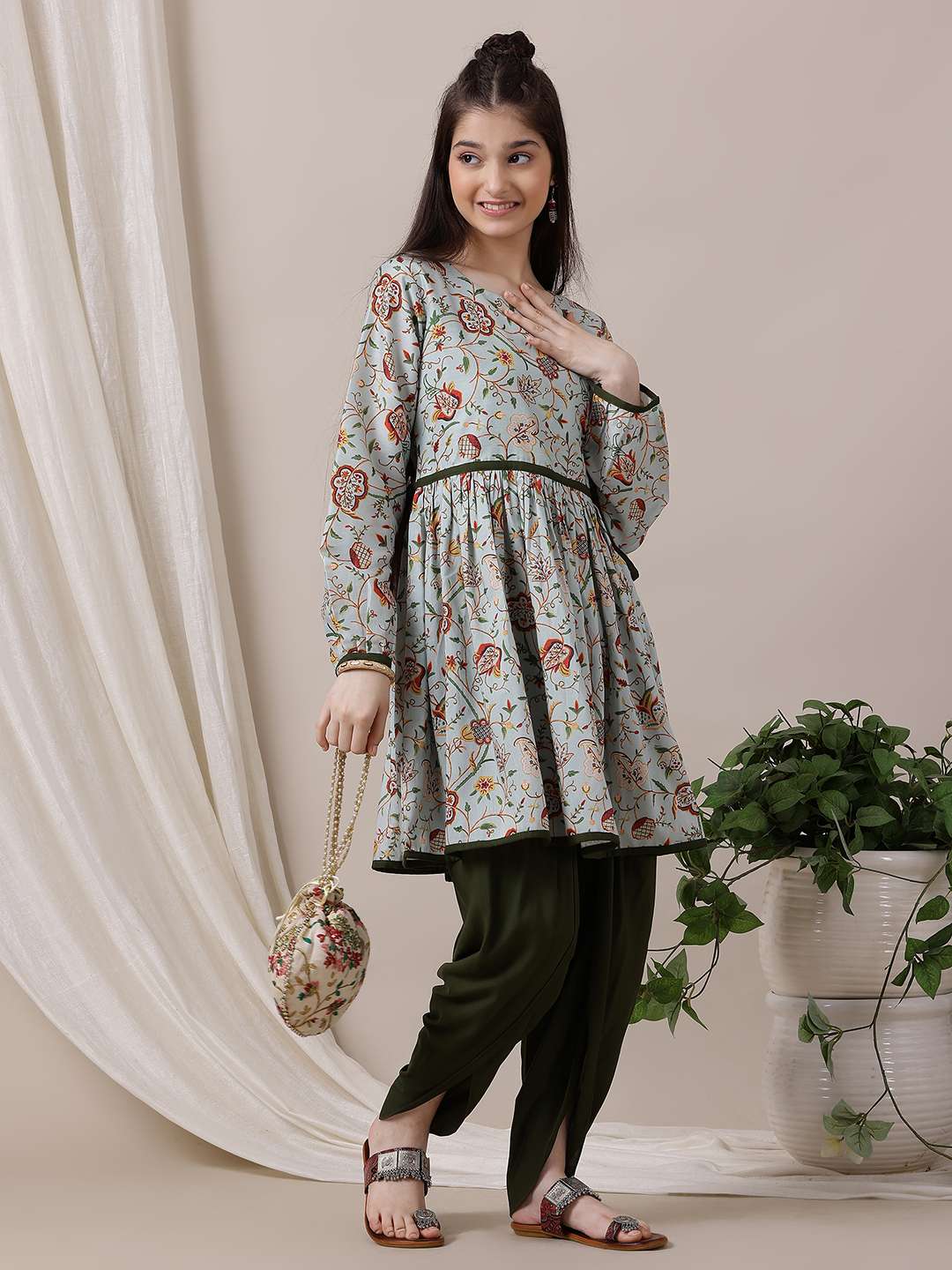 Expertly designed for comfortable and stylish wear, the Girls Floral Printed Pleated Kurta with Dhoti Pants features a beautiful floral print, A-line shape, and pleated style. The cotton blend fabric ensures breathability and a machine weave ensures durability. The solid Dhoti Pants have a partially elasticated waistband for easy wear and a slip-on closure for convenience. Perfect for any occasion.