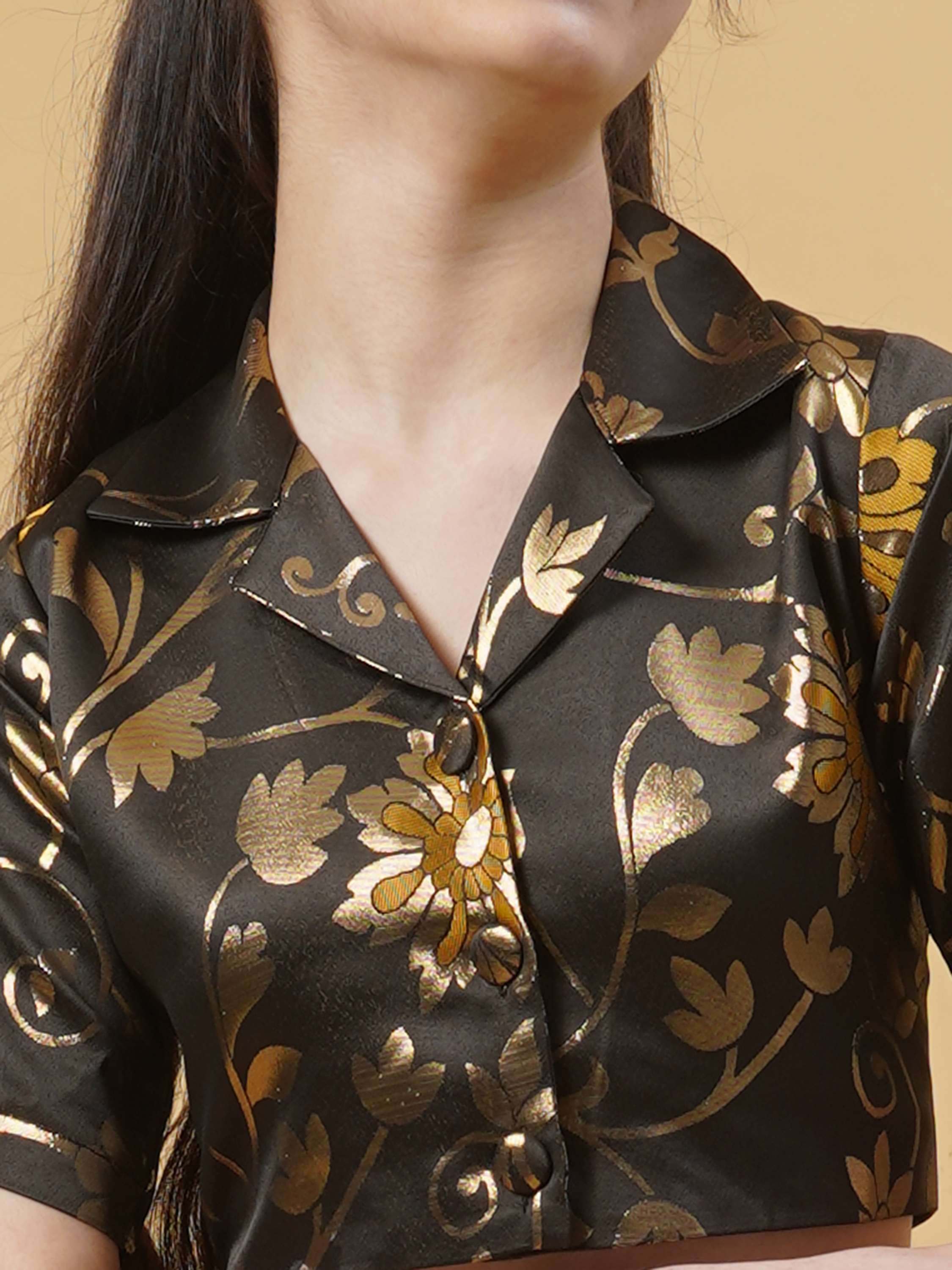Expertly crafted with a stunning brown, yellow, and gold-toned woven design, this Girls Floral Printed Ready to Wear Lehenga brings a bold and beautiful touch to any special occasion. The accompanying blouse features a flattering shirt collar and short sleeves, while the flared hem of the lehenga adds a feminine and elegant touch. Made from a luxurious silk blend, this lehenga can easily be dry cleaned to maintain its stunning appearance. Elevate your wardrobe with this ready-to-wear ensemble.