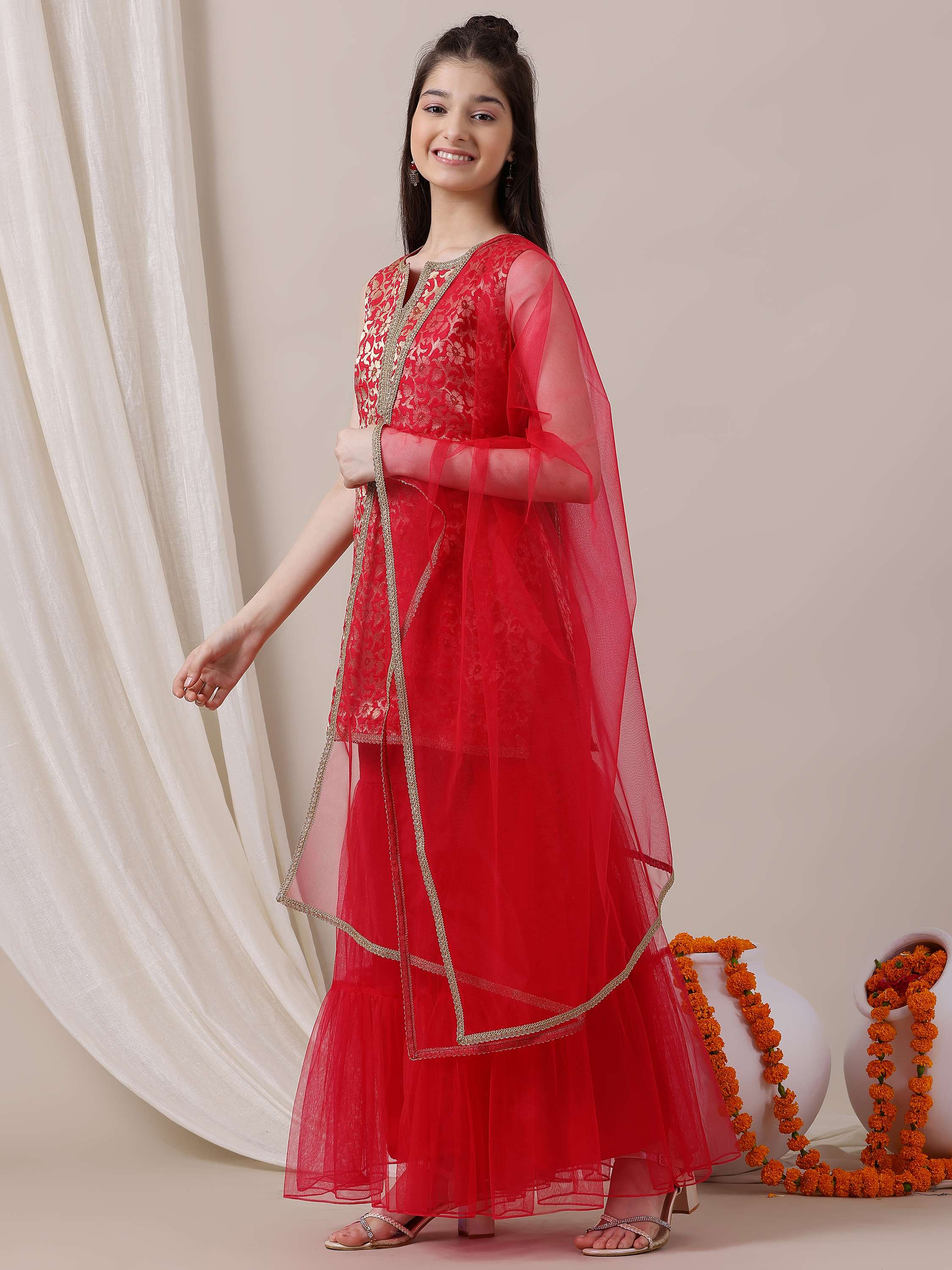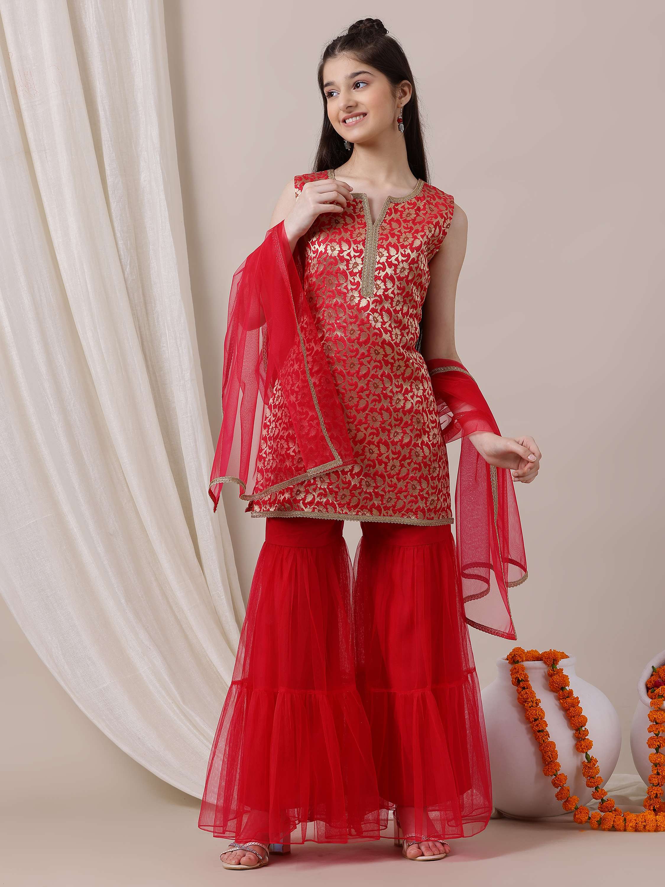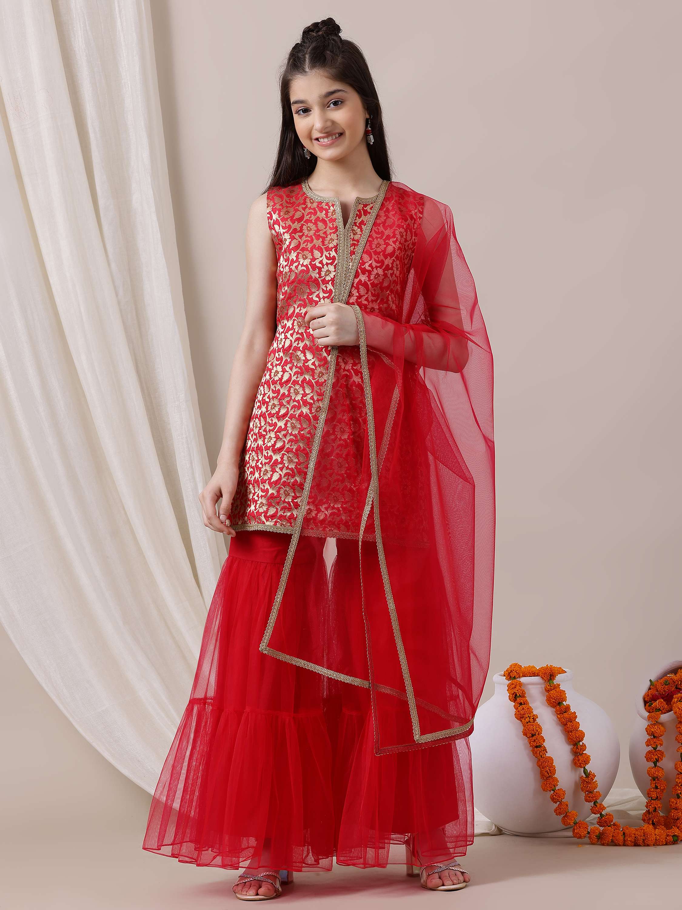 Expertly designed for your little girl, this Magenta Kurta with Sharara & Dupatta set is the perfect addition to her wardrobe. Made with a silk blend fabric, the floral woven design and zari detailing add a touch of elegance. The Sharara features an elasticated waistband for comfort and the matching Dupatta completes the look. Dry clean only.