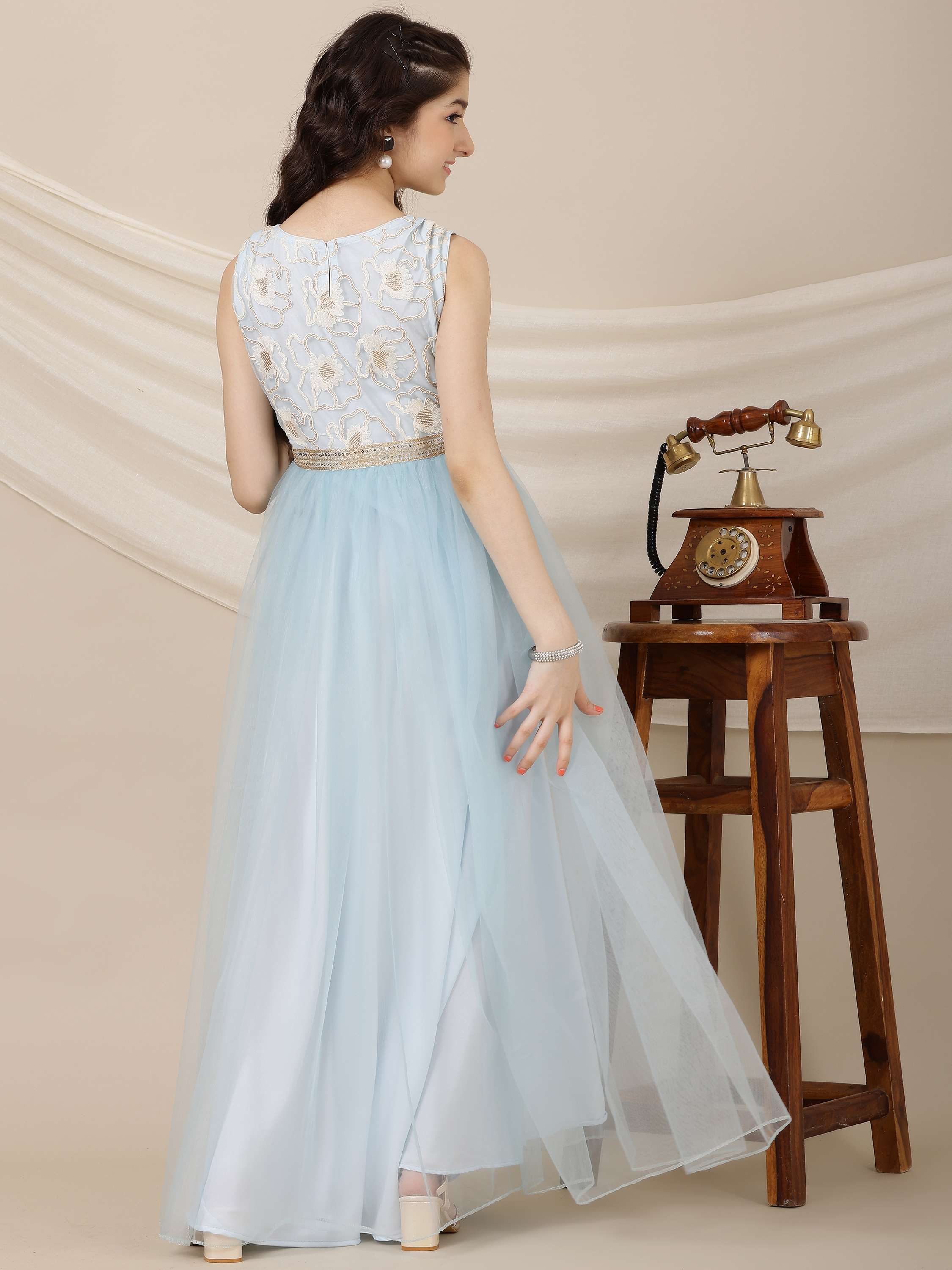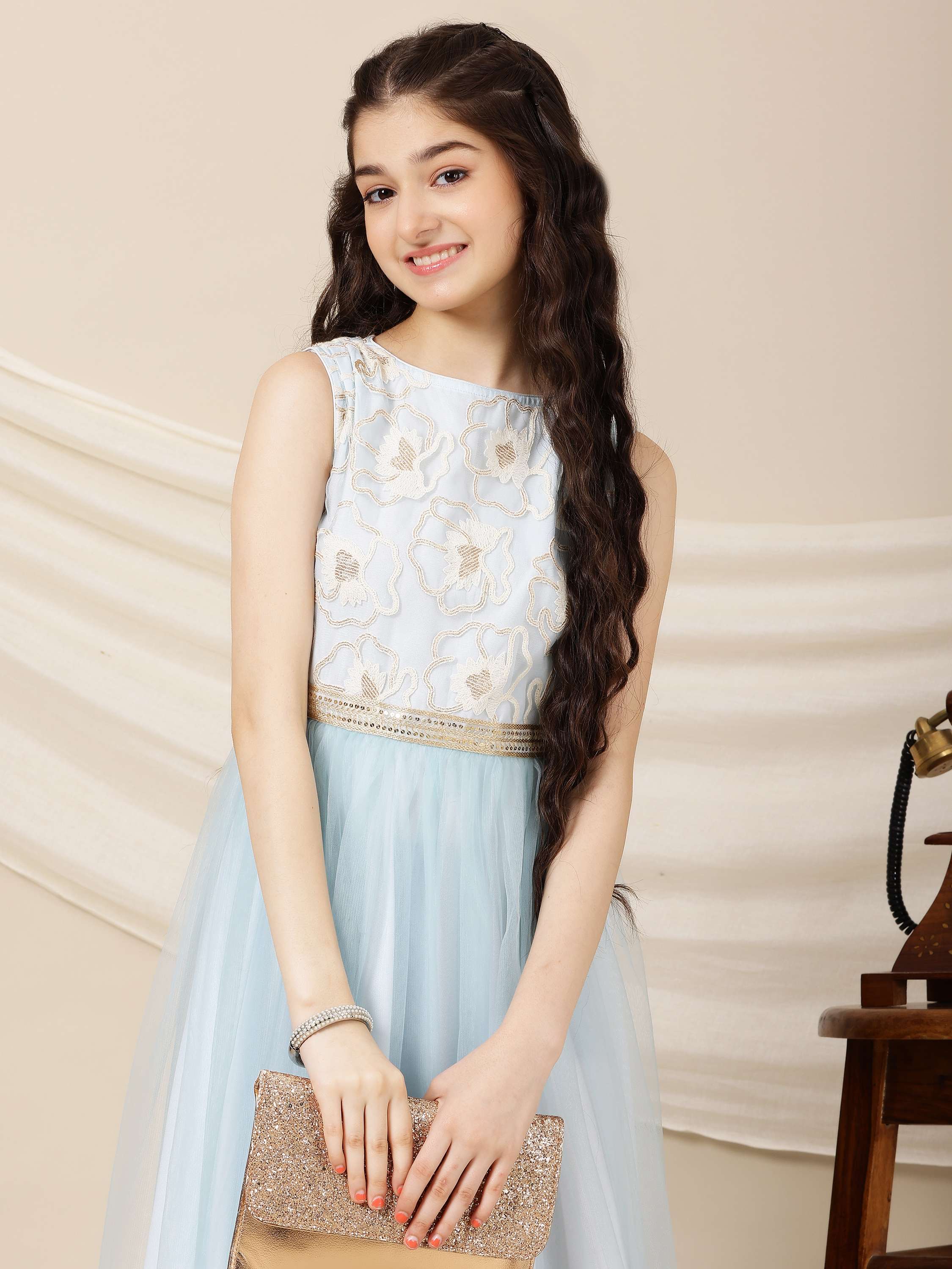 Introduce your little girl to the vibrant world of fashion with our Girls' Floral Sequined Embroidered Sleeveless A-line Maxi Ethnic Dresses! This blue and white dress features delicate floral embroidery and a flattering A-line shape. The waist belt accentuates the silhouette, while the round neck and sleeveless design offer comfort. A flared hem and concealed zip closure complete the look. Perfect for any occasion!