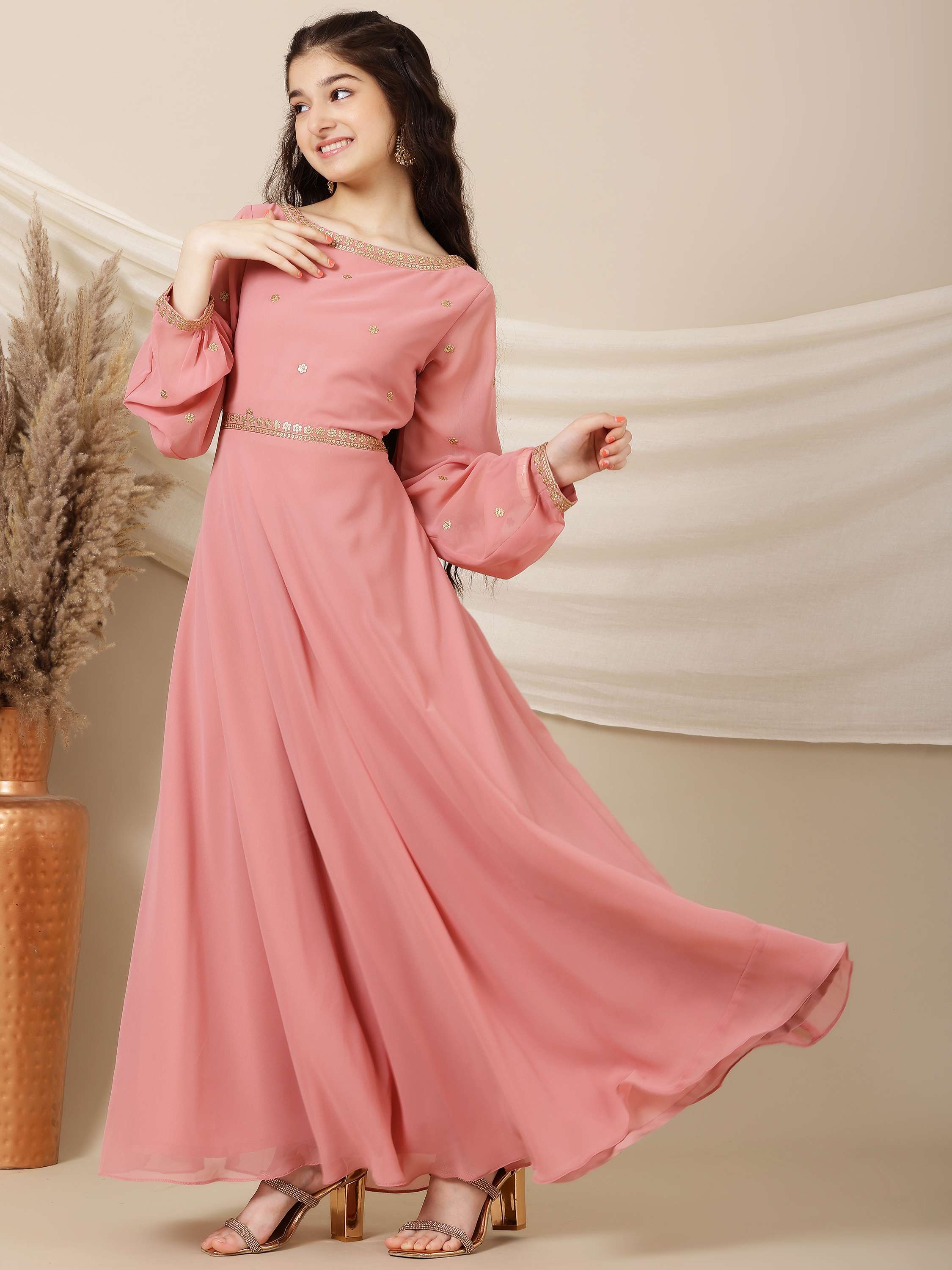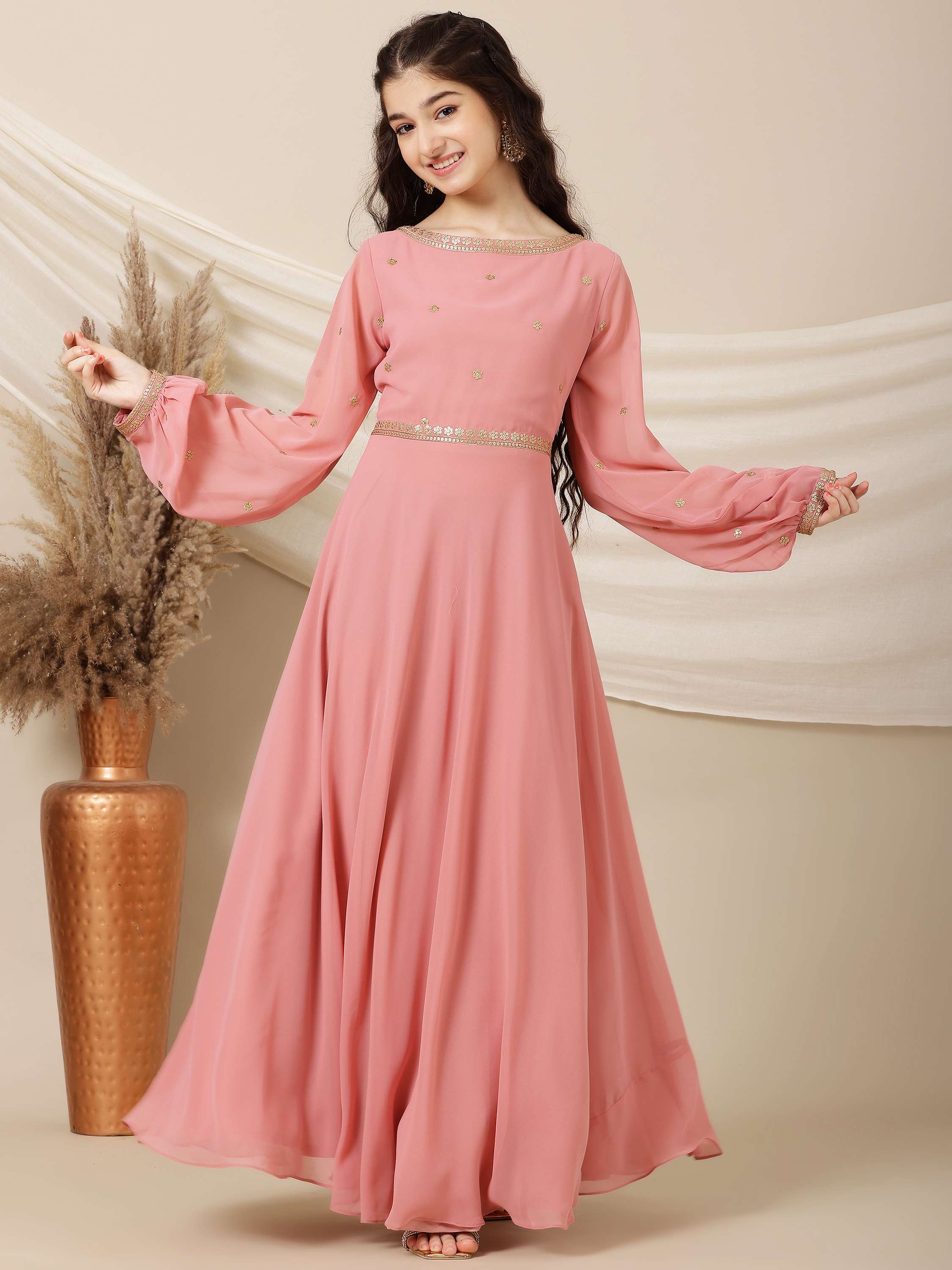 This Girls Floral Sequinned Embroidered A-Line Ethnic Dress features beautiful pink floral sequinned embroidery, creating a stunning printed design. The A-line shape, boat neck, and long sleeves add to the dress's elegant look. The flared hem and convenient zip closure make it comfortable and easy to wear. Perfect for any special occasion, this dress combines ethnic style with modern design.