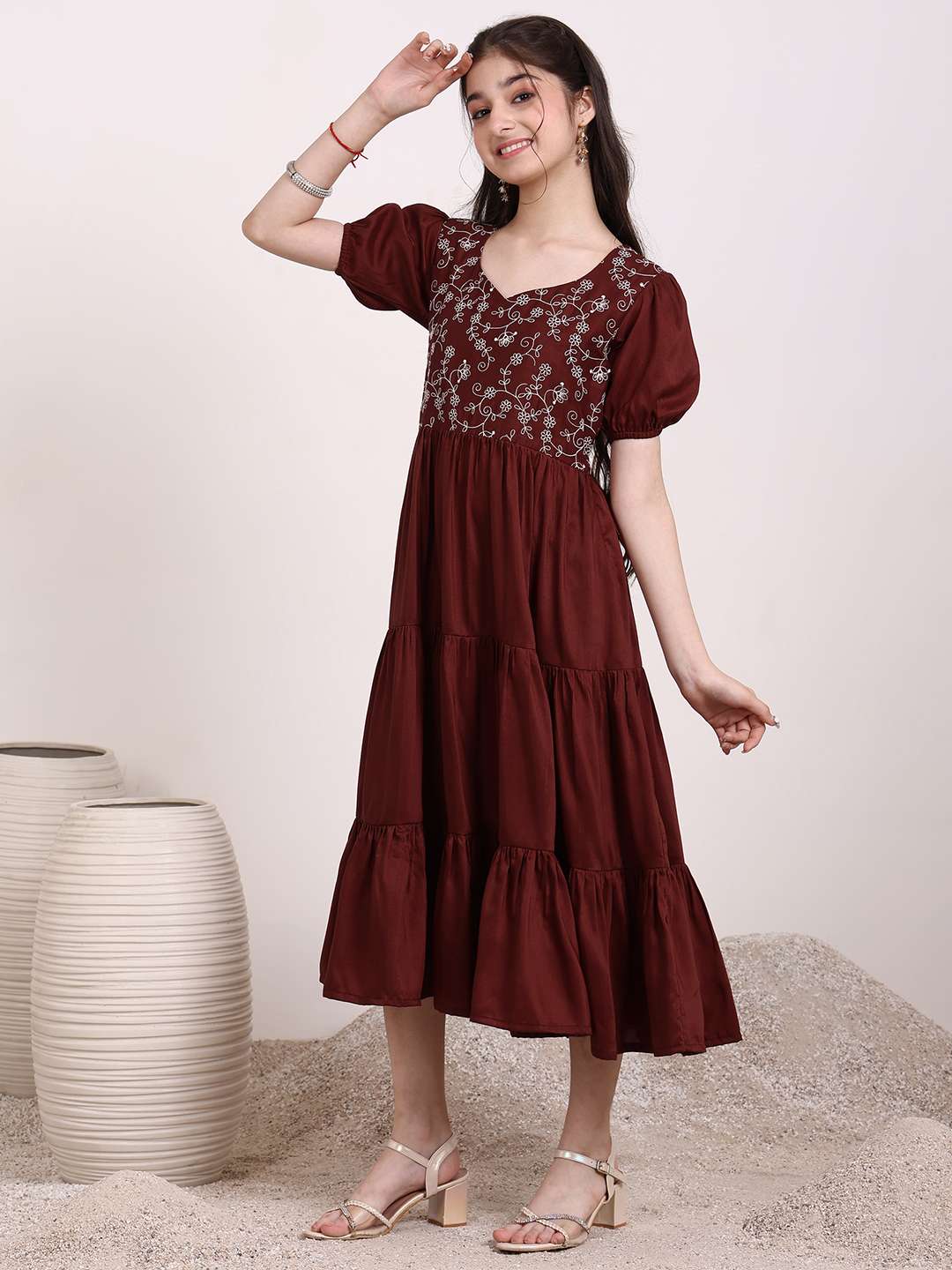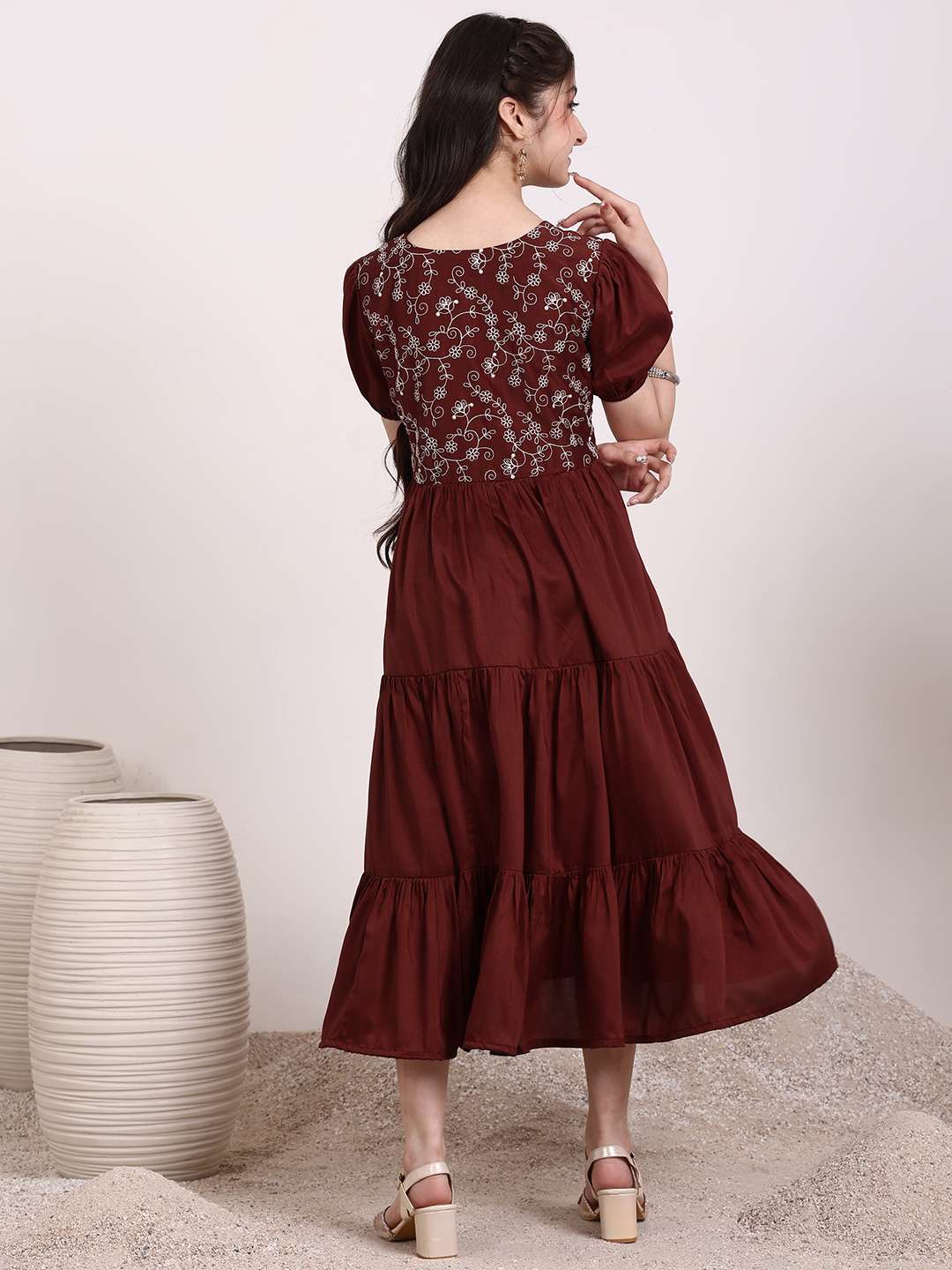 This maroon ethnic dress features a beautiful floral embroidered yoke and an A-line shape for a flattering fit. The geometric neckline and short puffed sleeves add a touch of unique style. With a slip-on closure and tiered surface, this dress is both comfortable and fashionable.