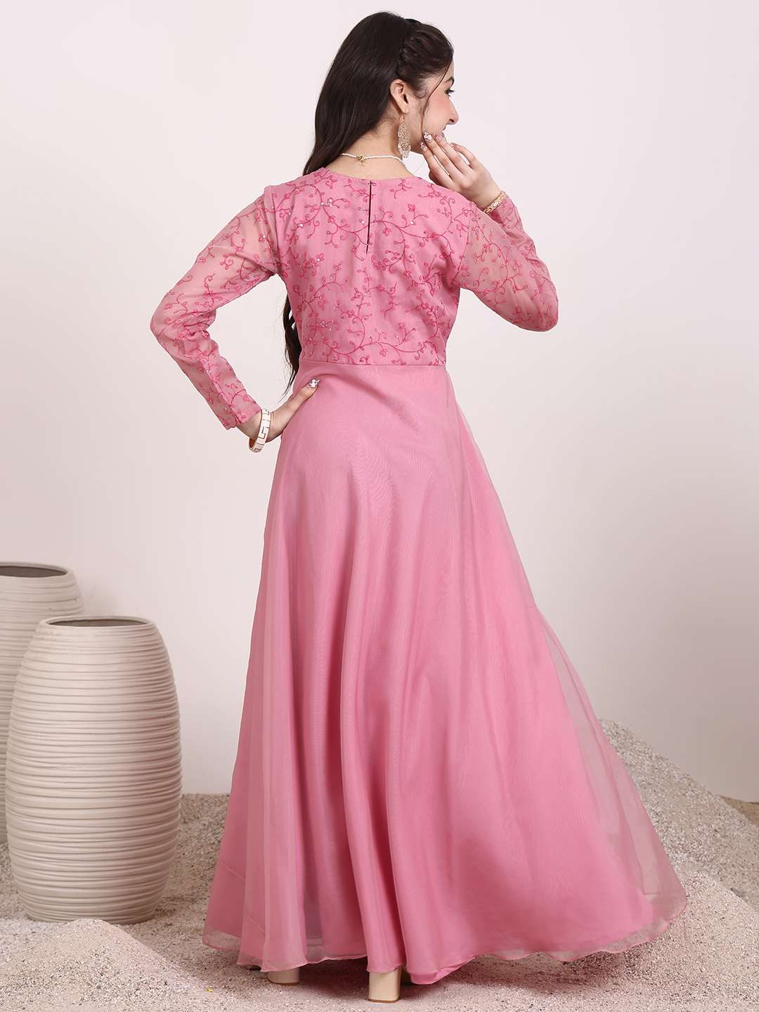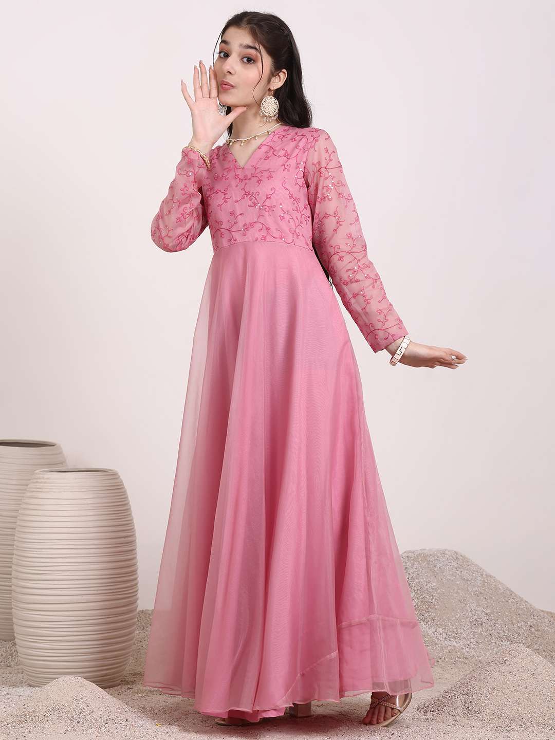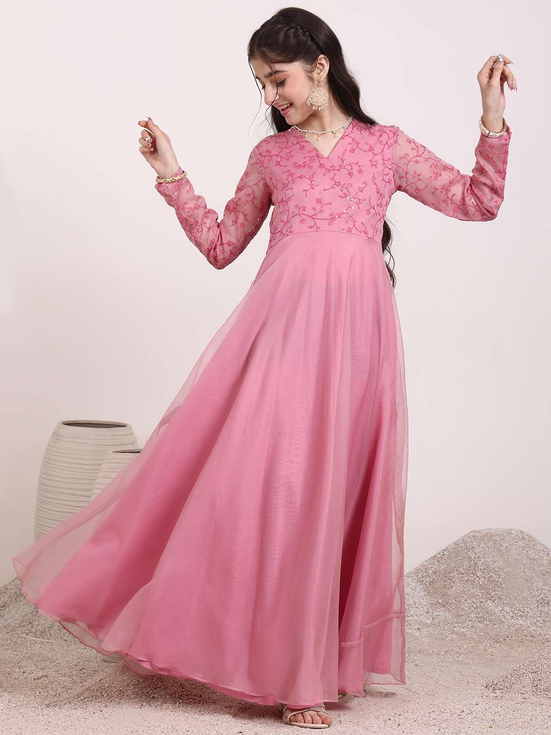 Expertly designed for maximum comfort and style, the Girls Floral Thread & Sequinned Embroidered A-Line Maxi Ethnic Dress combines the vibrant hues and intricate floral embroidery of traditional ethnic wear with the modern simplicity of an A-line silhouette. Featuring a V-neckline and long regular sleeves, this slip-on dress is perfect for any occasion.