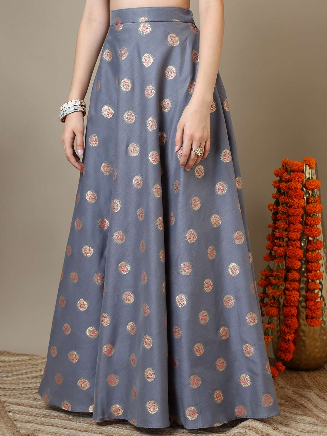 Grey and gold toned woven design ready to wear lehenga, has slip-on closure, flared hem