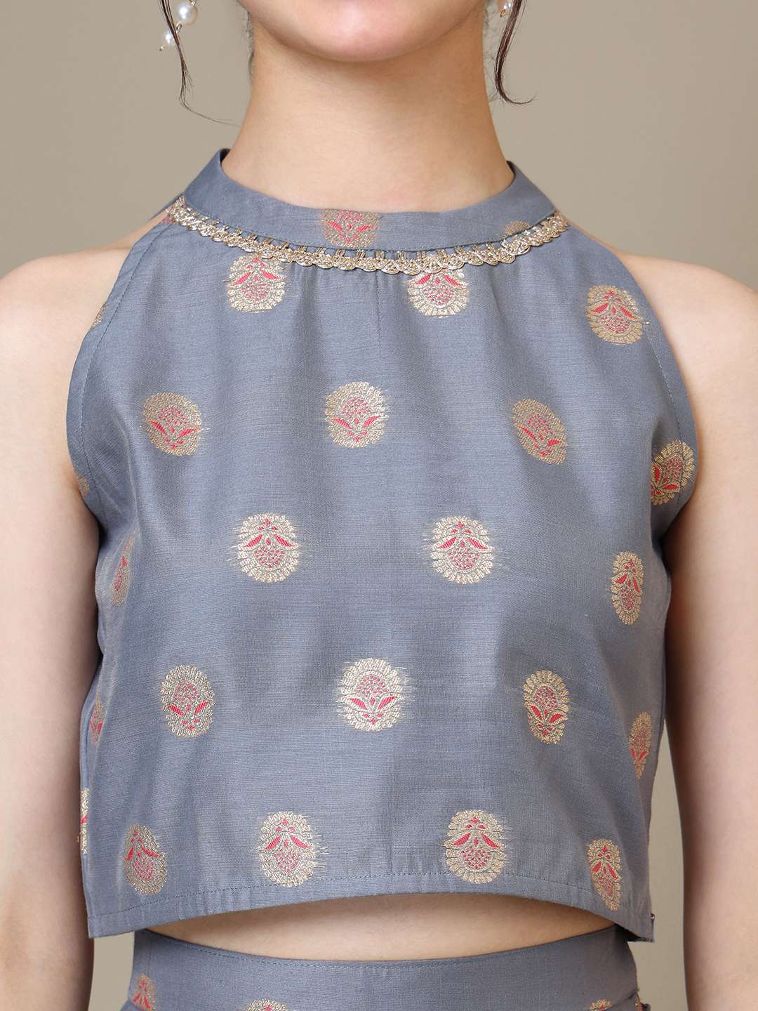 Grey and gold toned woven design ready to wear blouse, has a halter neck, sleeveless, slip-on closure