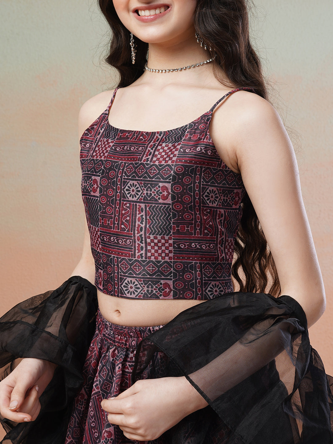 This maroon printed lehenga choli with dupatta is the perfect addition to your wardrobe. The ready-to-wear blouse features a round neck and sleeveless design, making it comfortable and easy to slip on. The printed lehenga also has a slip-on closure and flared hem for a flattering fit. Complete the look with the maroon solid dupatta featuring a delicate border. Elevate your style with this beautiful and effortless ensemble.