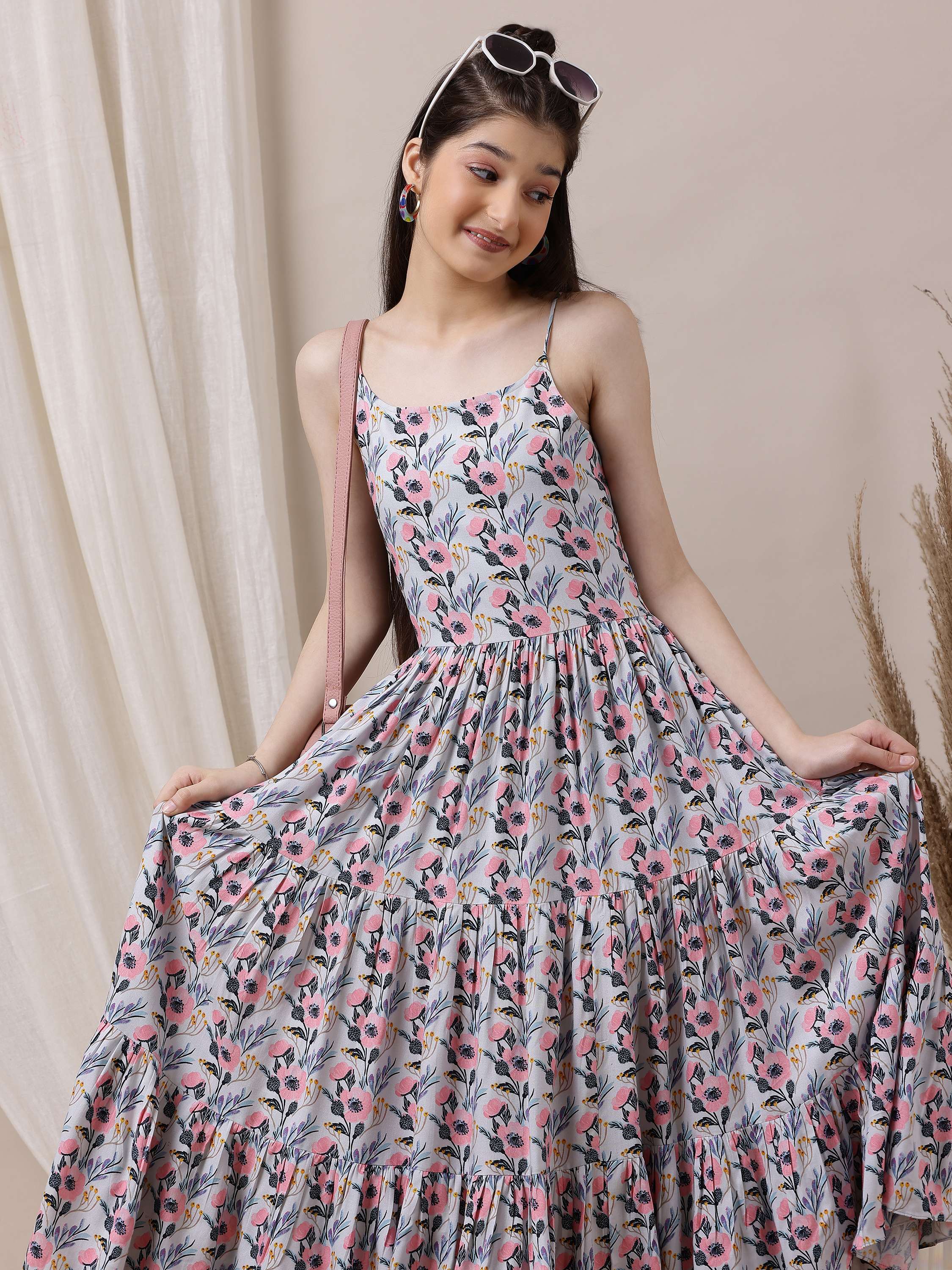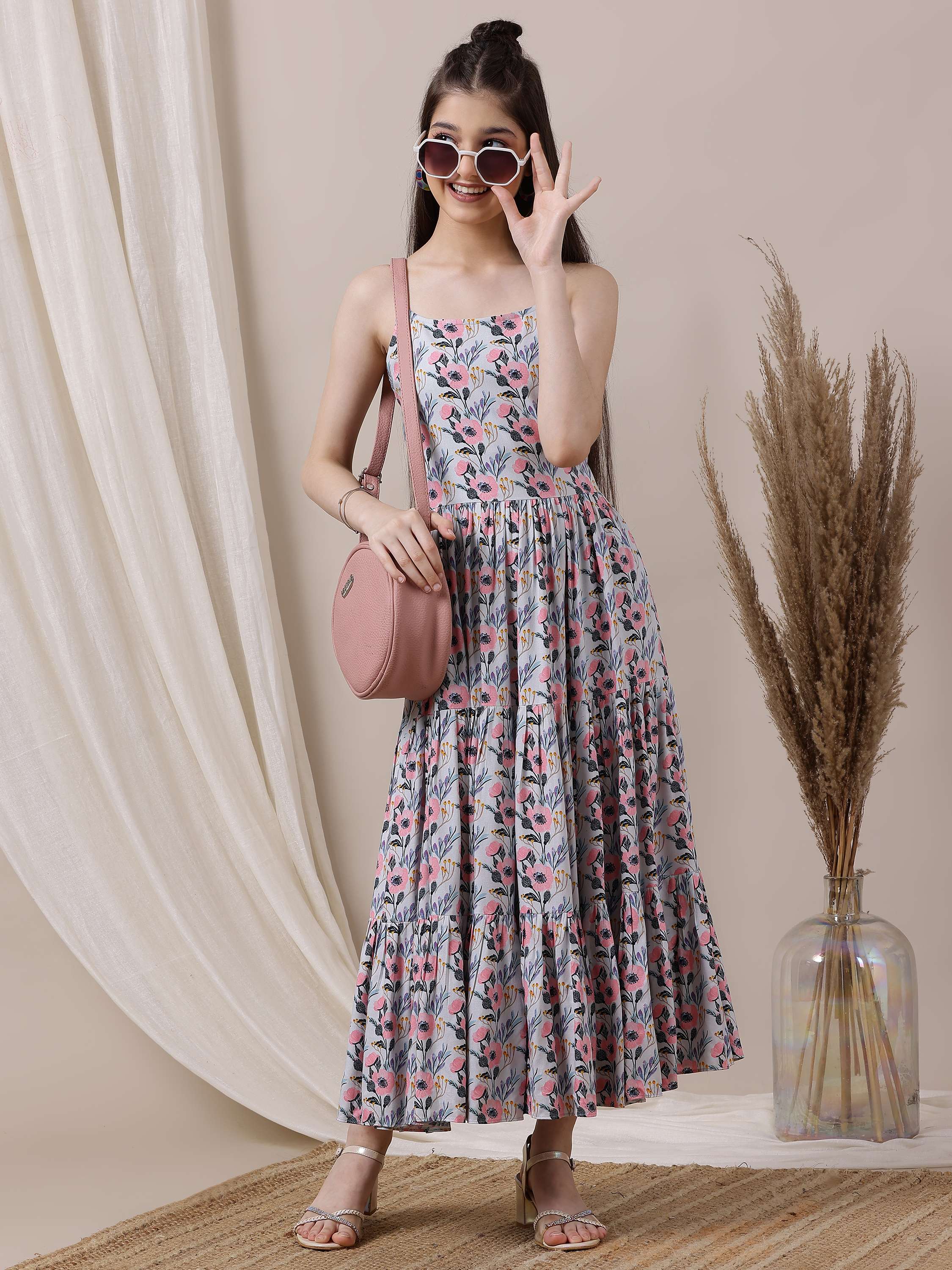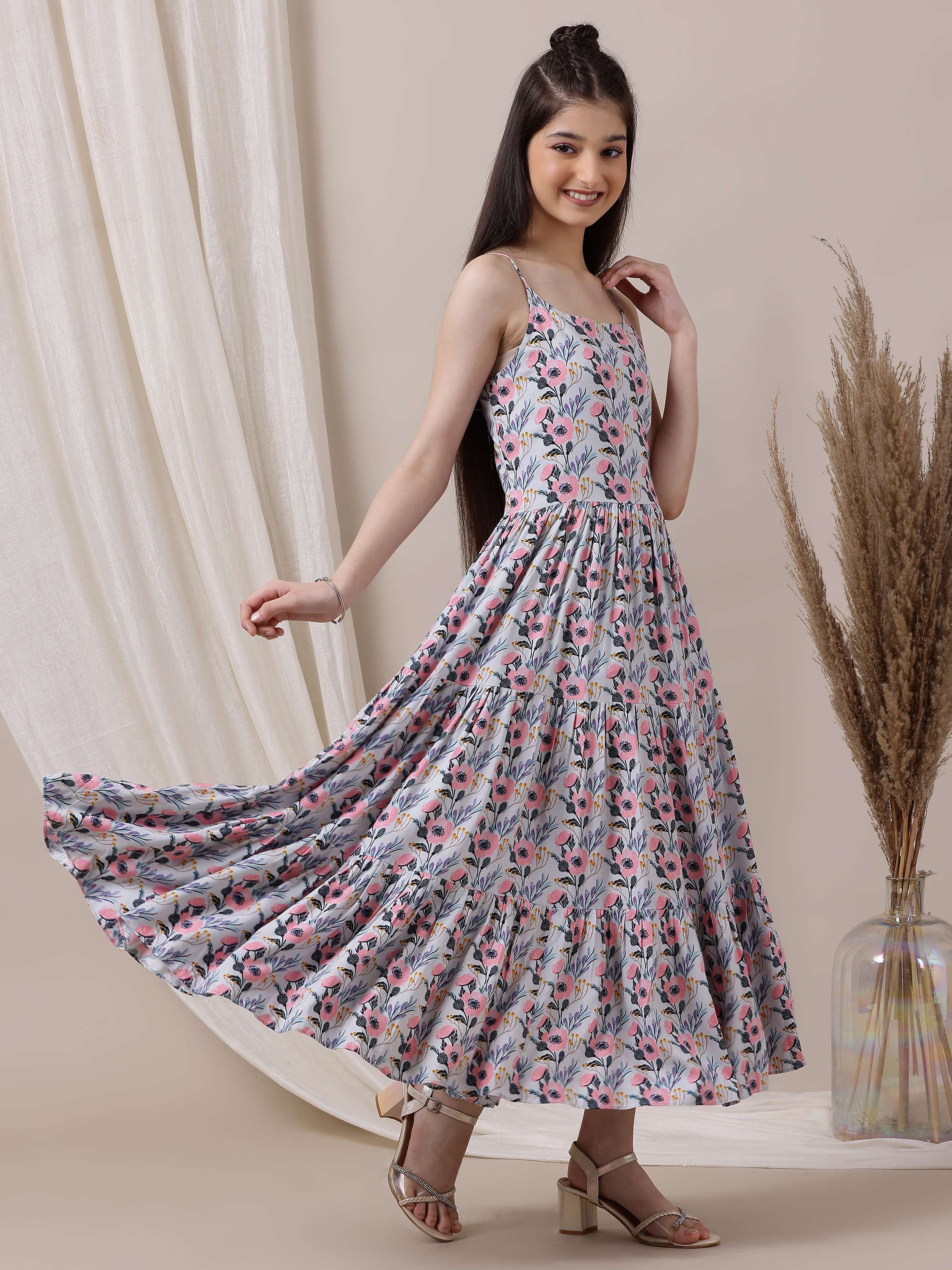 Crafted from high-quality rayon and crepe materials, this Girls Printed Fit & Flared Midi Dress offers both comfort and style. Featuring a beautiful blue and pink ethnic print, a flattering fit and flared shape, and a slip-on closure, this dress is perfect for any occasion. Stay cool with its no-sleeve design and flared hem, and keep it classy with its round-neck and lining. Dry clean for easy maintenance.