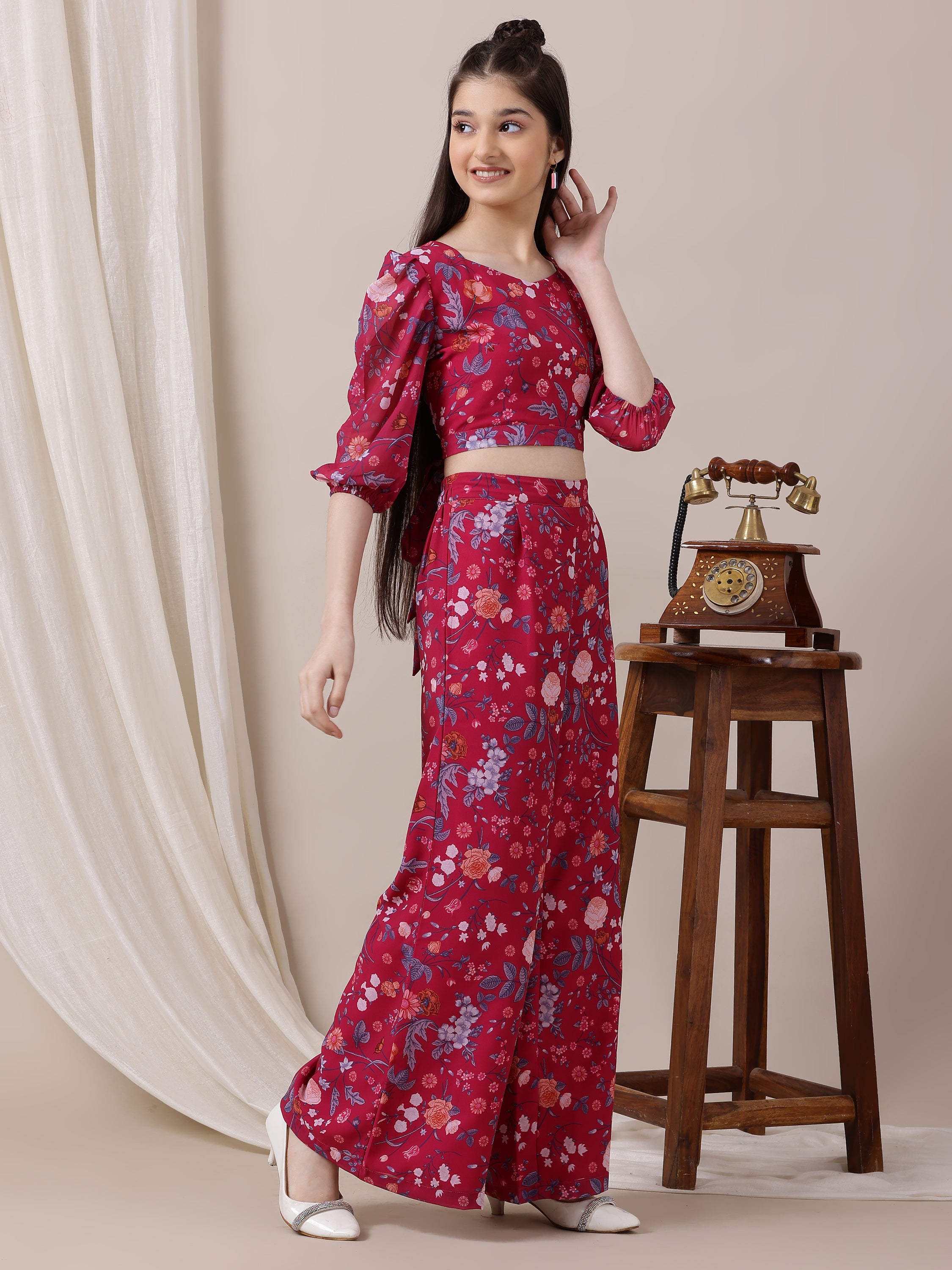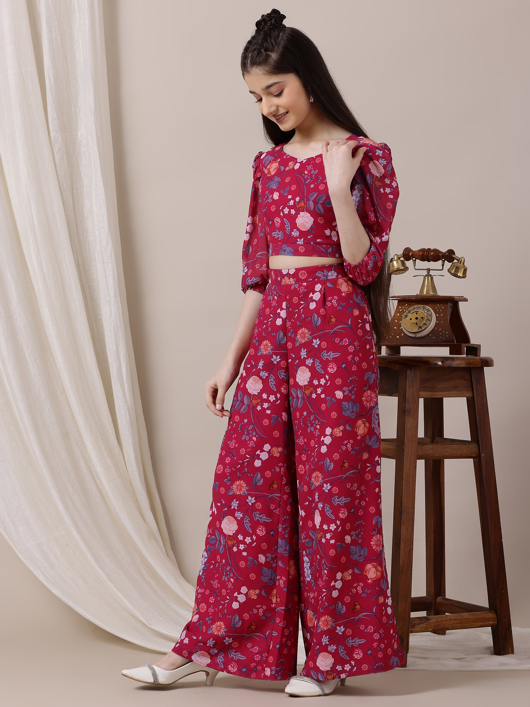 This girls' clothing set includes a v-neck, three-quarter sleeve top and slip-on palazzos in a bold magenta and blue print. Enjoy the comfort and ease of these stylish pieces, perfect for any occasion. Made with quality materials and a trendy design, this set is sure to impress. Upgrade your little one's wardrobe today.