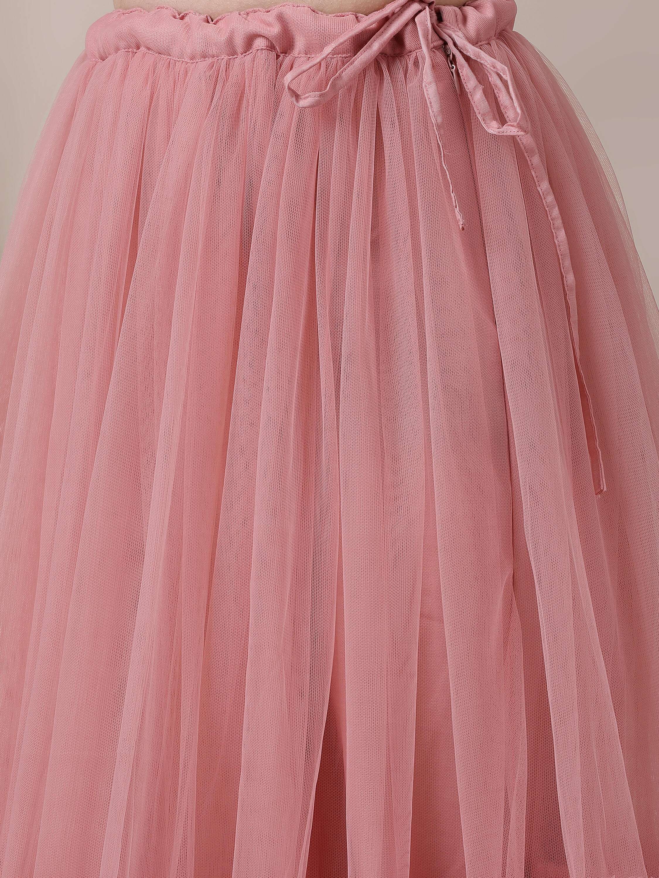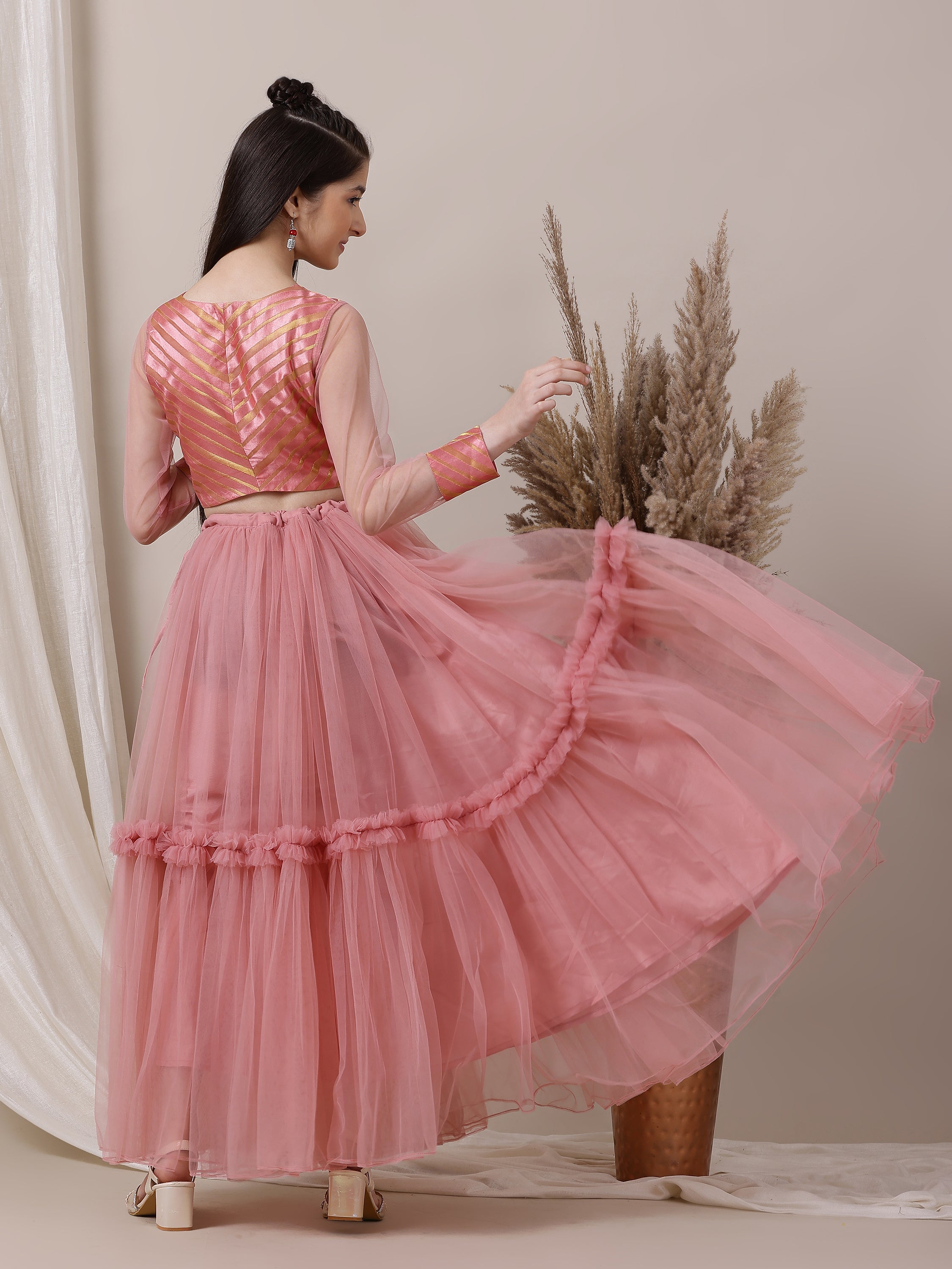 Effortlessly elegant, this pink and gold-toned ready to wear lehenga choli is perfect for any occasion. The woven design adds a touch of sophistication, while the zip closure and flared hem provide both comfort and style. The matching dupatta with a border completes the stunning look.